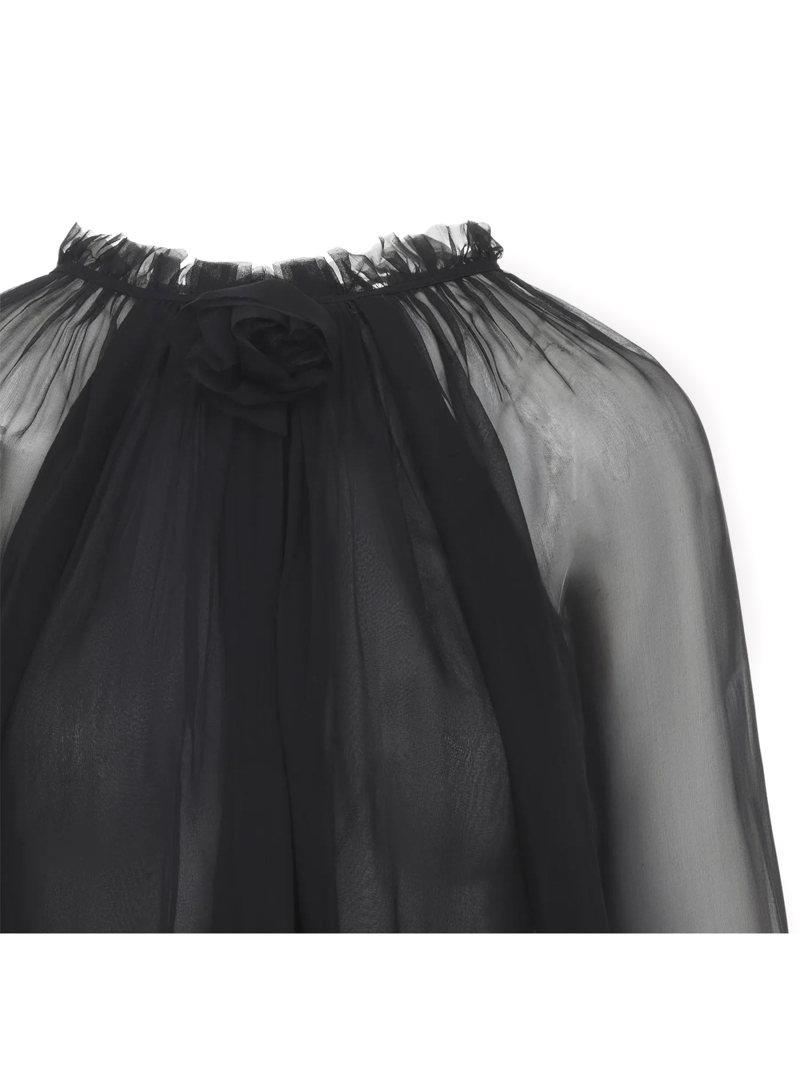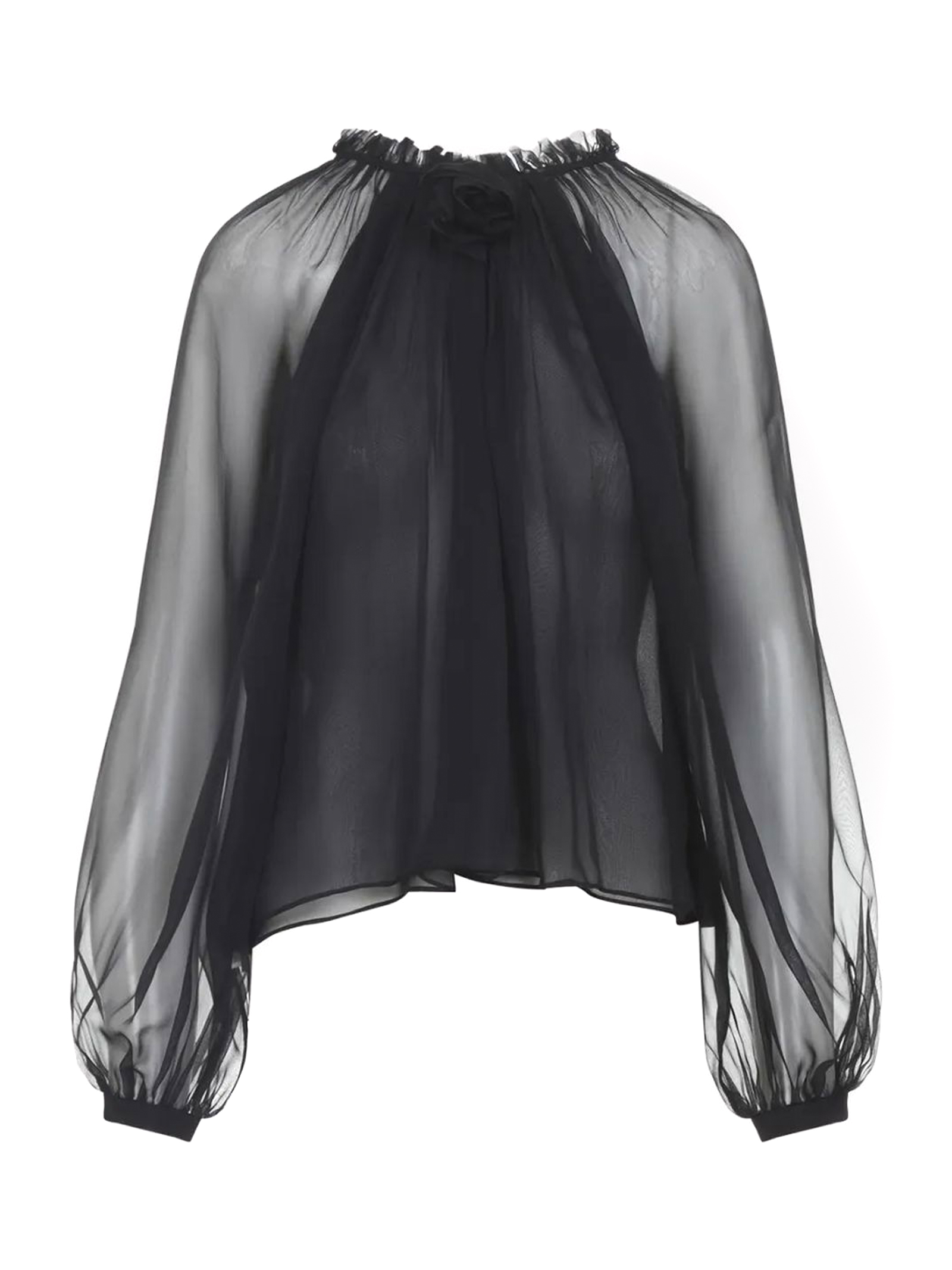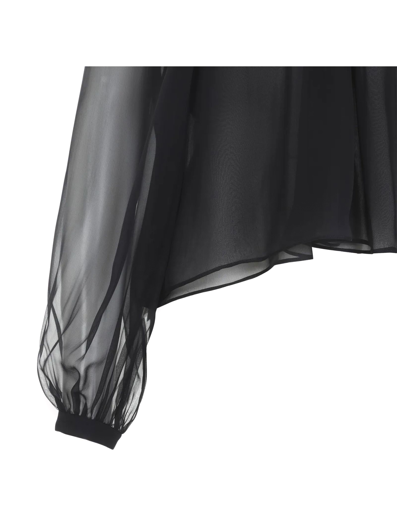 Black Silk Blouse, round neck with frilled detail, back tonal strap fastening, long puffed sleeves, buttoned cuffs, asymmetric hem, transparent details