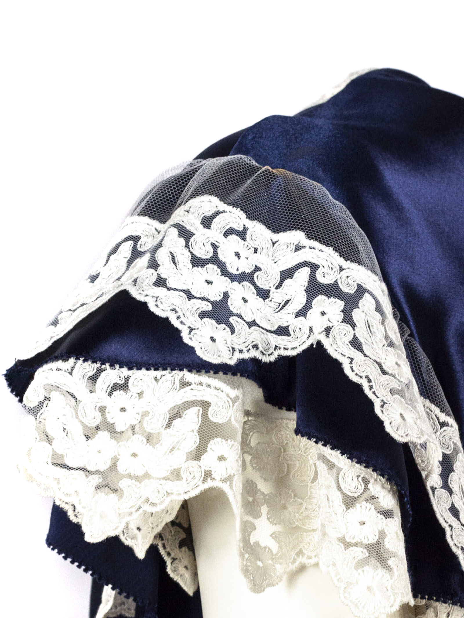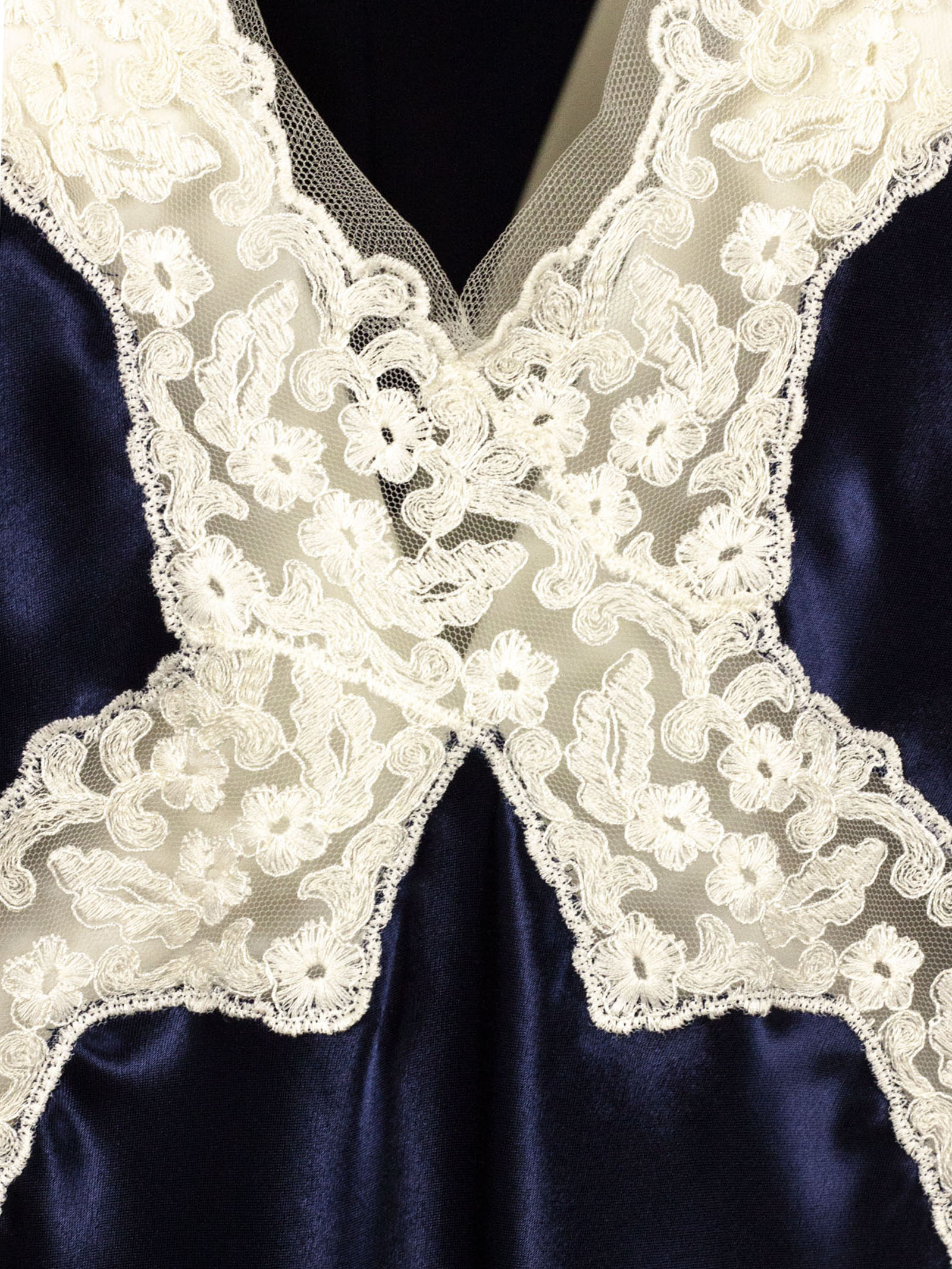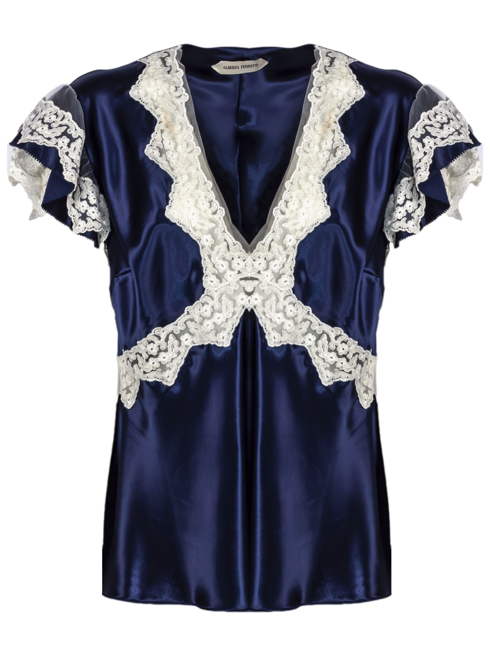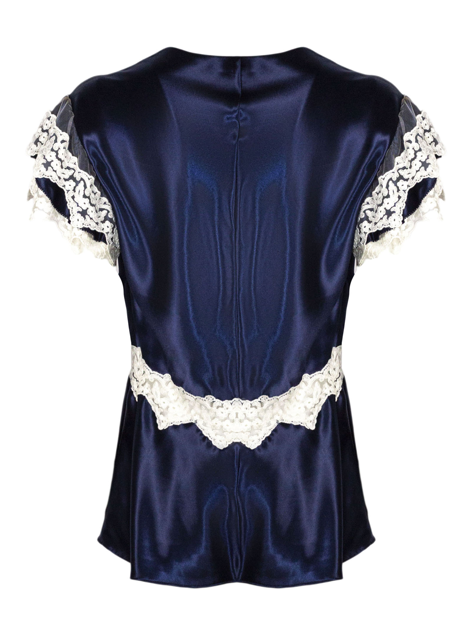 Blue satin top with lace inserts, V-neck and short sleeves
