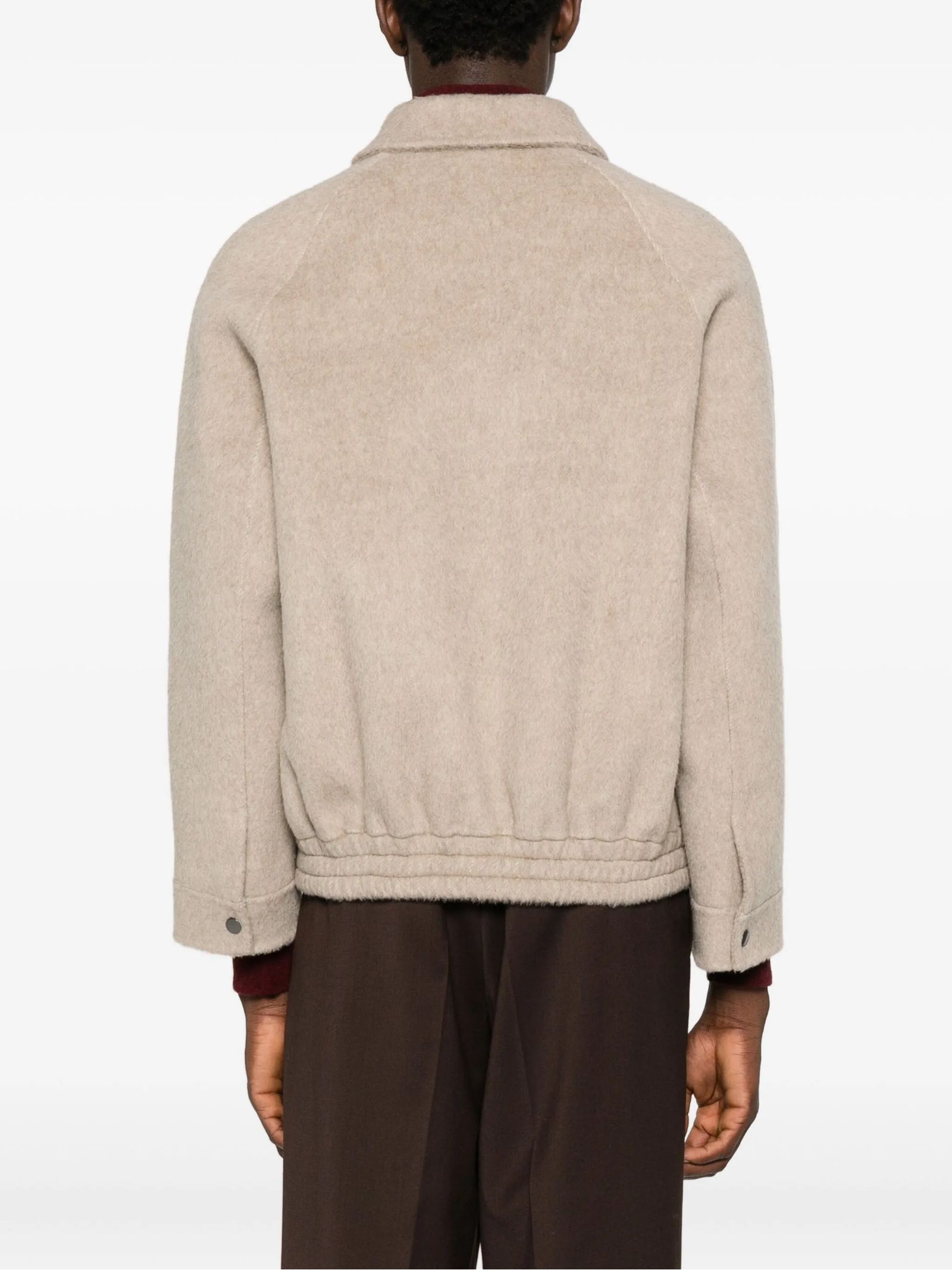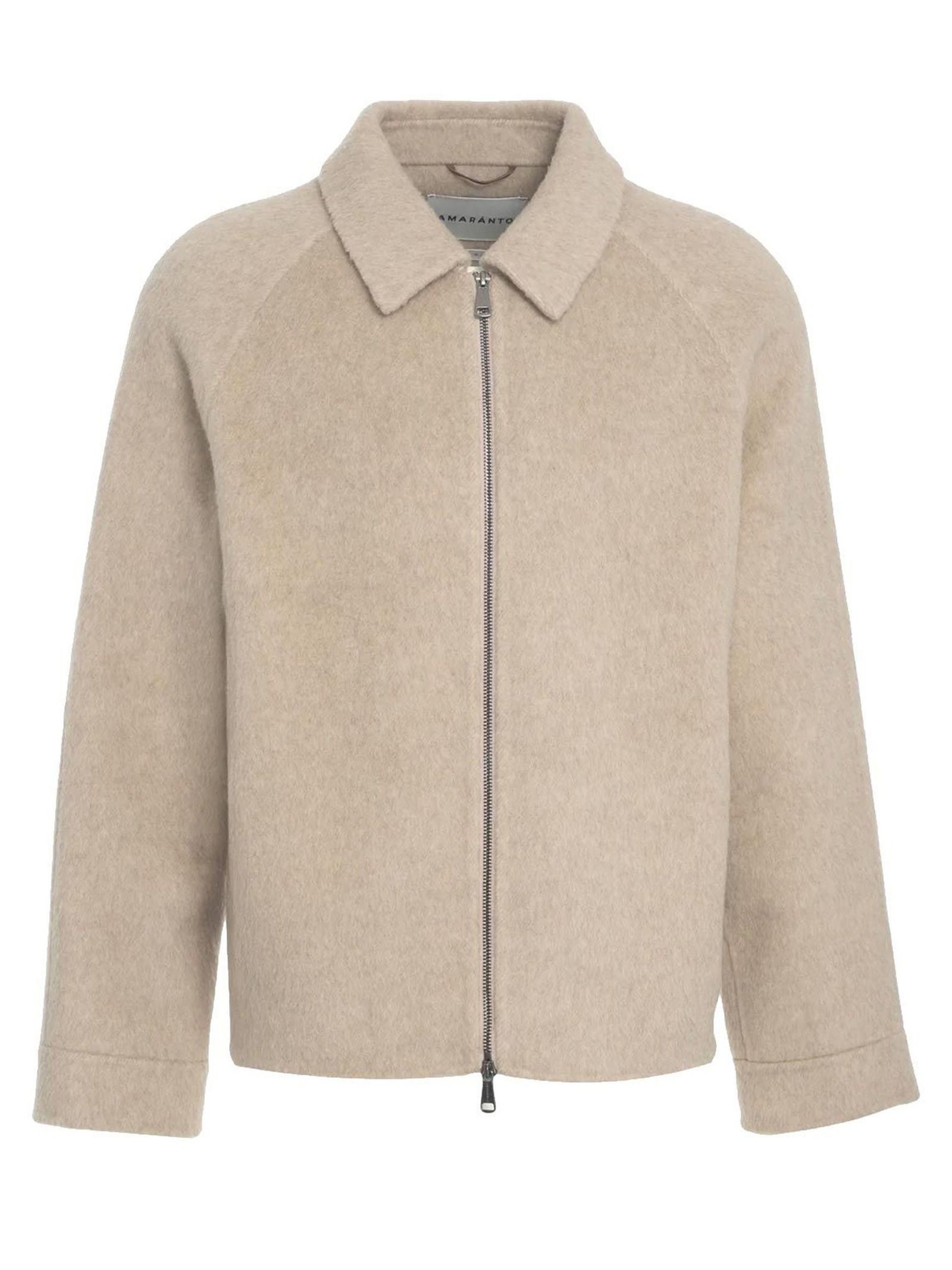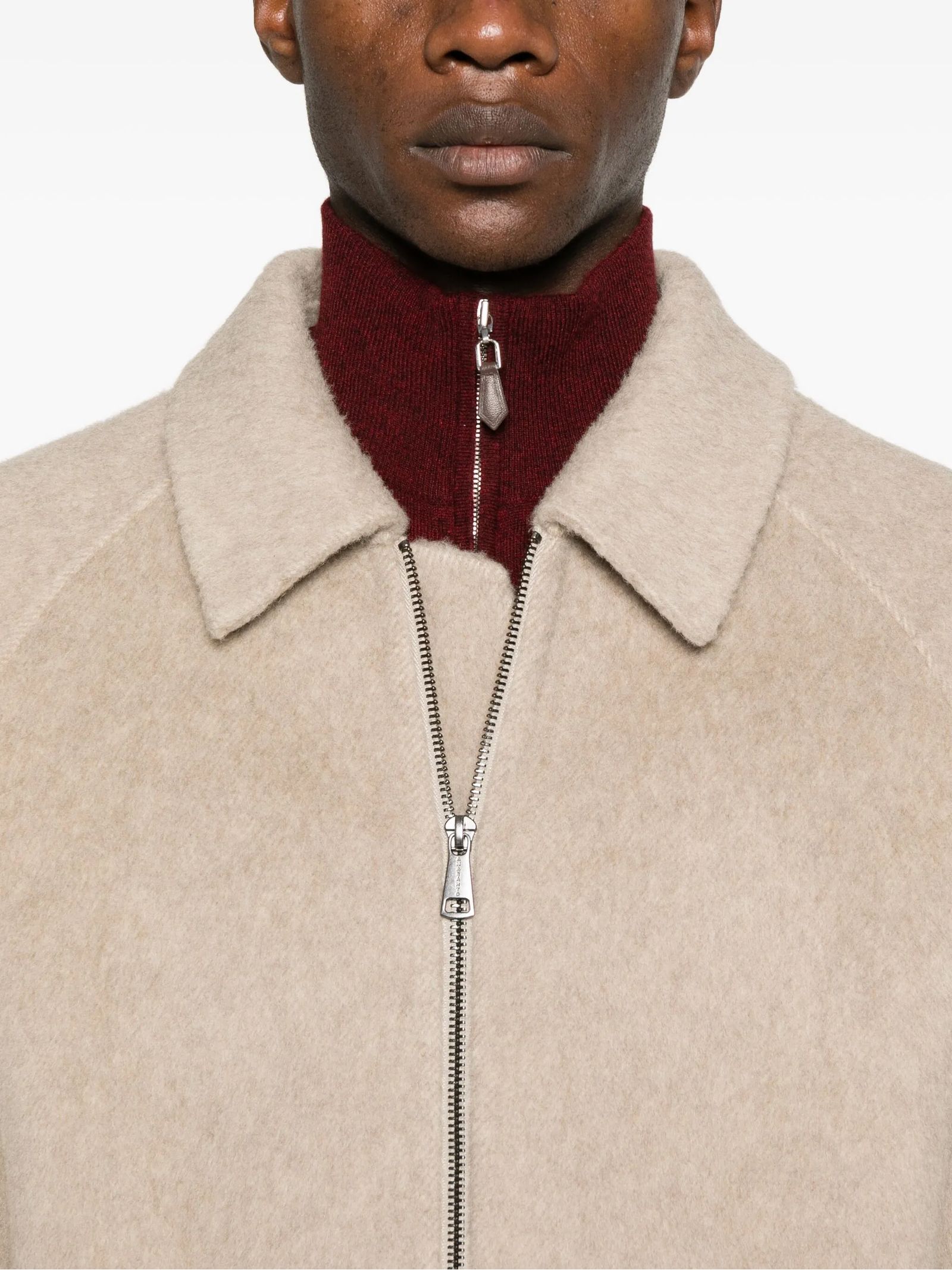 Beige wool and cashmere jacket featuring zip fastening, point collar, front pockets, ribbed hem, long sleeves
