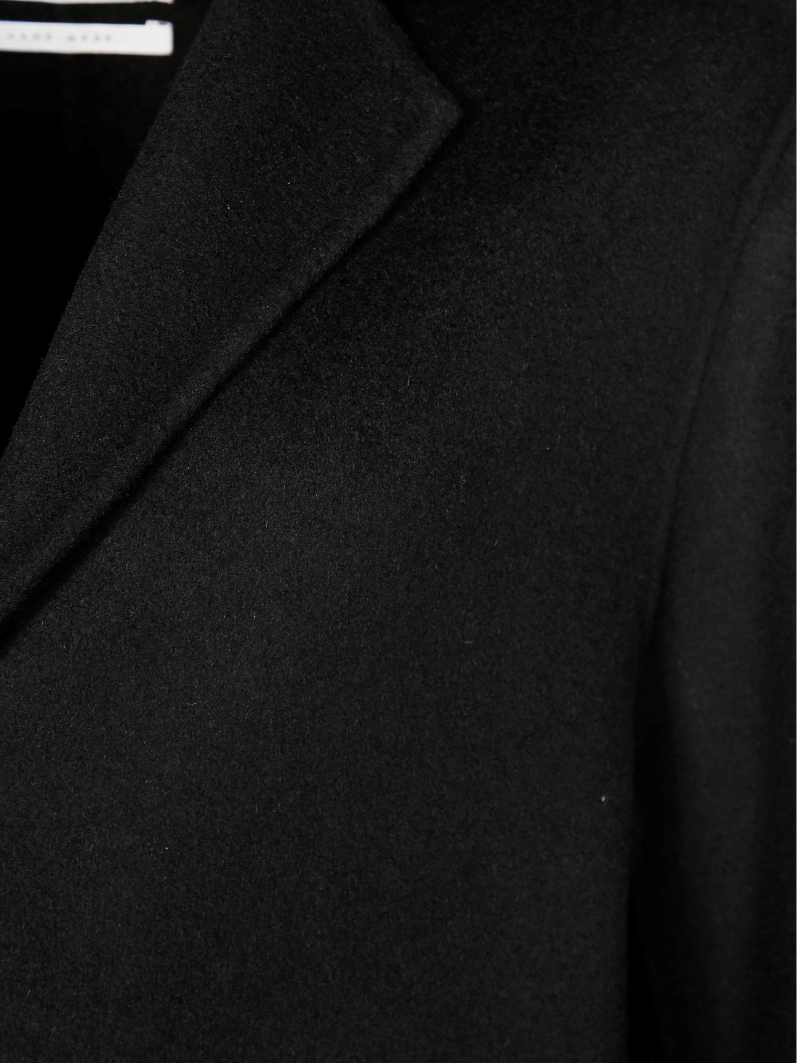 Black wool and cashmere single-breasted coat, front button fastening, notched lapels, side slit pockets, long sleeves