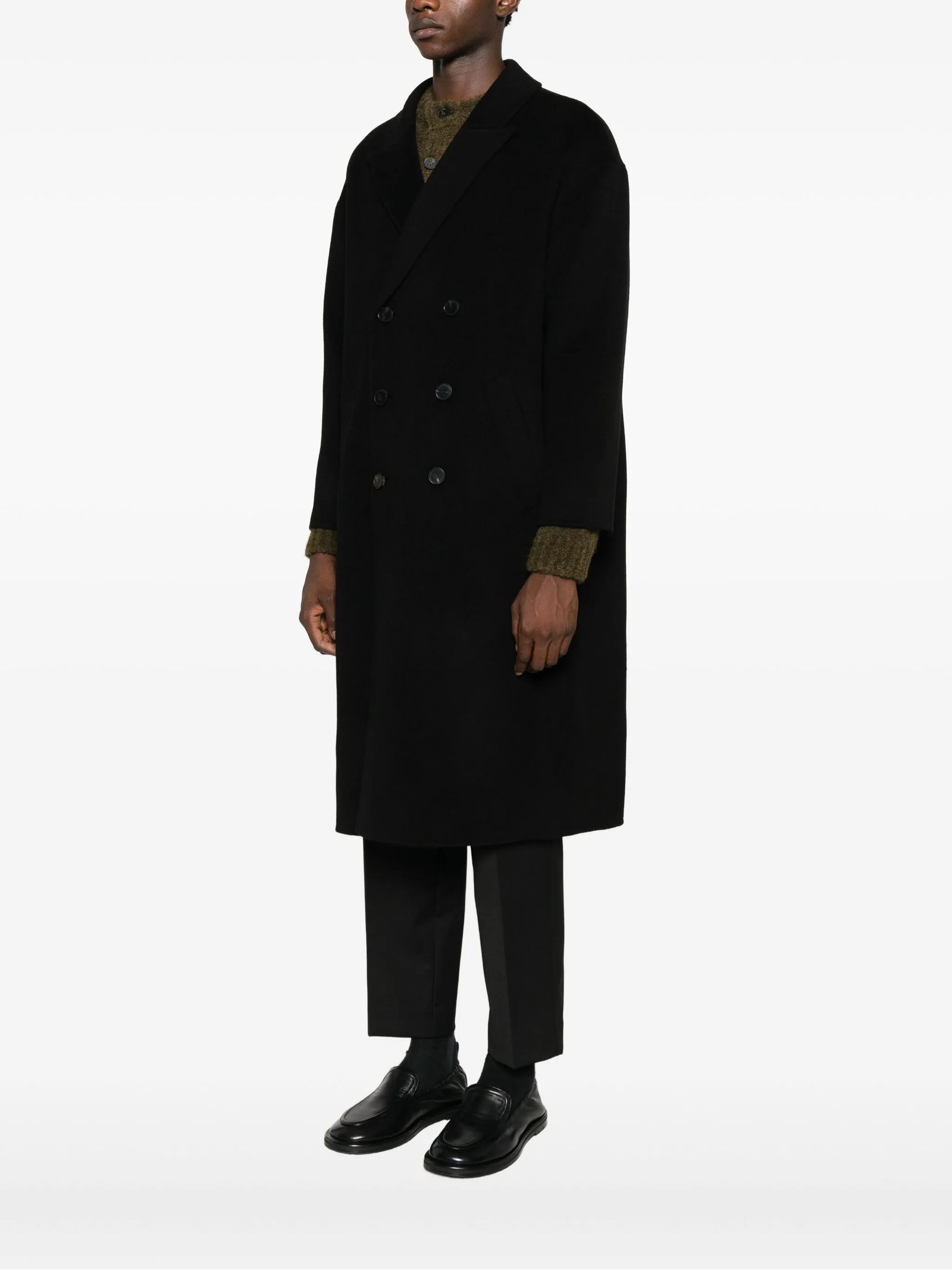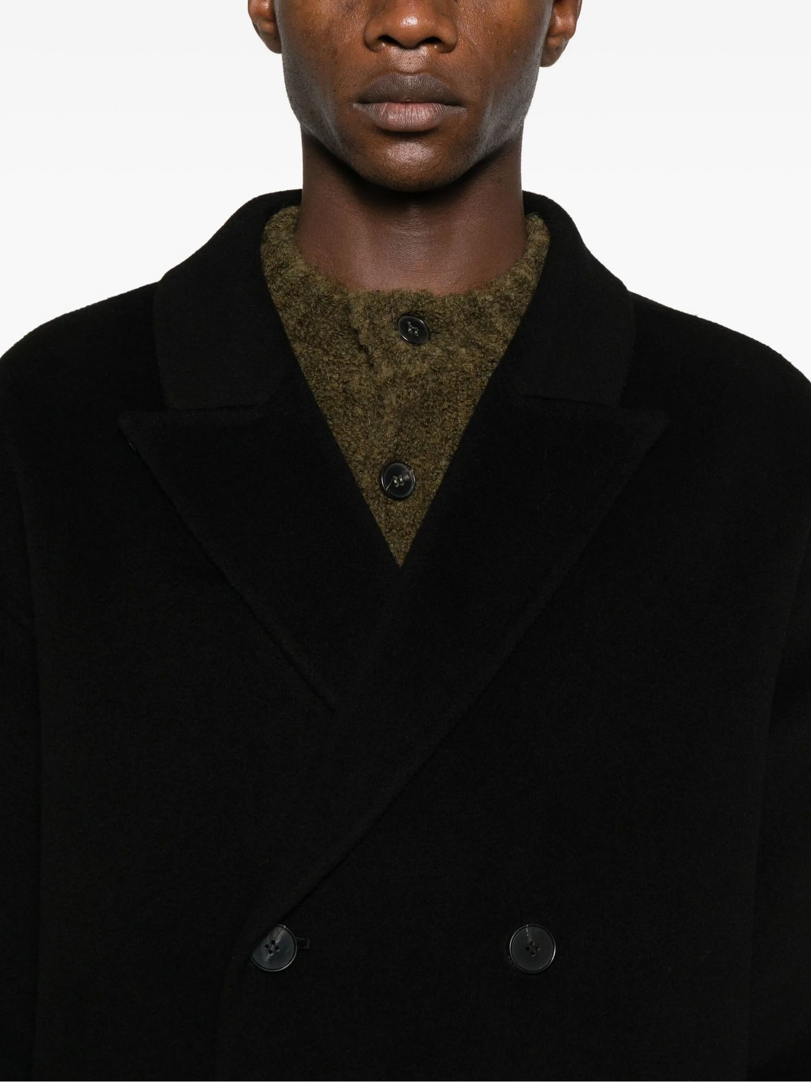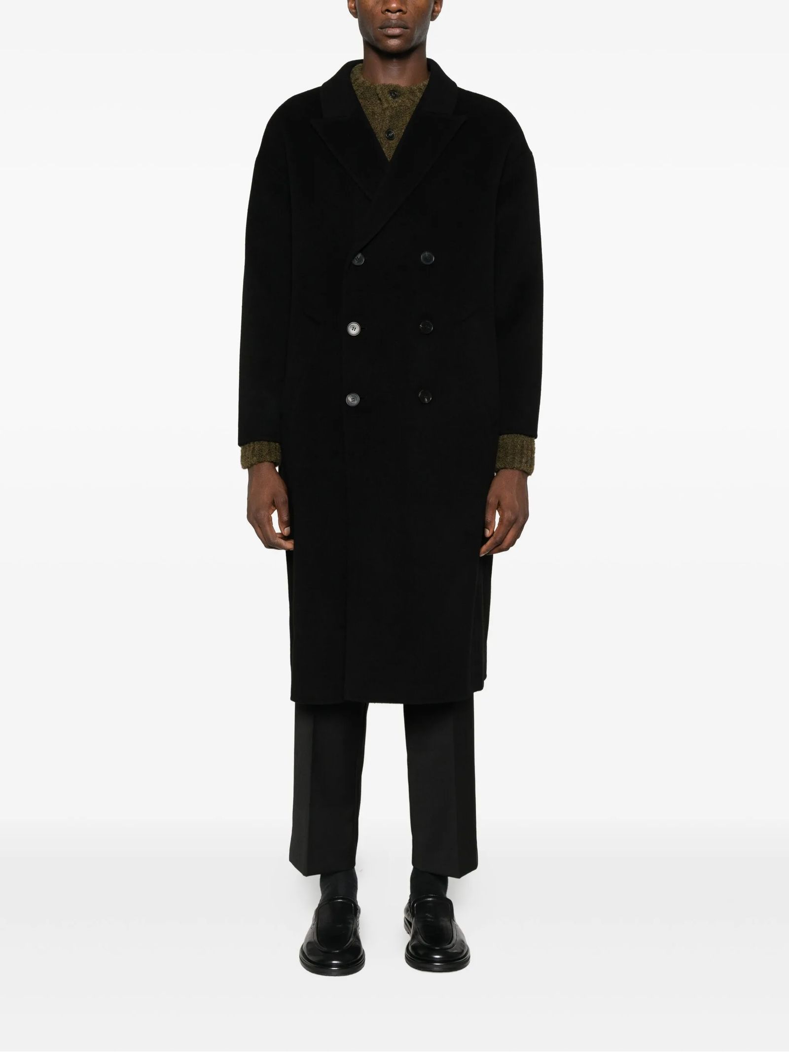 Black wool and cashmere double-breasted coat, front button fastening, notched lapels, side slit pockets, long sleeves