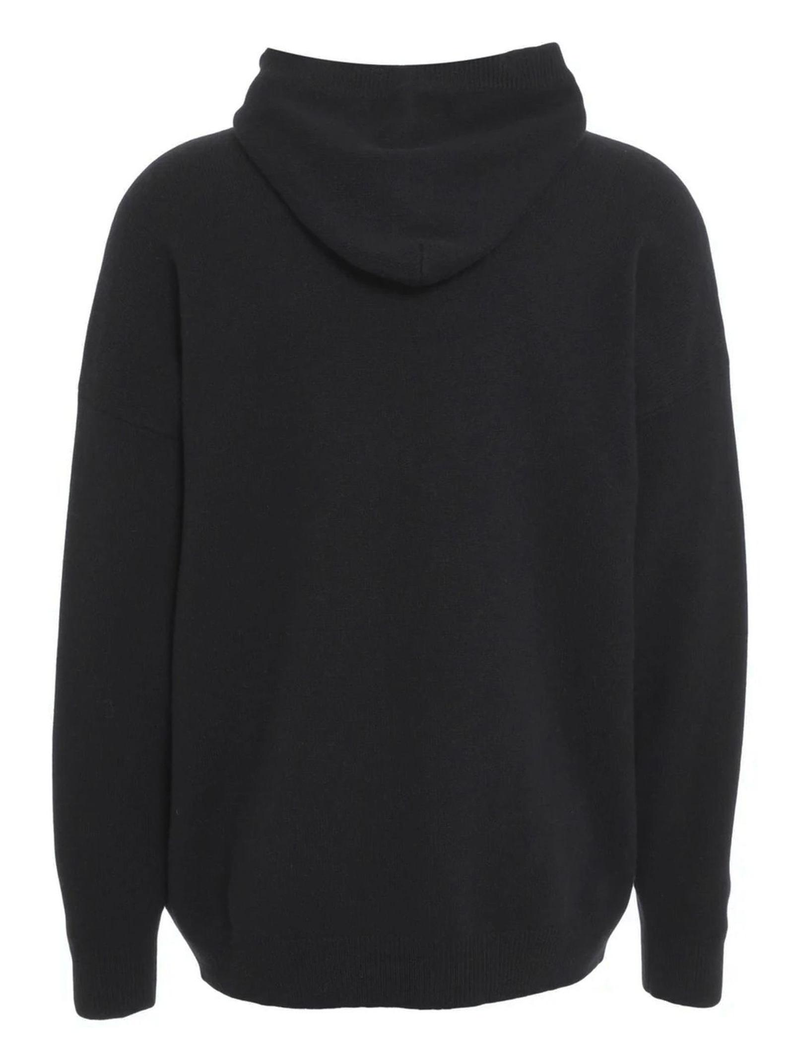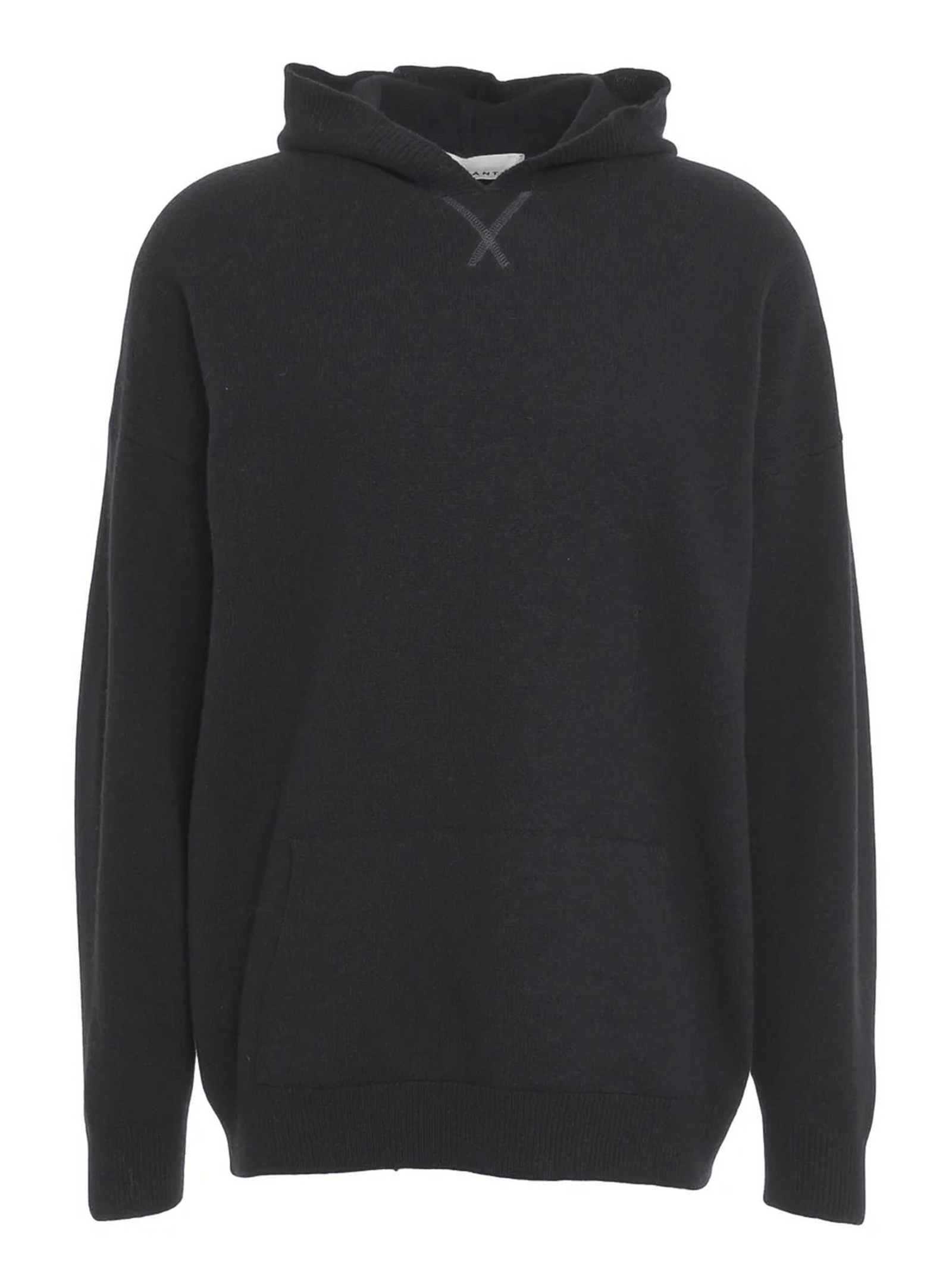 Black wool jumper with hood, kangaroo pocket, ribbed cuffs, ribbed hem, long sleeves, oversized fit