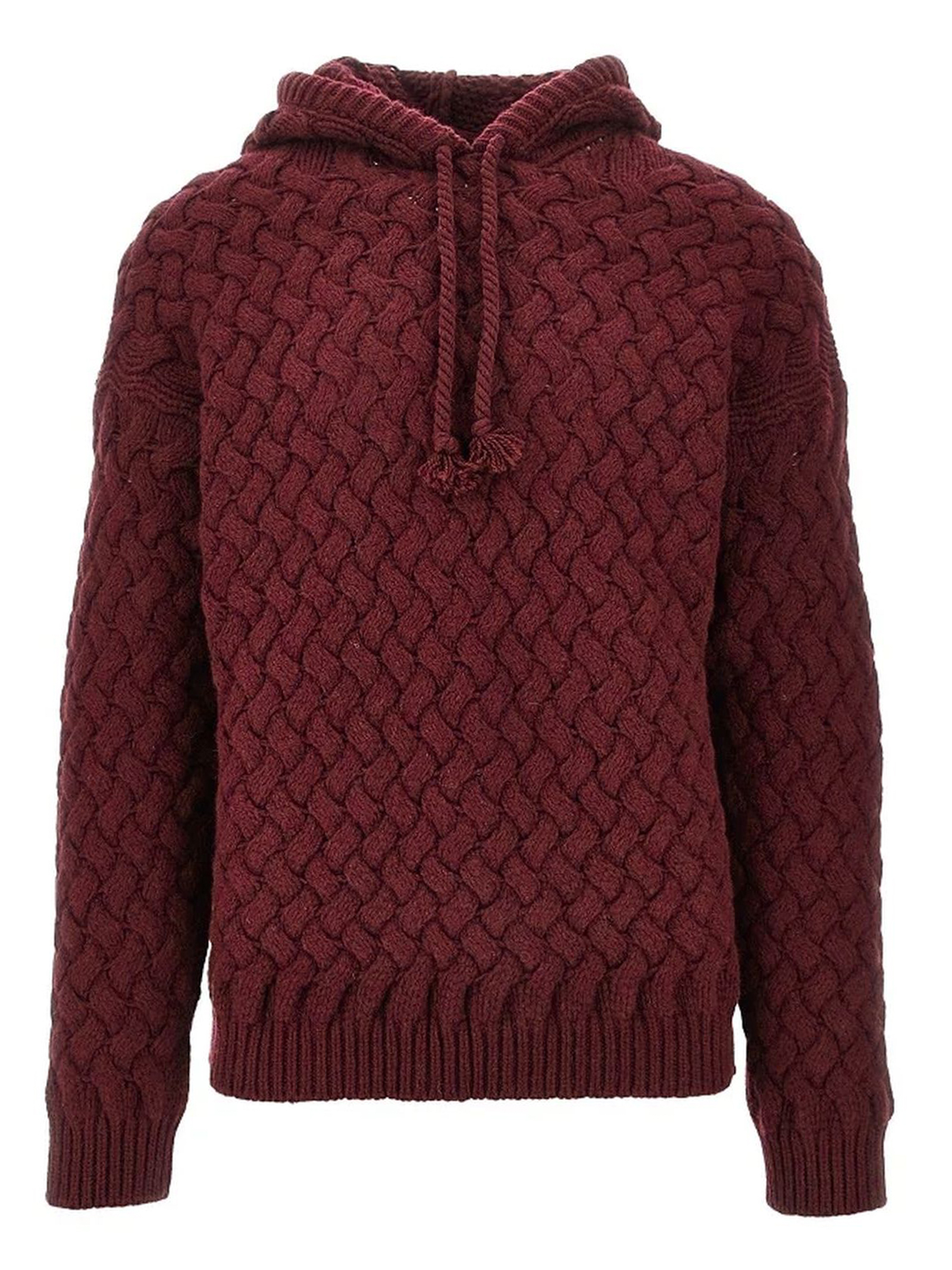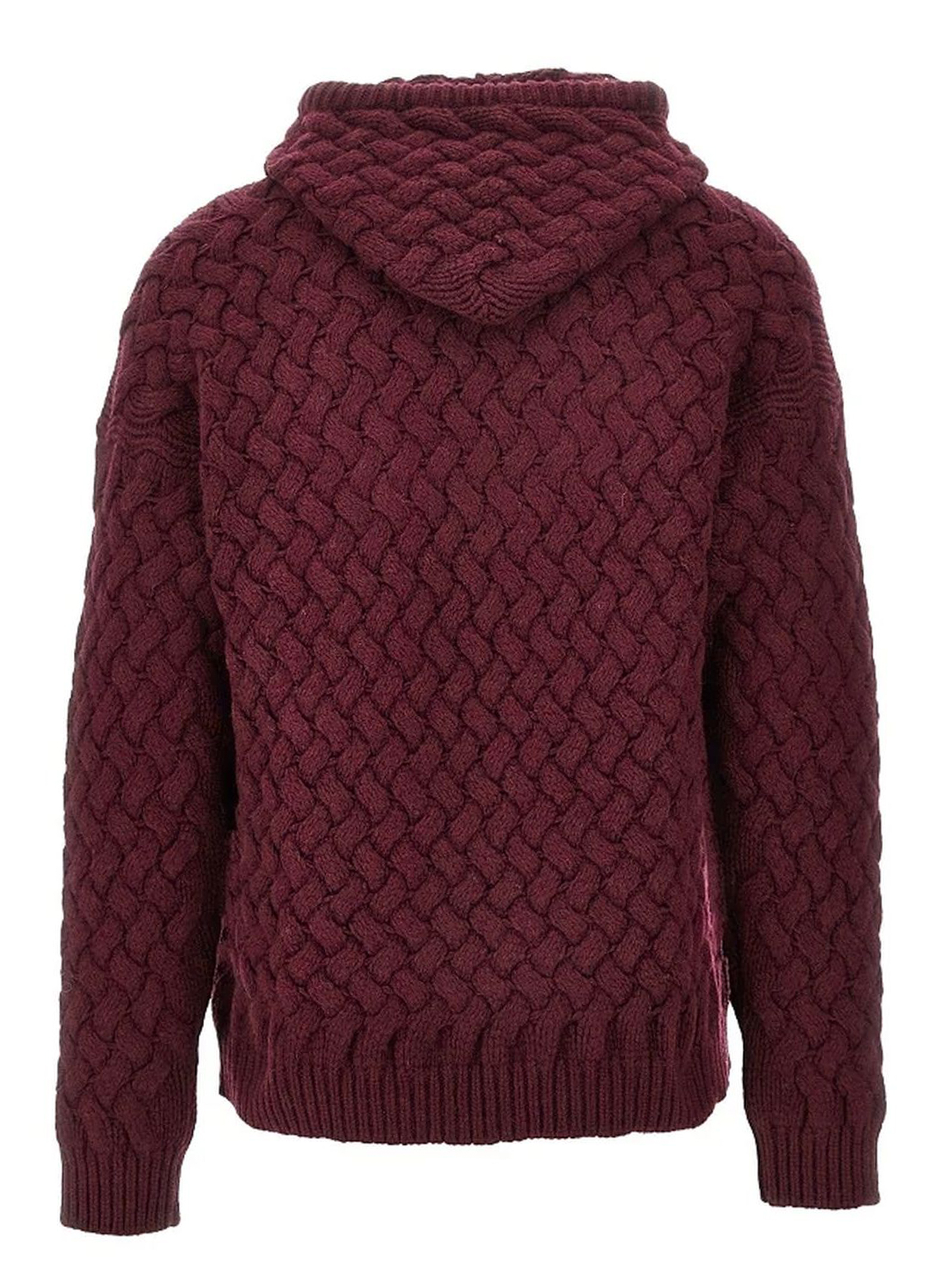 Bordeaux wool and cashmere blend jumper with hood, cable knit pattern, ribbed cuffs and ribbed hem