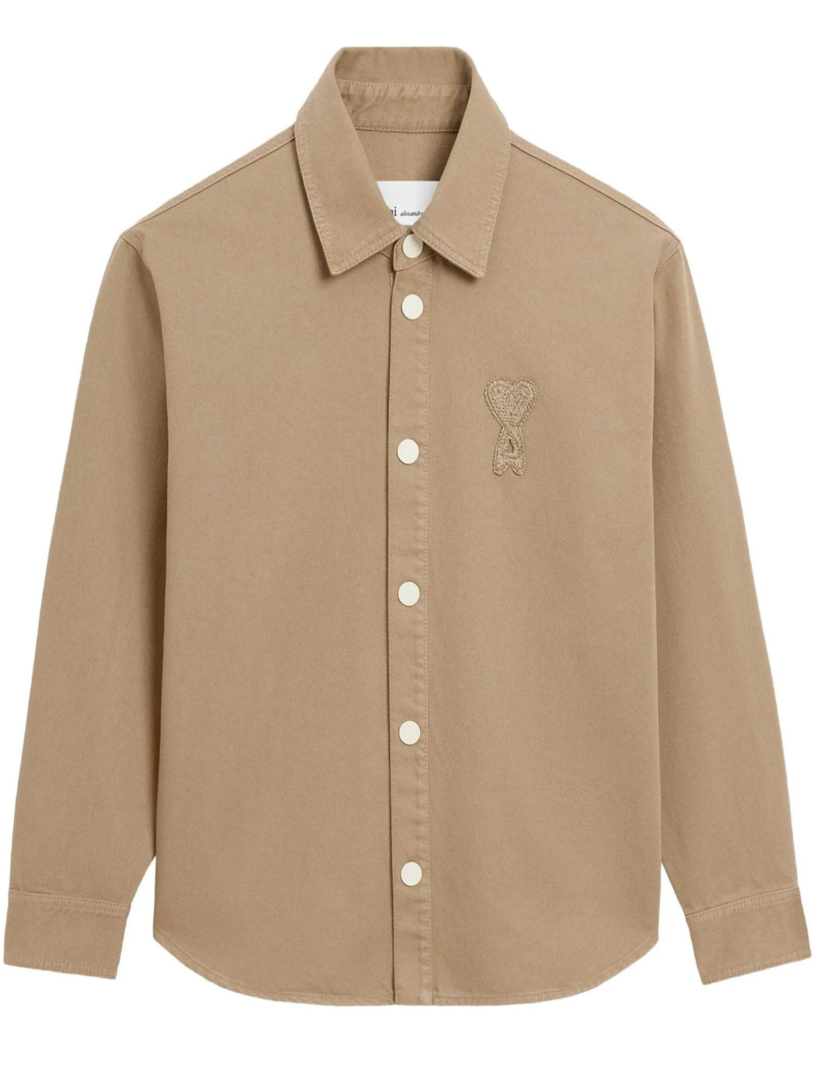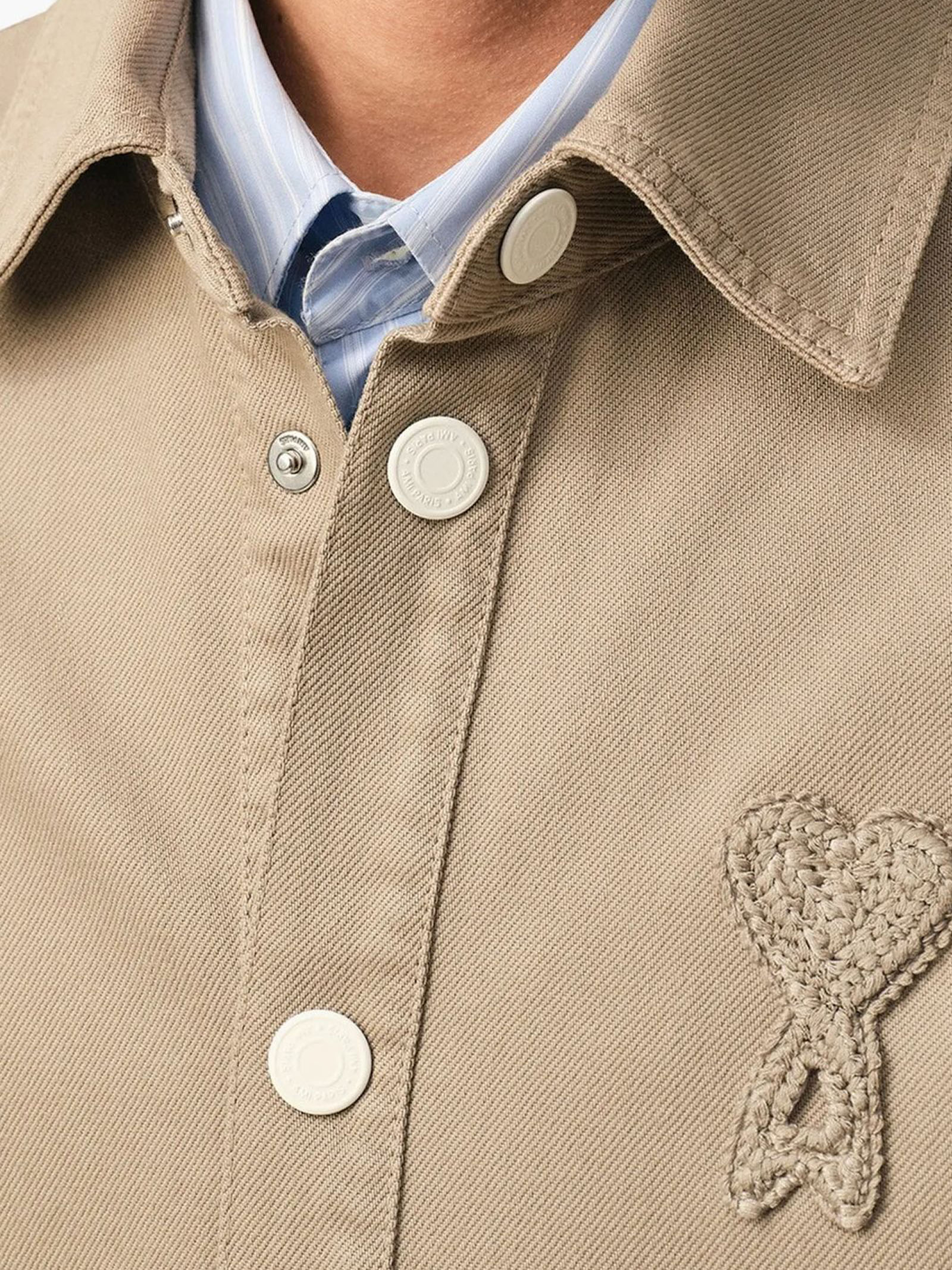 Beige cotton knit shirt jacket, white denim-style snap buttons, off-white crocheted Ami de Coeur appliqué on the chest, tone-on-tone topstitching