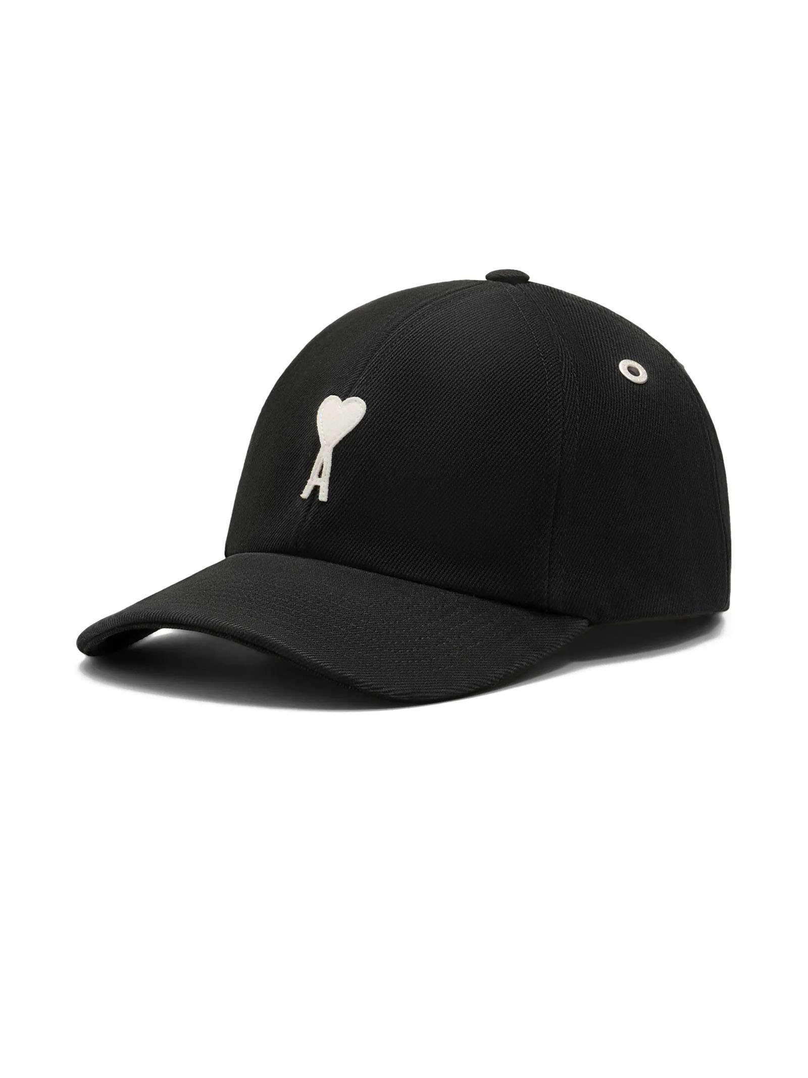 Black cotton baseball cap with logo patch and adjustable strap with buckle