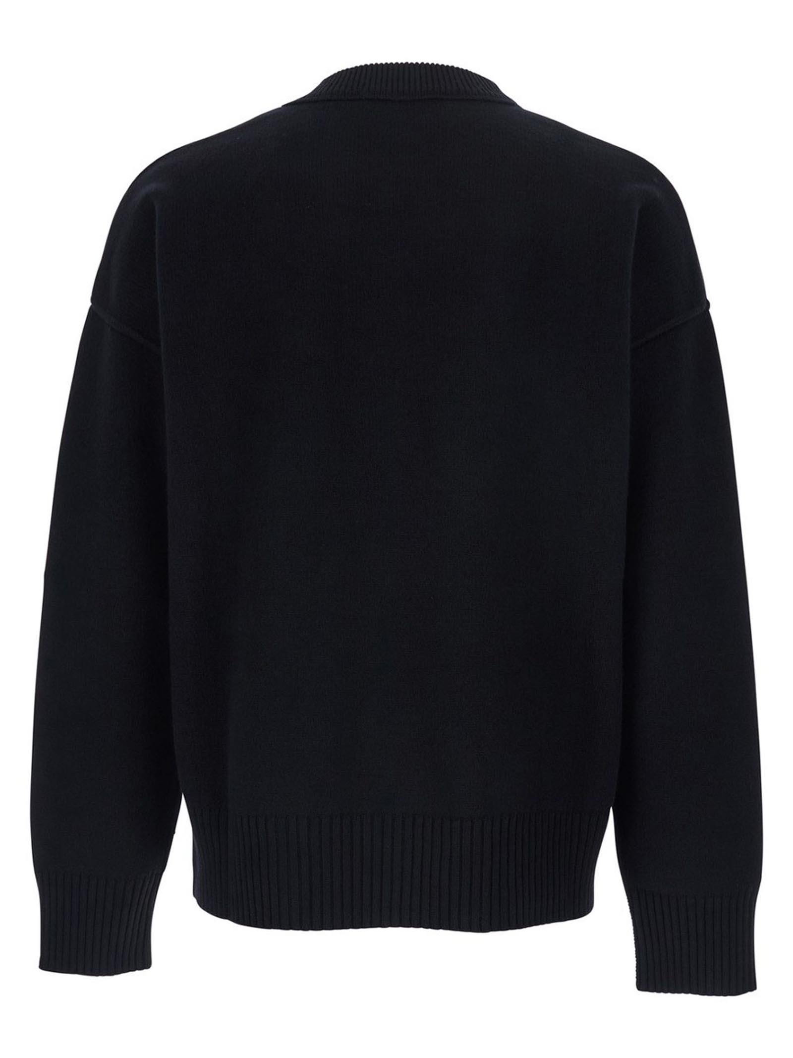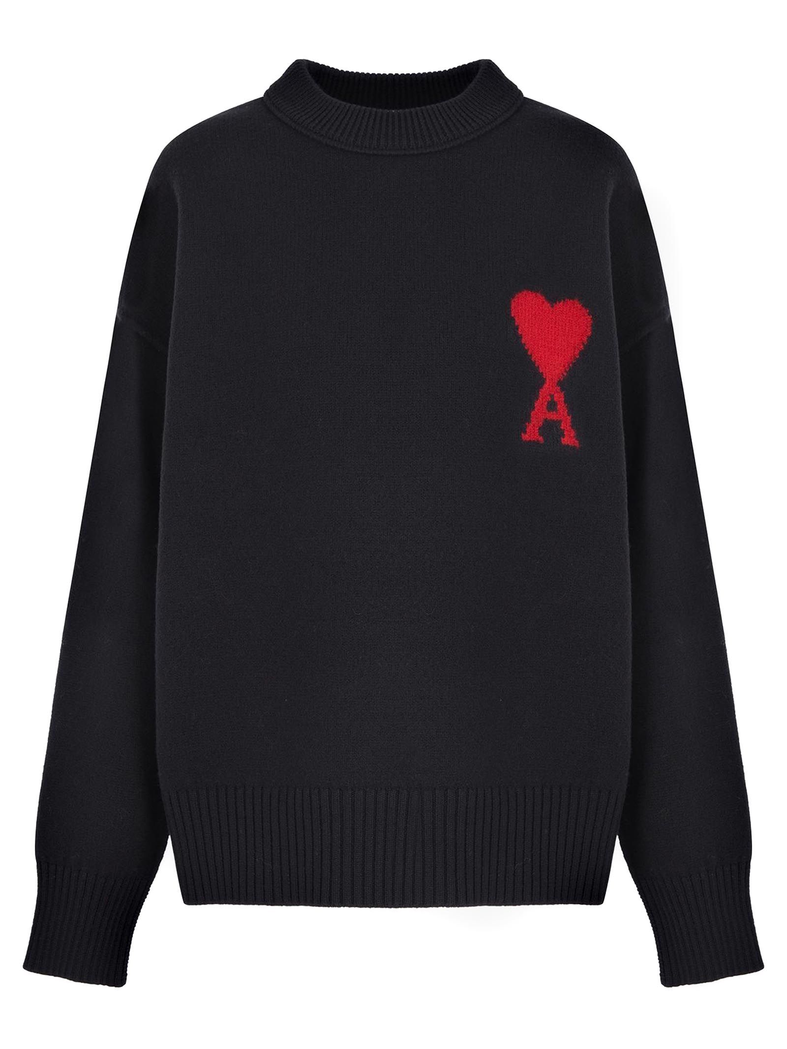 Black wool sweater with crew neck, heart motif, long sleeves, ribbed trim