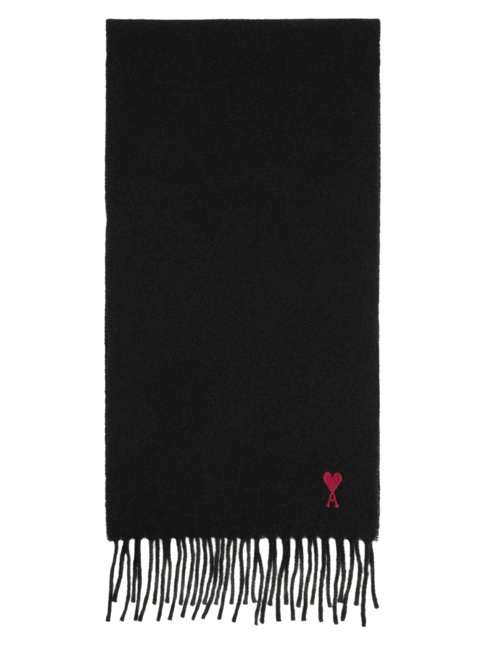 Classic black wool scarf with fringes, red Ami de Cur appliqué, fringe length 10 cm per end, dimensions excluding fringes: 25 x 190 cm