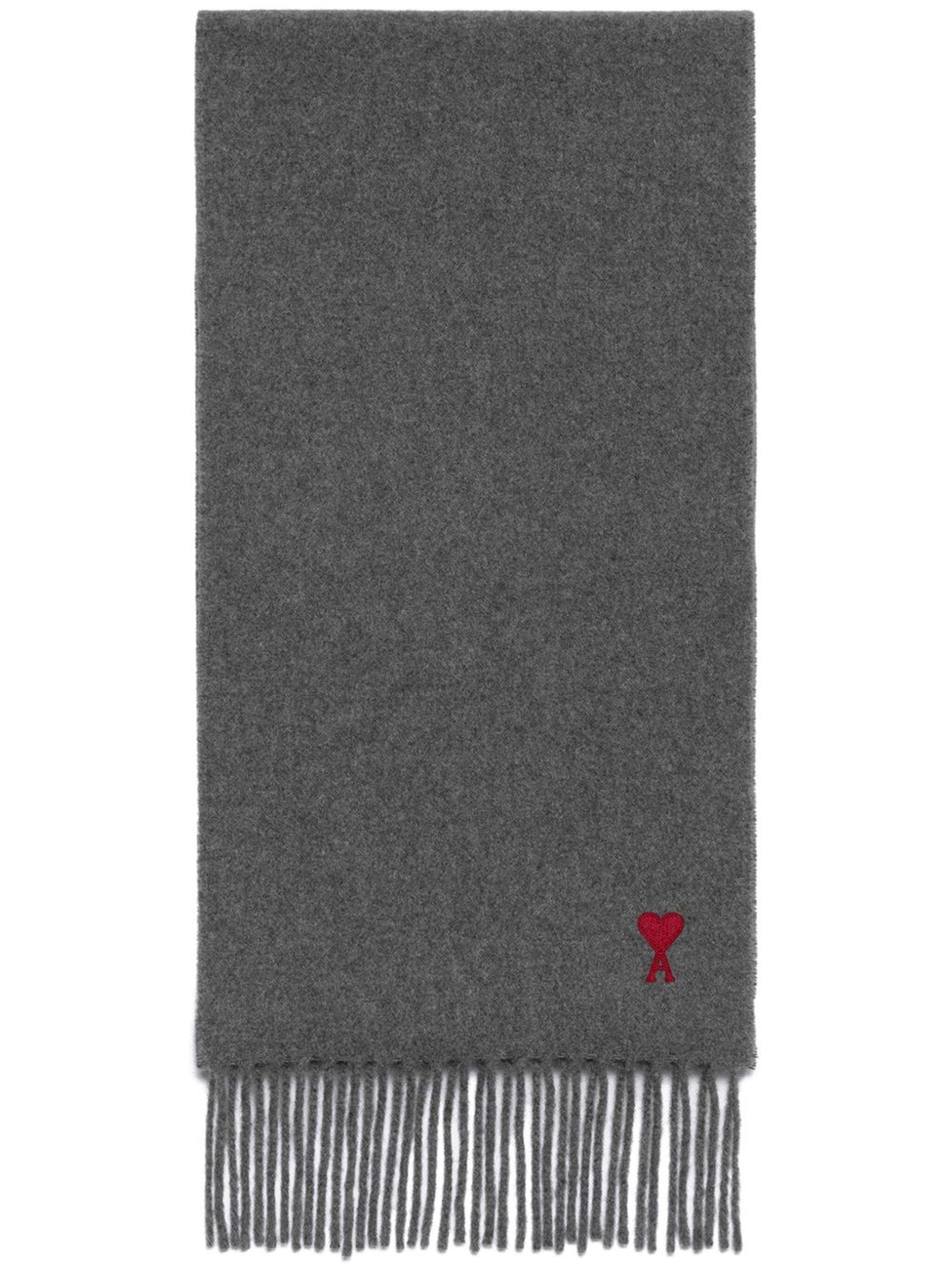 Classic grey wool scarf with fringes, red Ami de Cur appliqué, fringe length 10 cm per end, dimensions excluding fringes: 25 x 190 cm