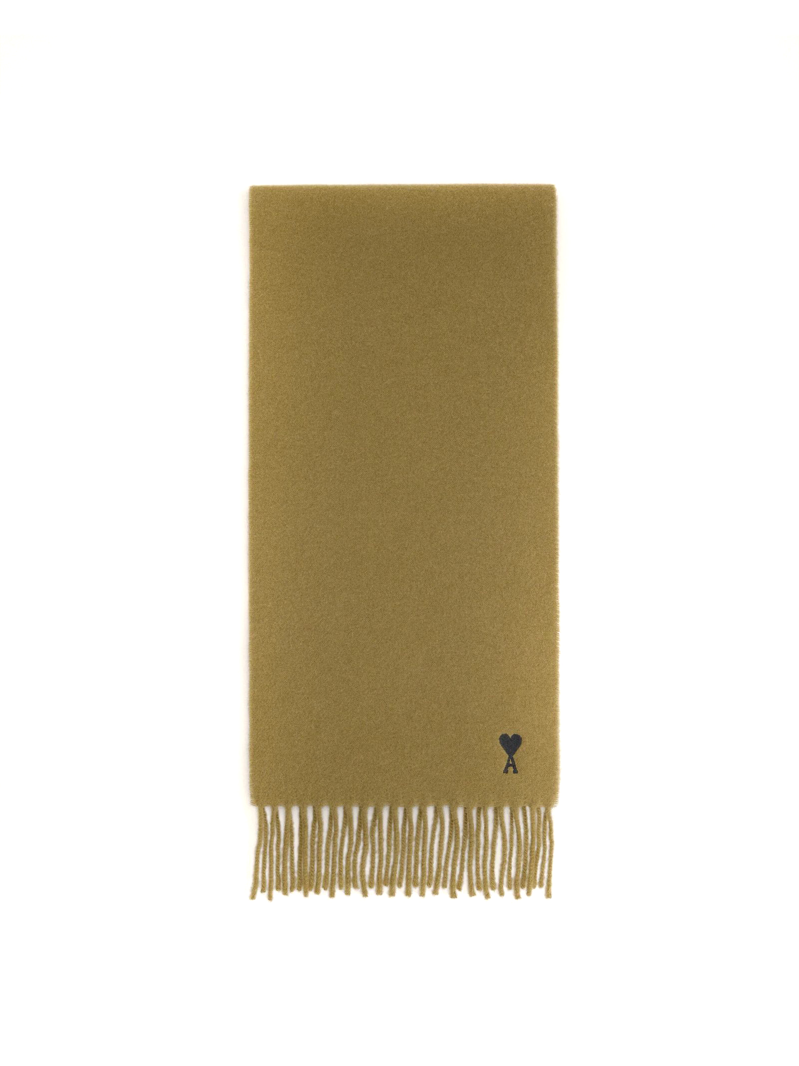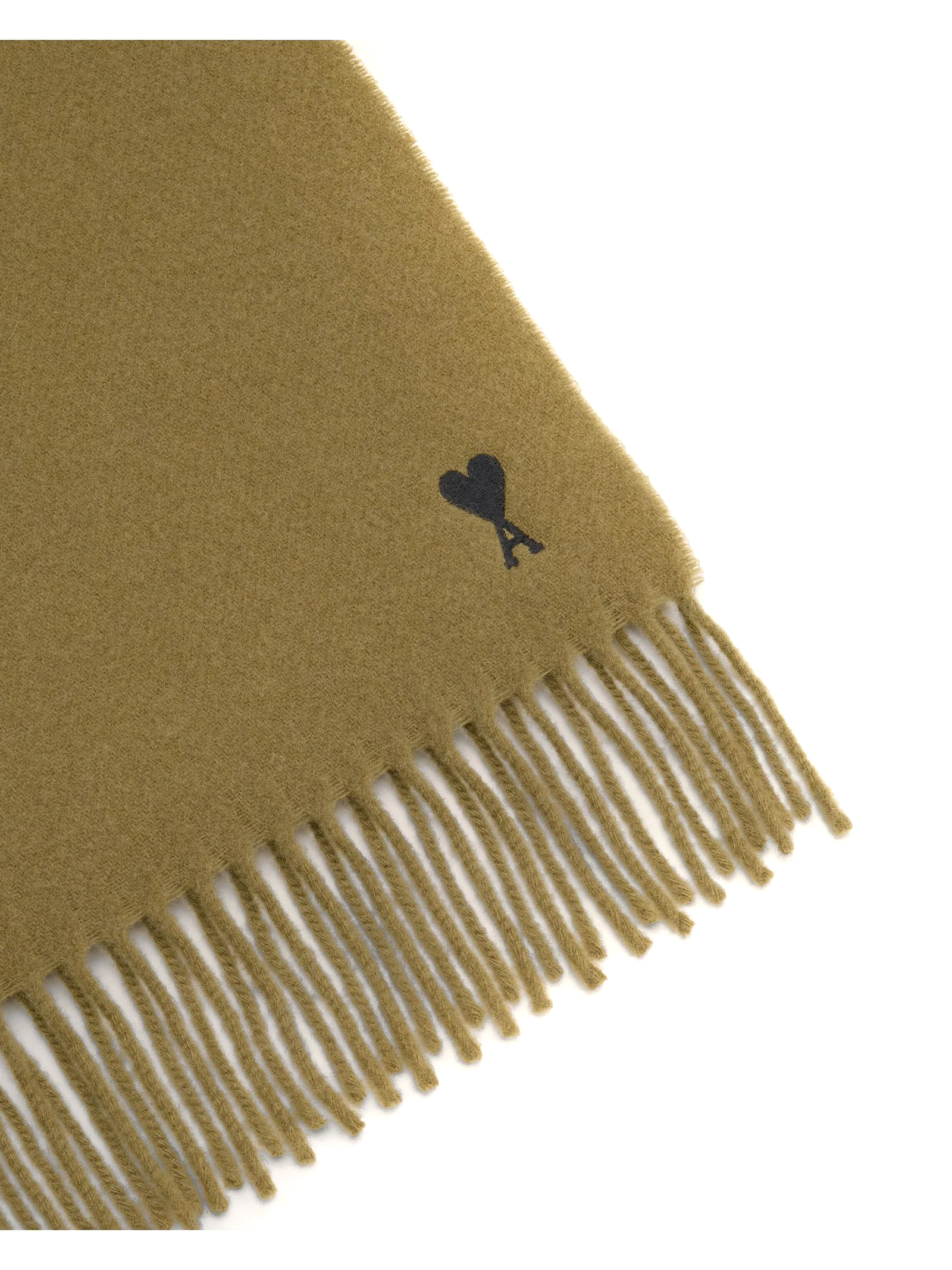 Green wool scarf with fringes, embroidered logo, frayed edges, rectangular shape, L 190 cm x H 25 cm