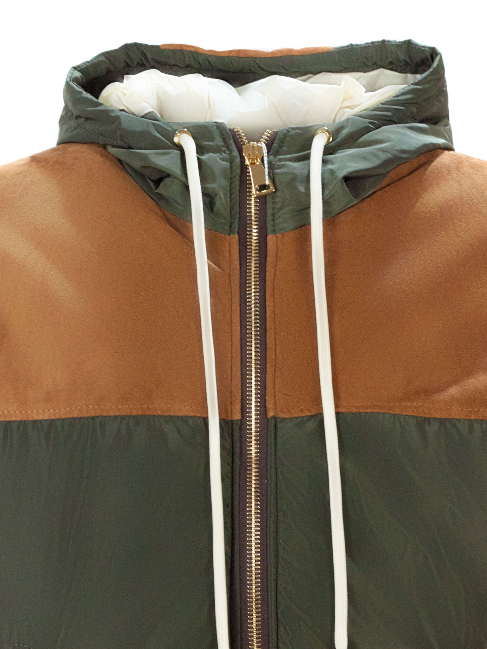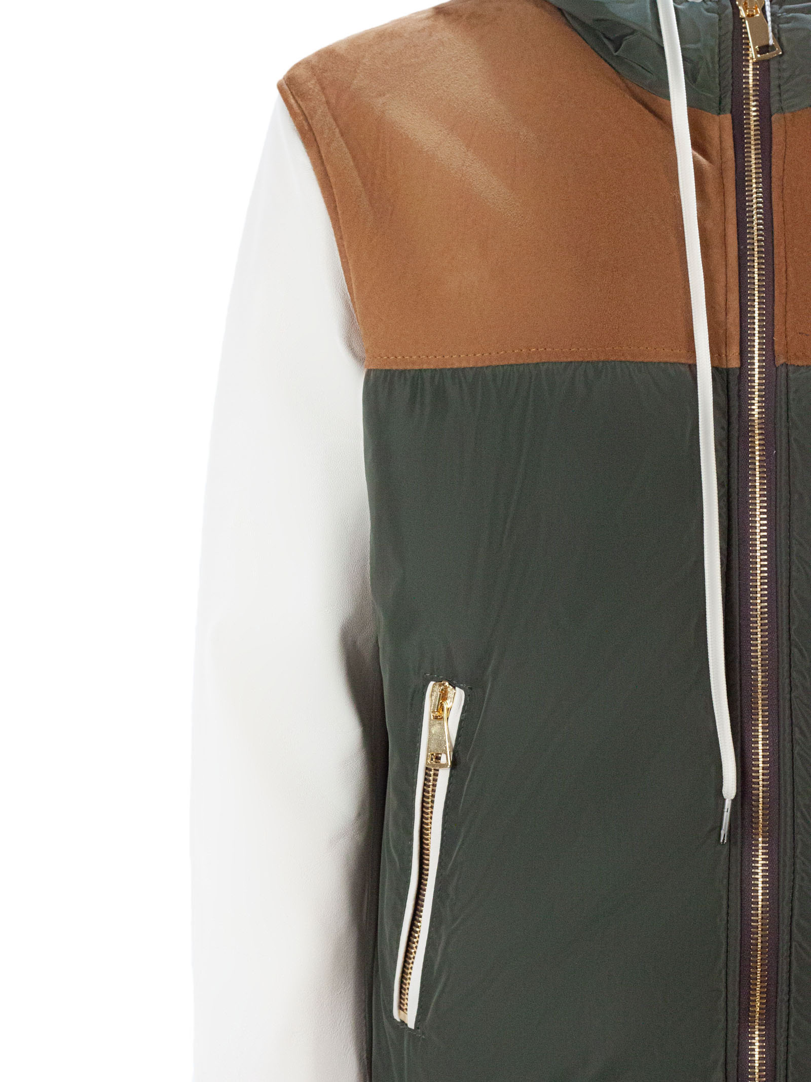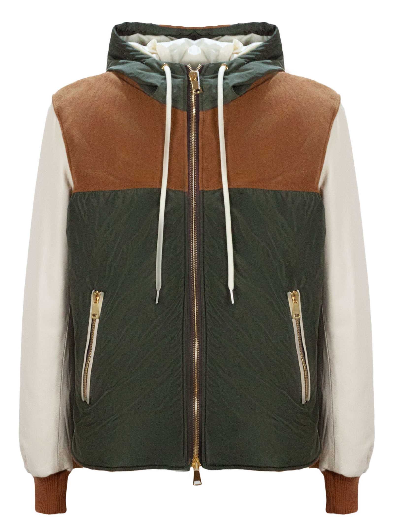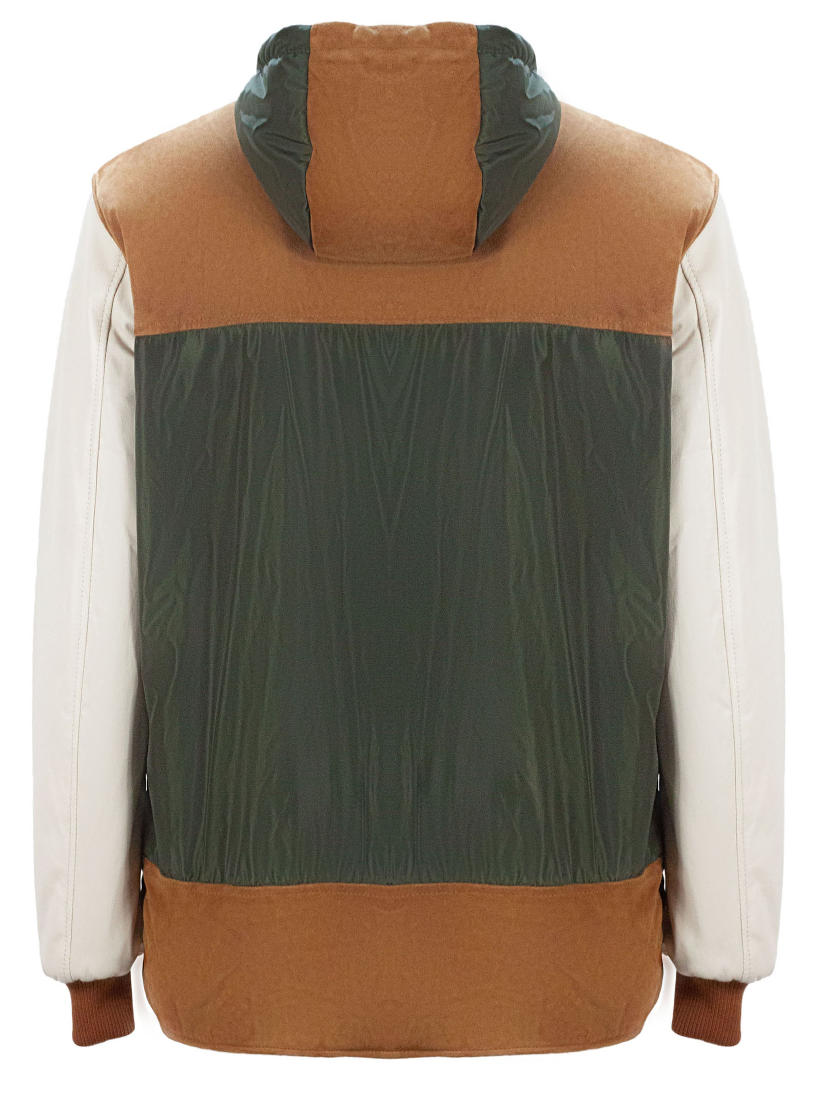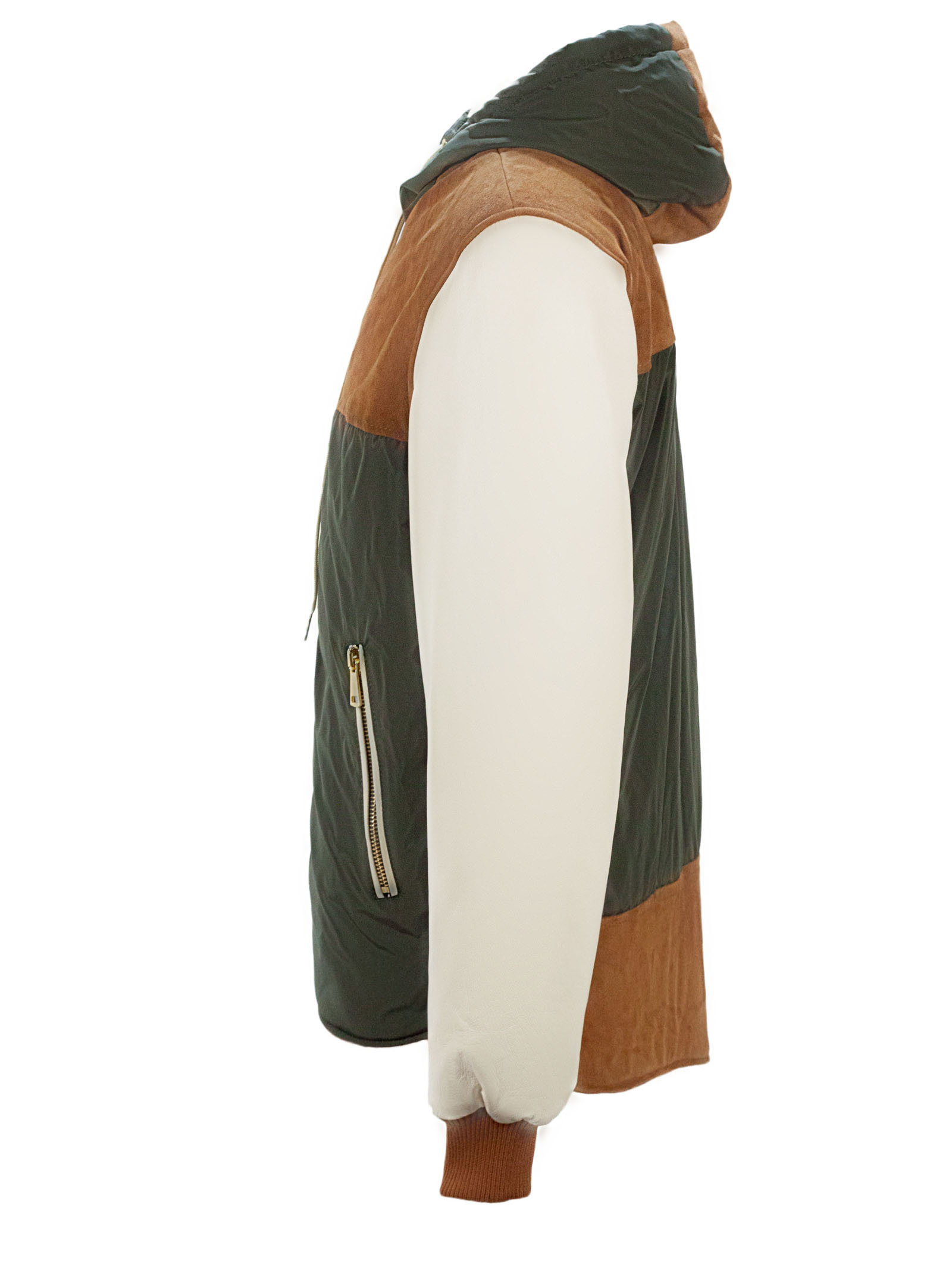 Brown leather and green fabric jacket with hood and drawstring, zip fastening, side zip pockets, elasticated cuffs, suede detail, long sleeves in off-white leather