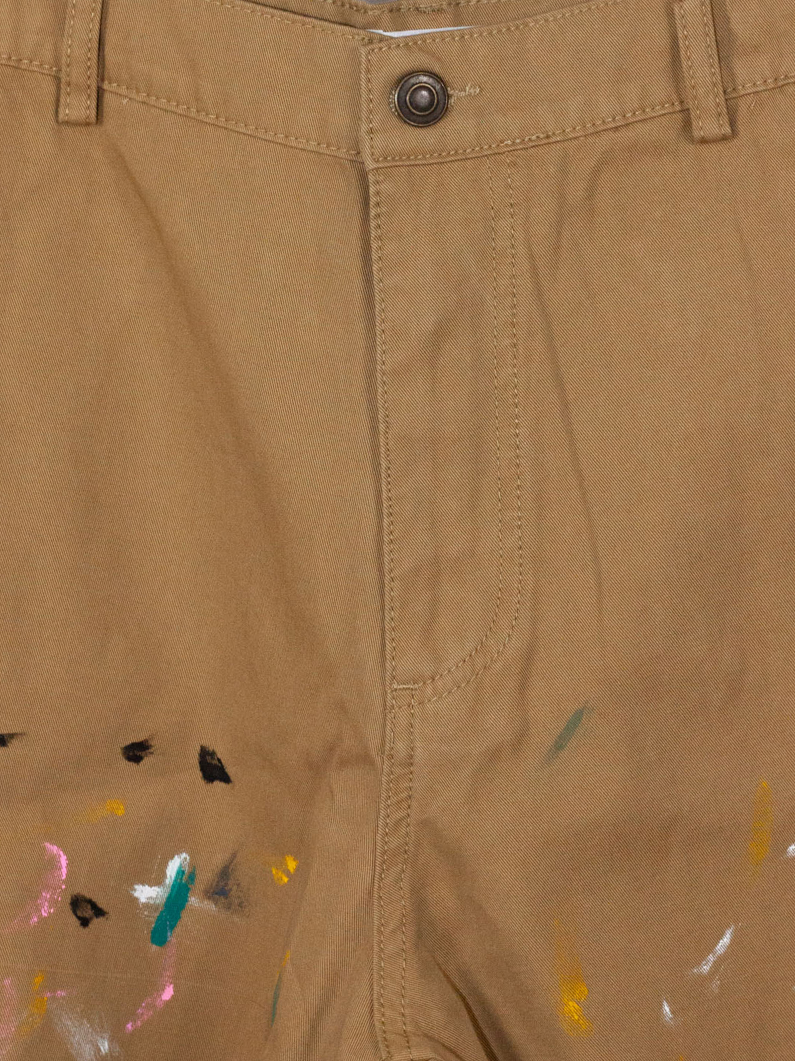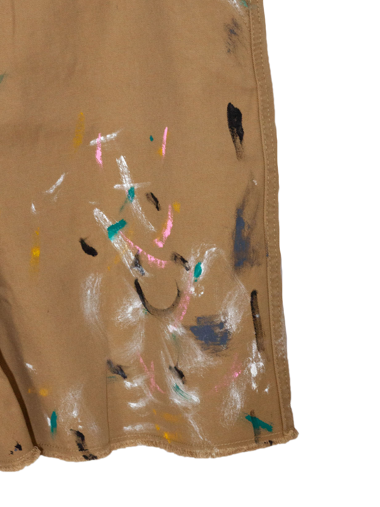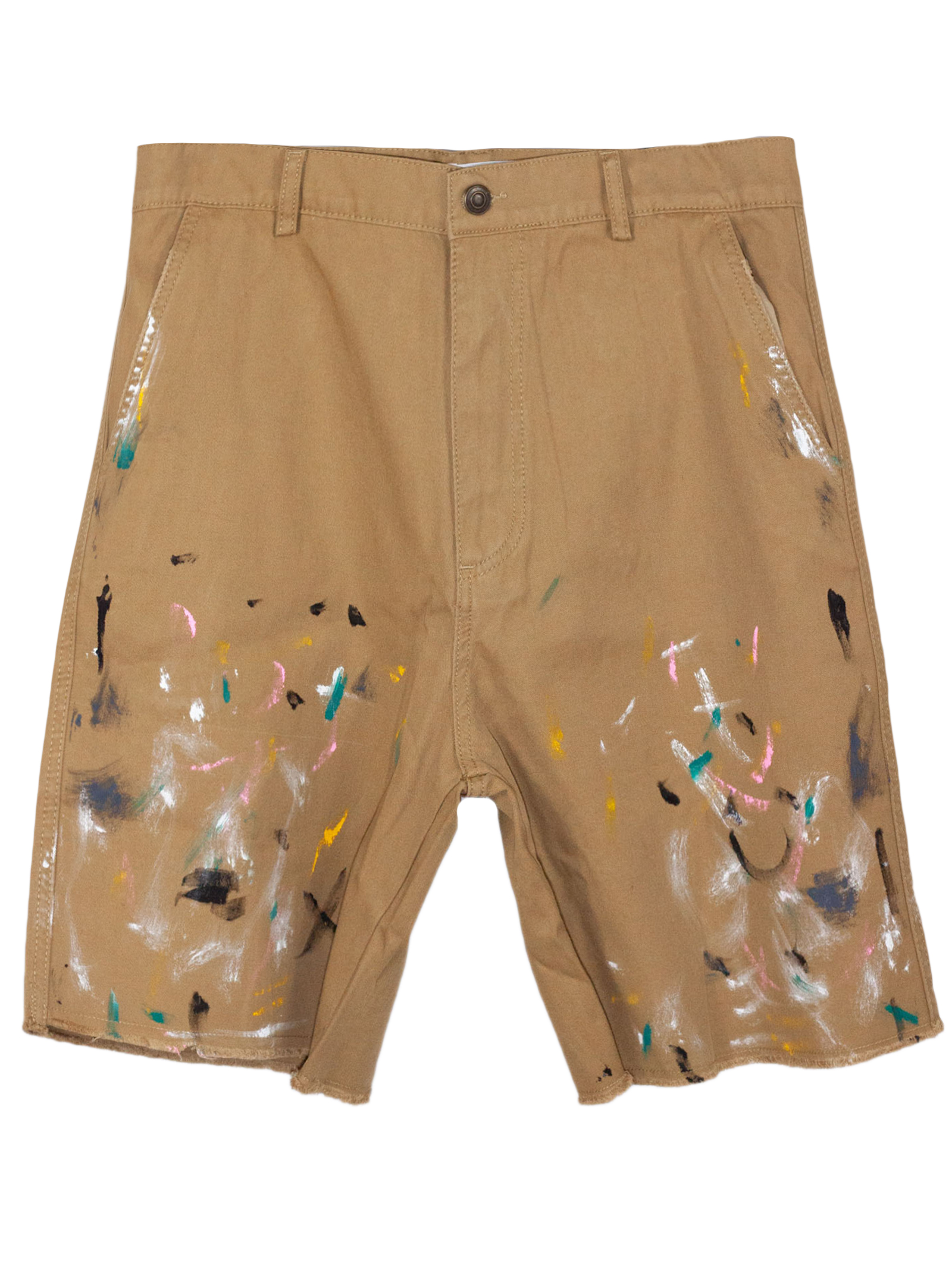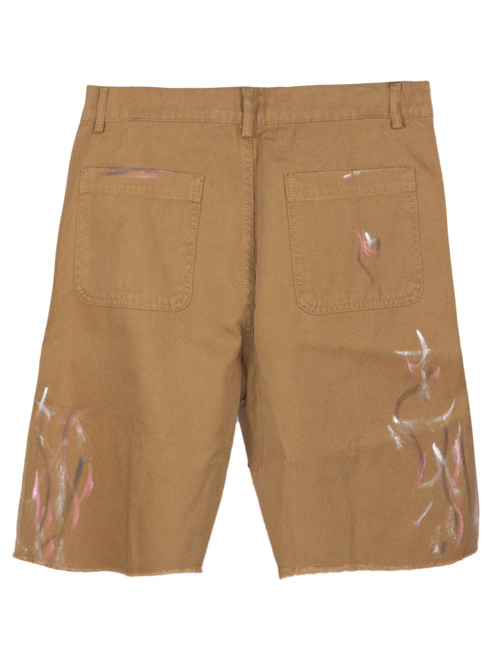 Beige cotton Bermuda shorts with a multicolored patent-leather effect, belt loops, side pockets, back pockets, front closure with a zipper and button, raw hem