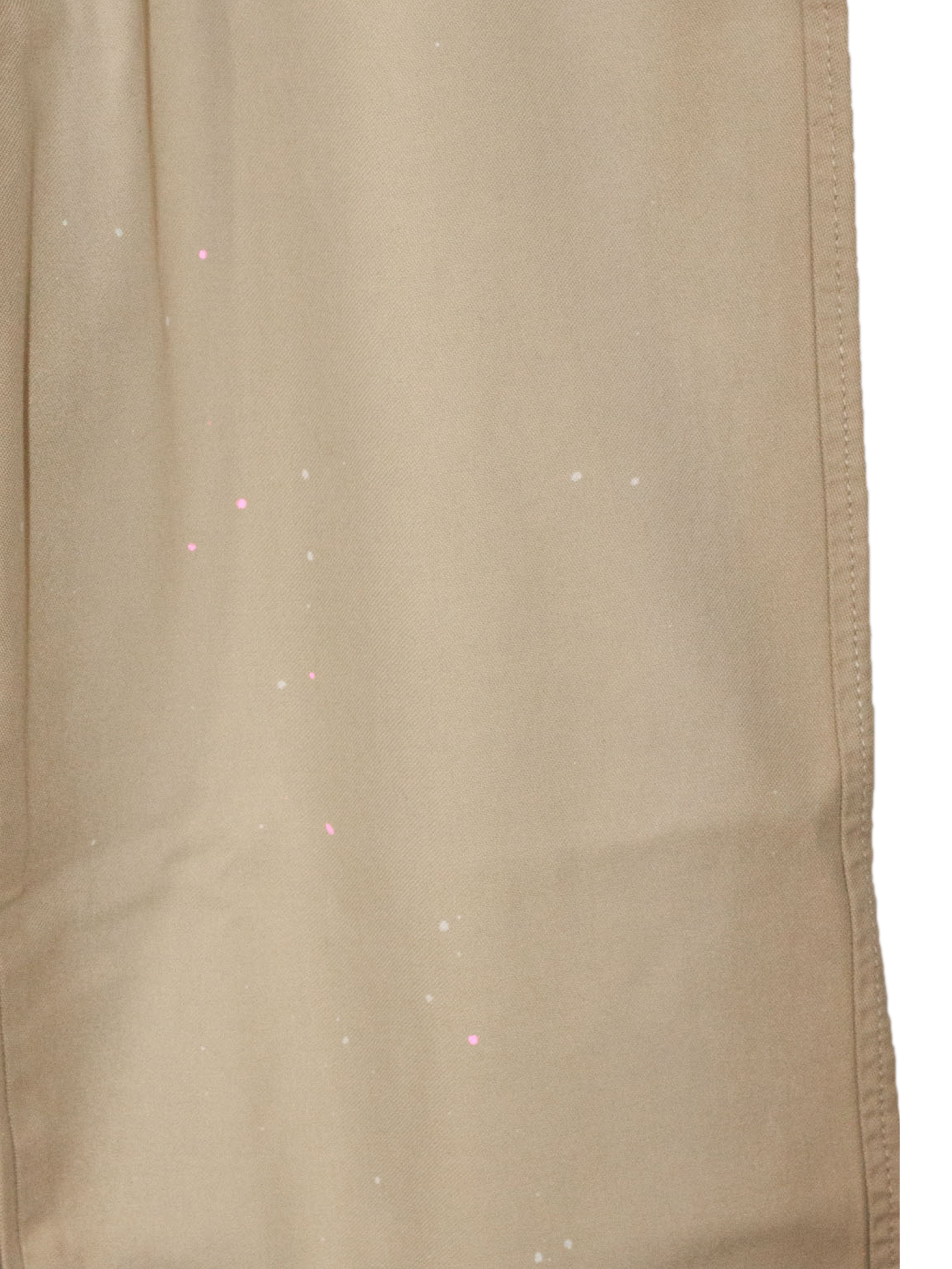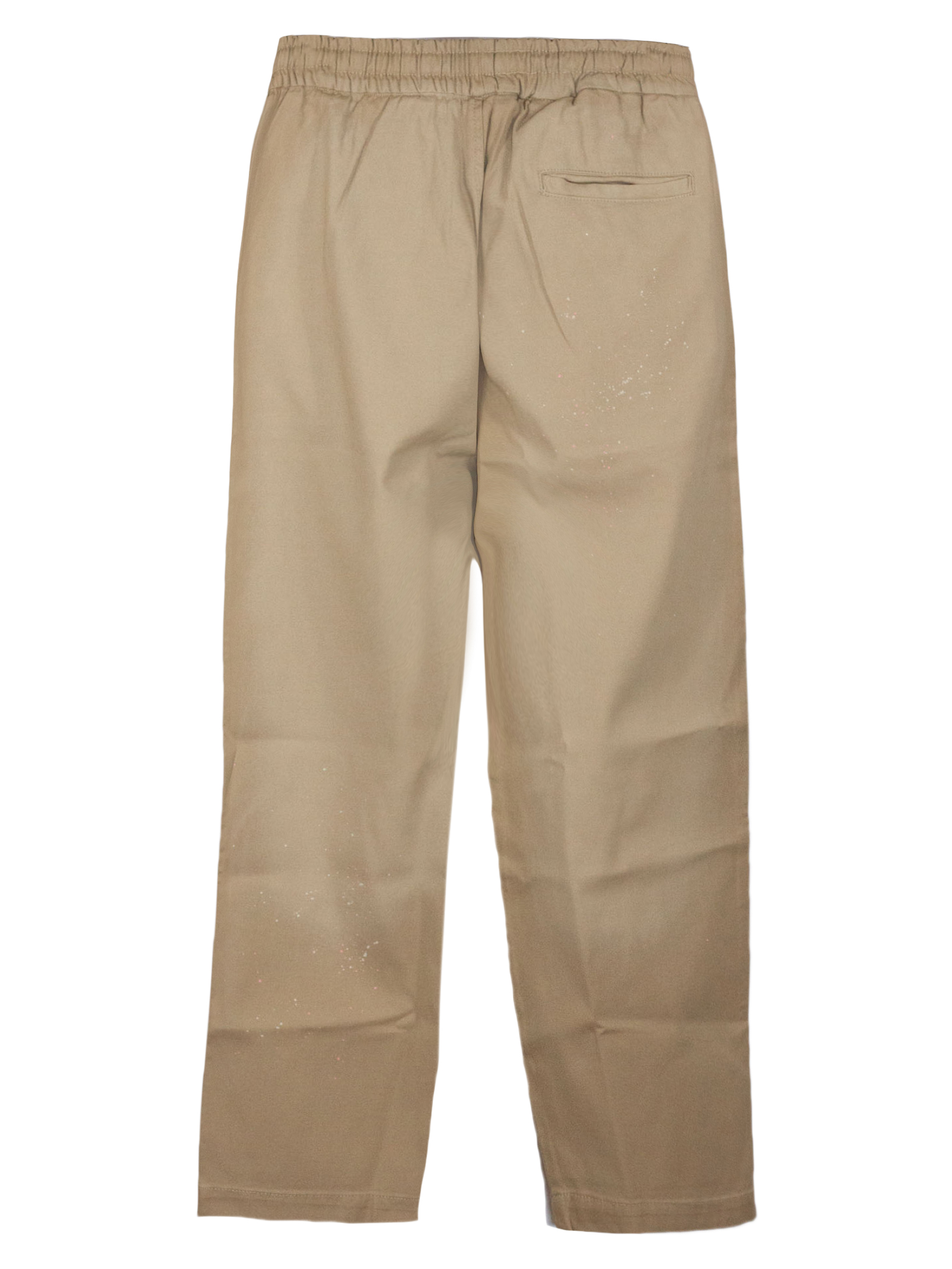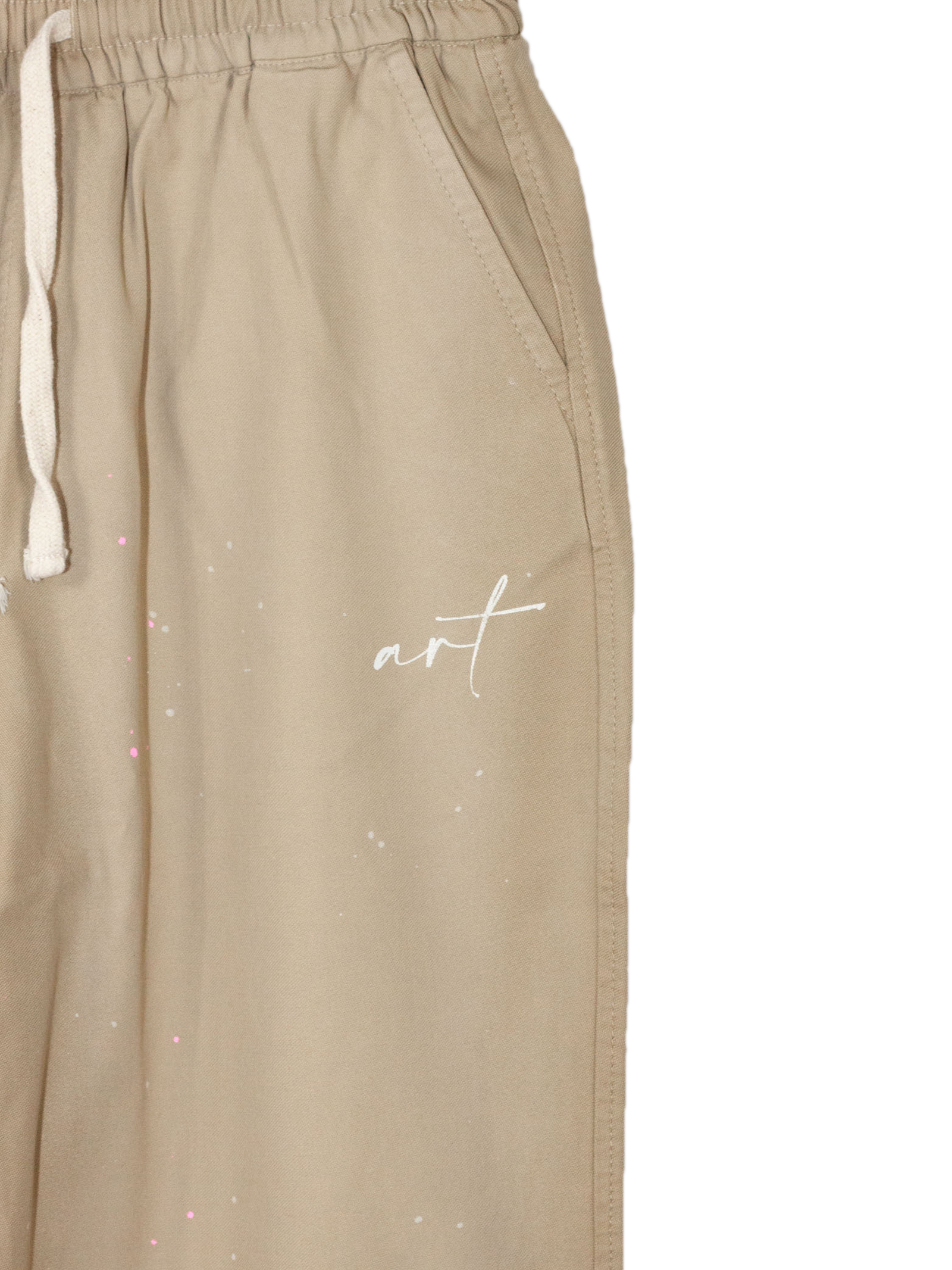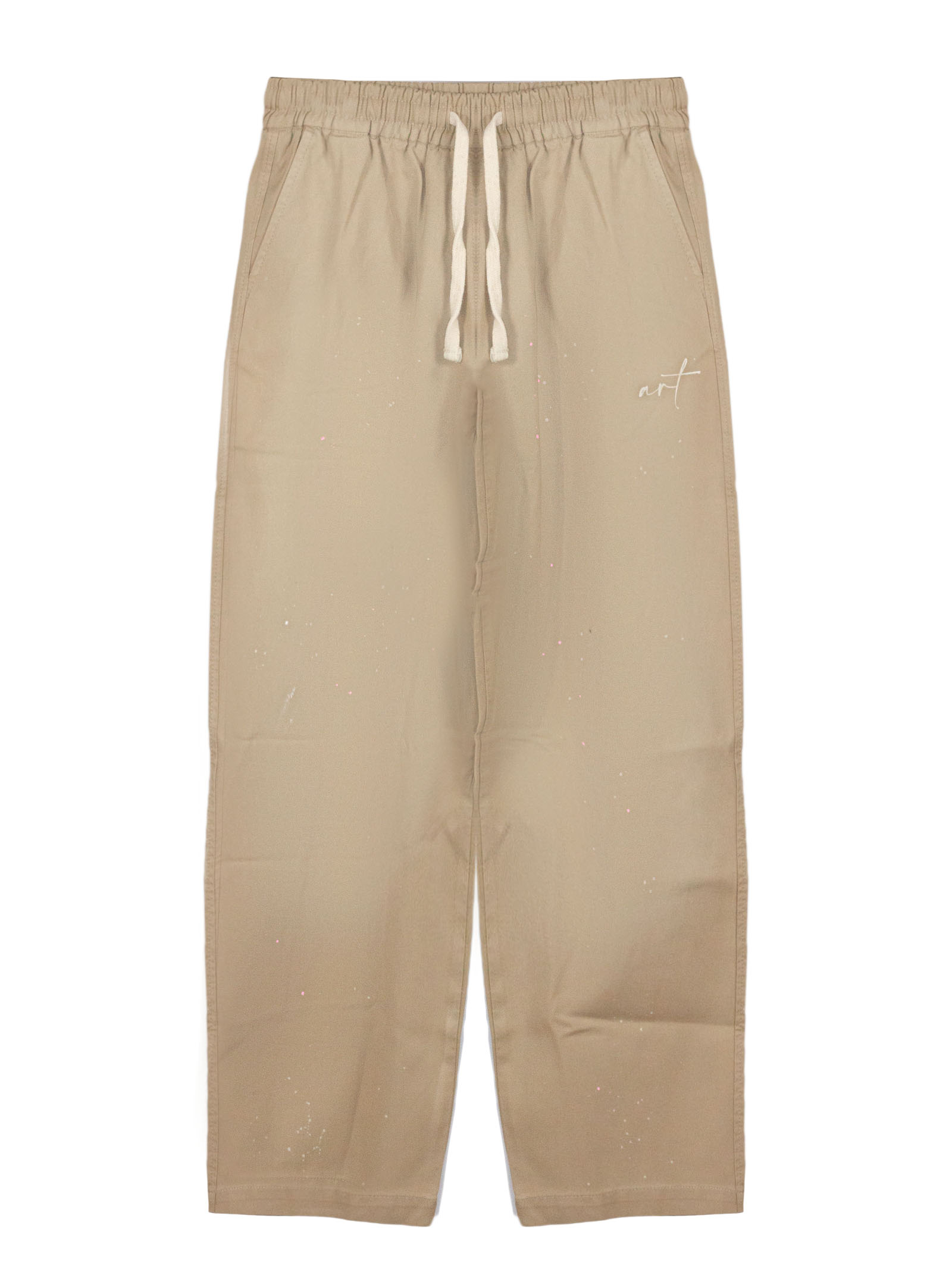 Beige cotton pants with an elastic waistband, side pockets, a back pocket, a drawstring, and an all-over patent-leather effect