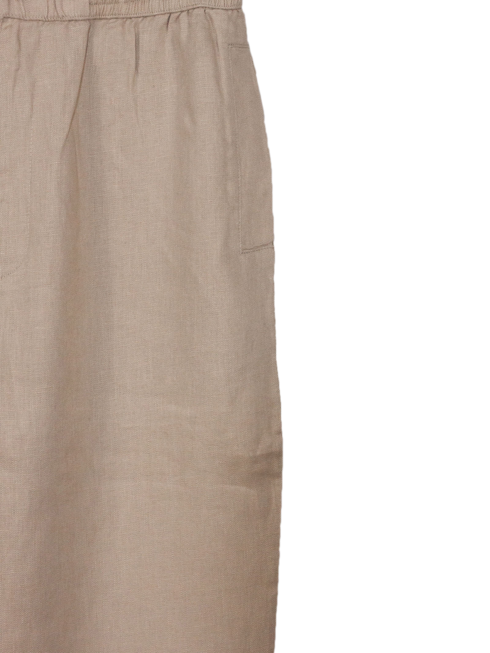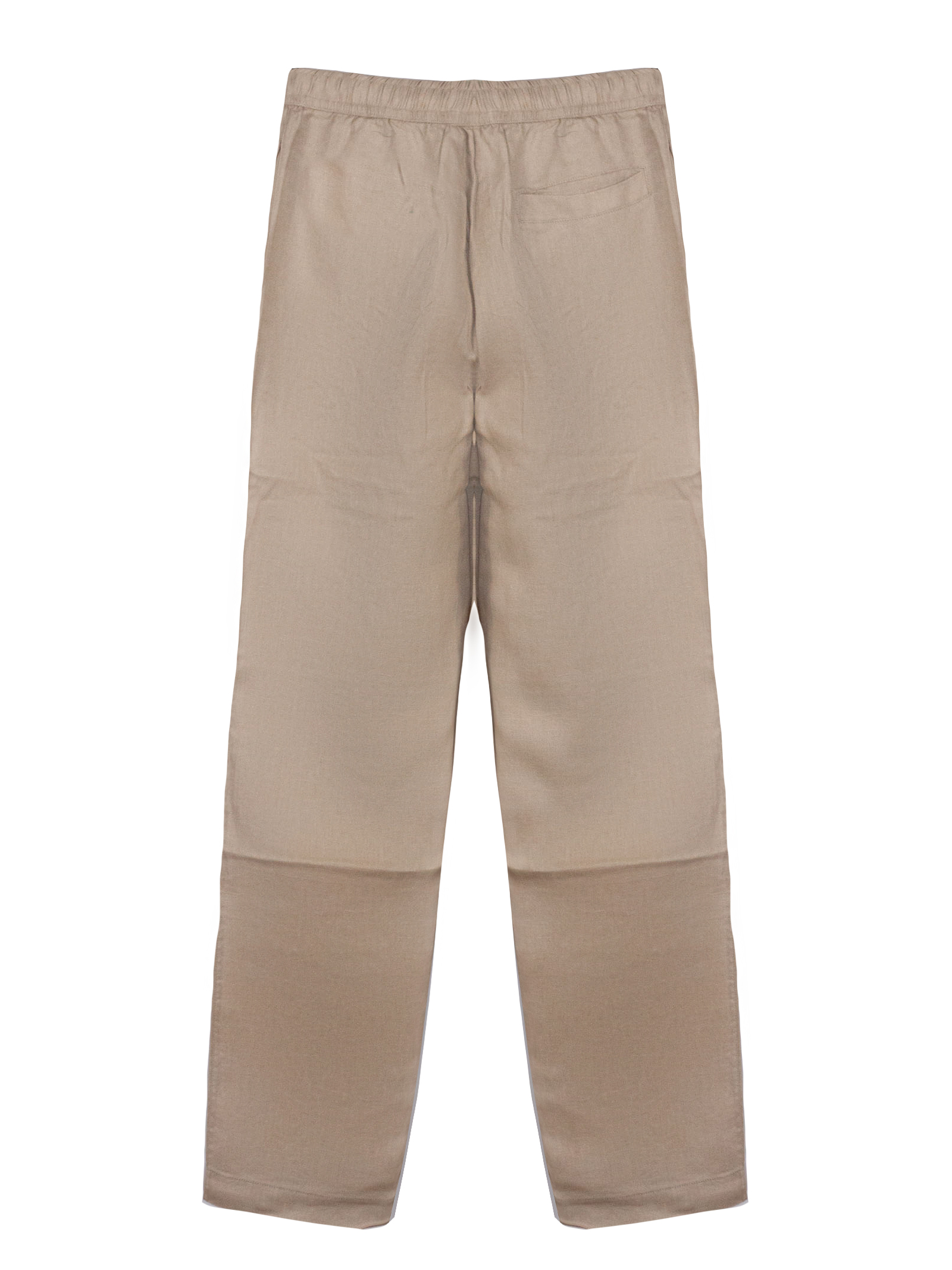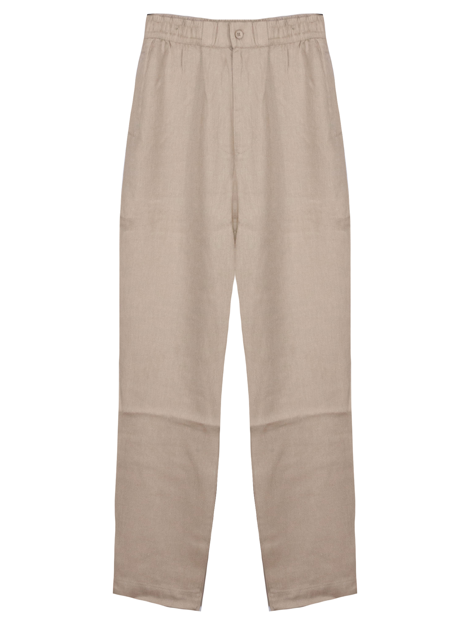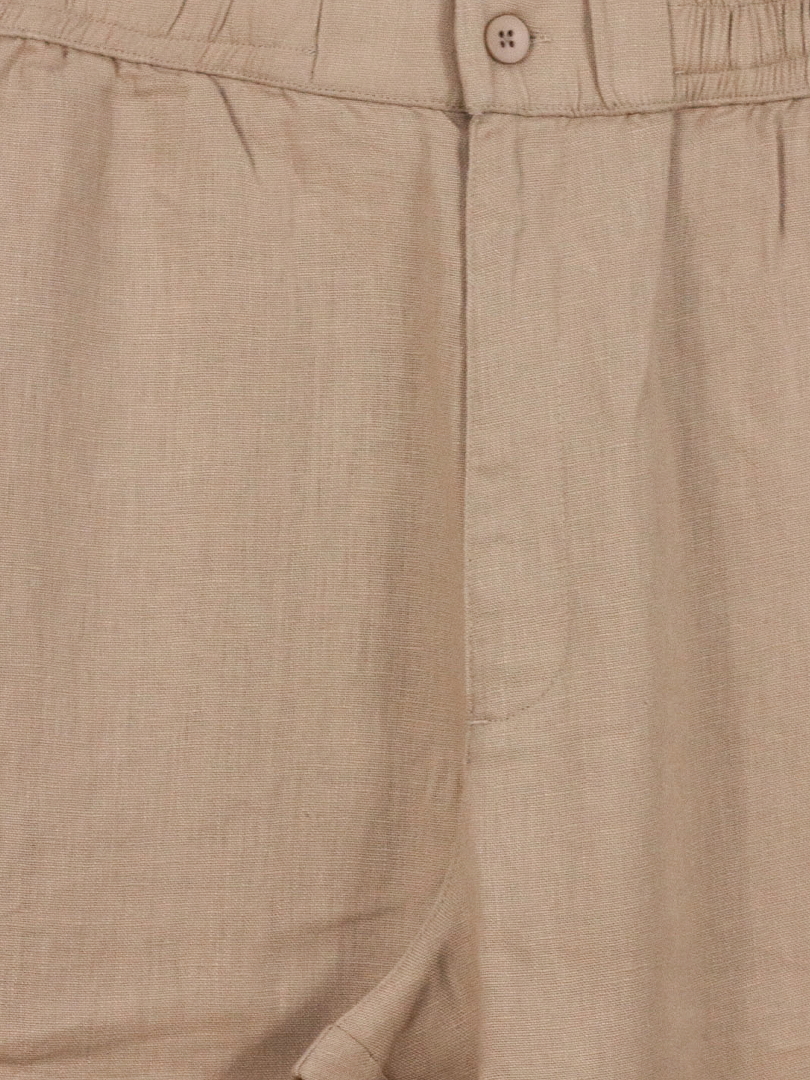 Beige cotton pants with an elastic waistband, side pockets, a back pocket, and a zip and button closure