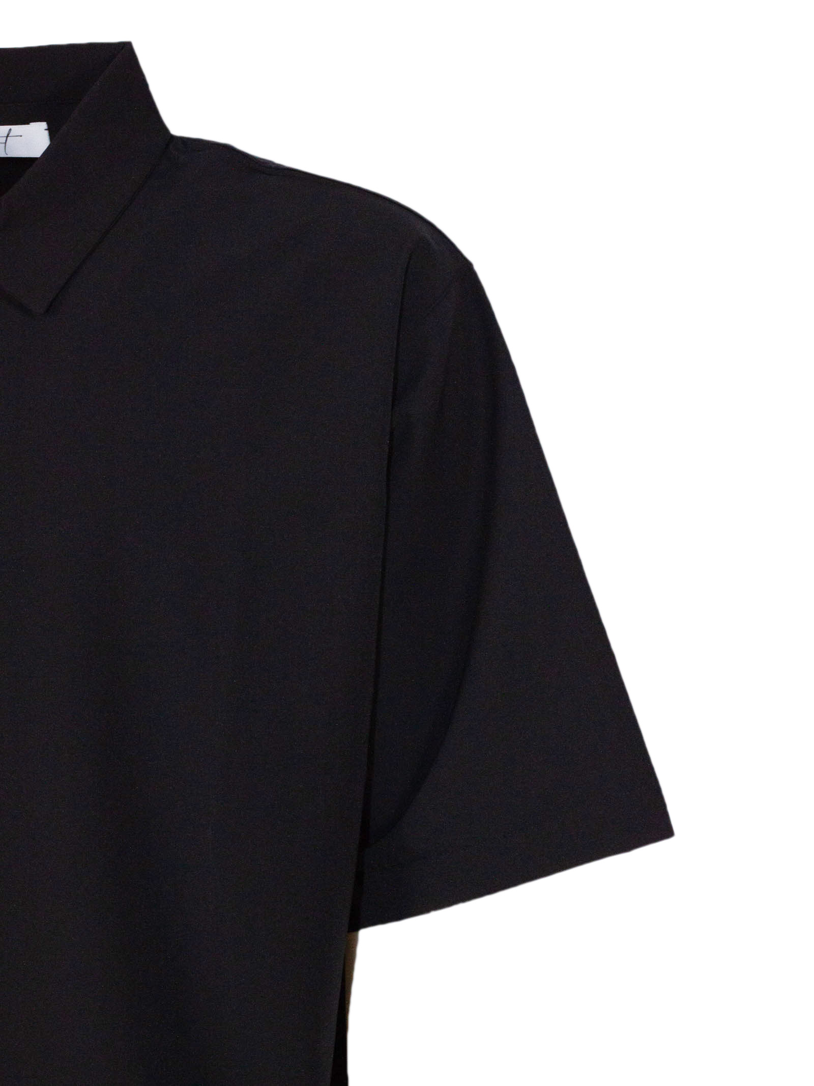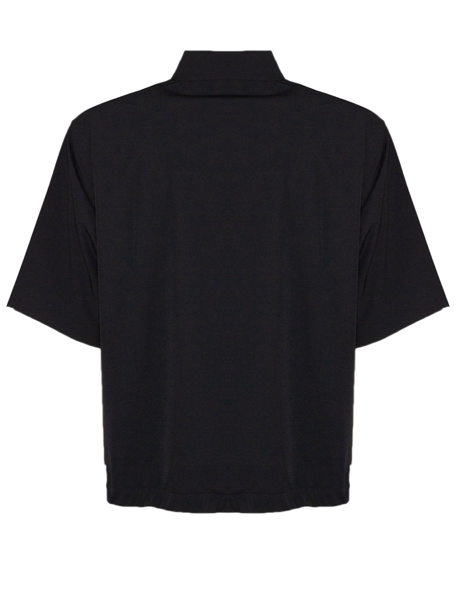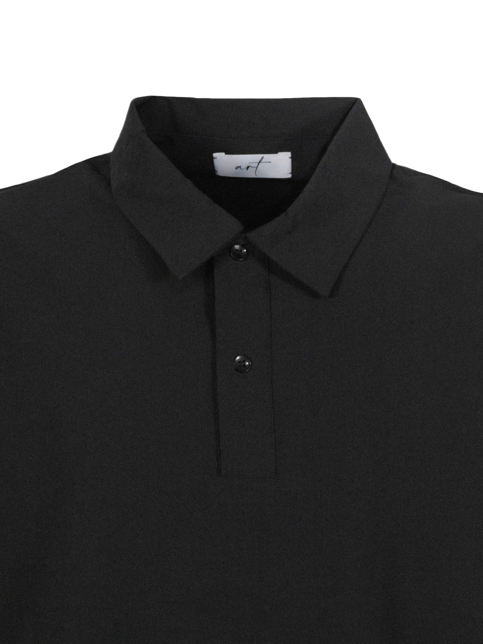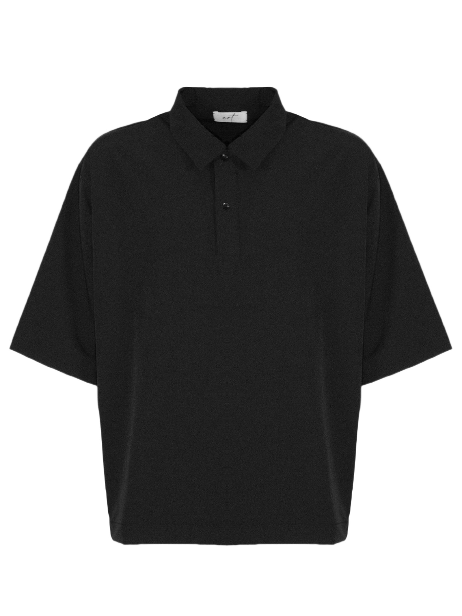 Black cotton polo shirt with a boxy fit, short sleeves, and a classic collar with a button closure