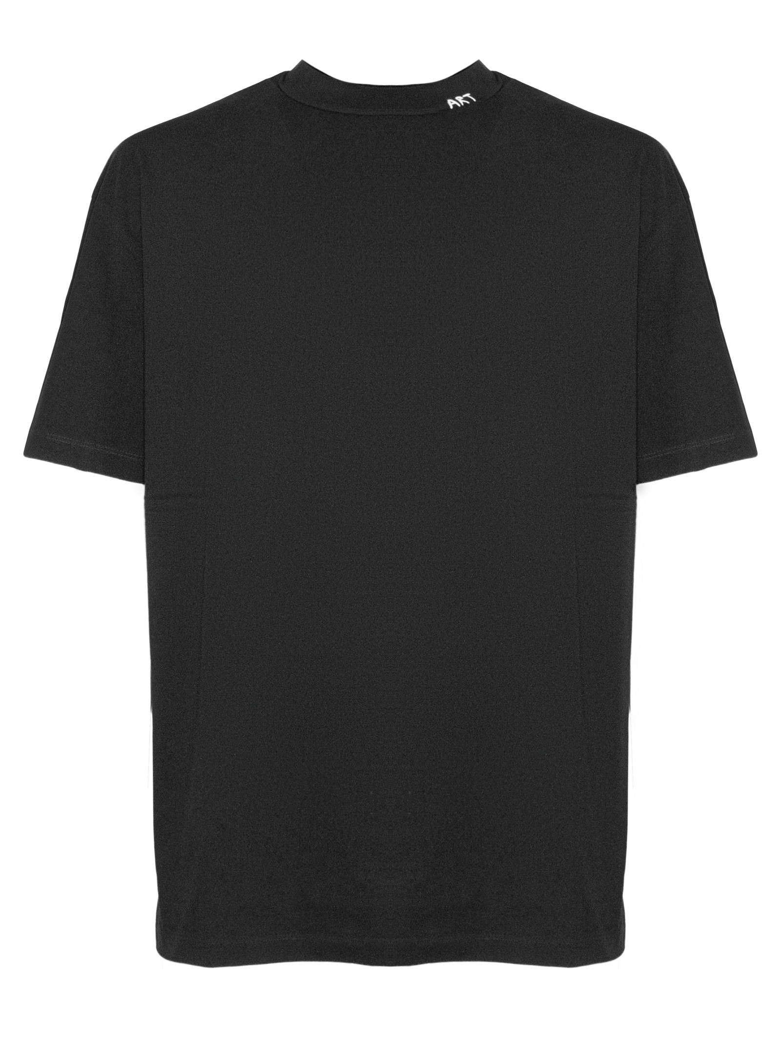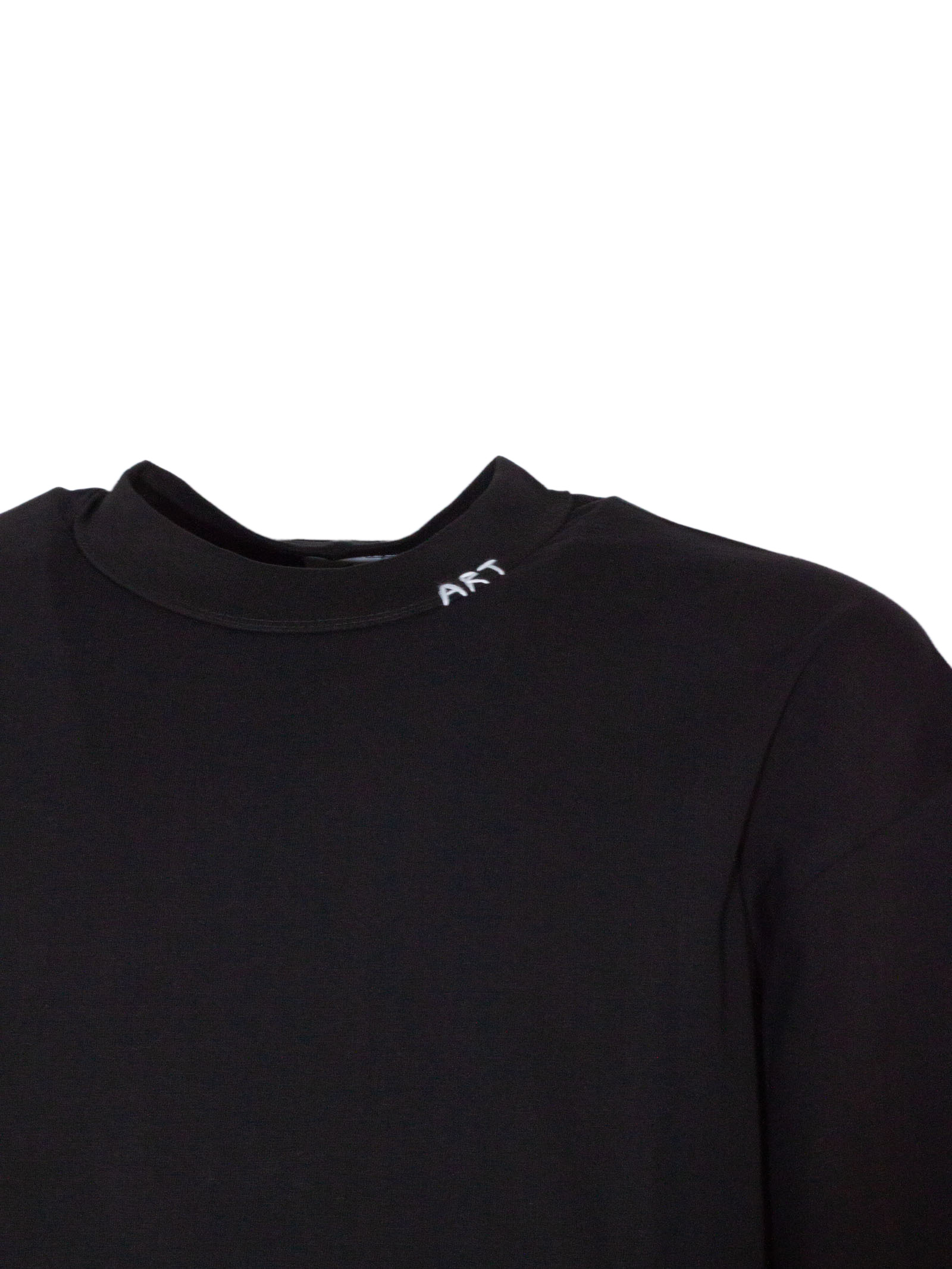 Black cotton T-shirt with a slightly high crew neck, embroidered detail, and short sleeves