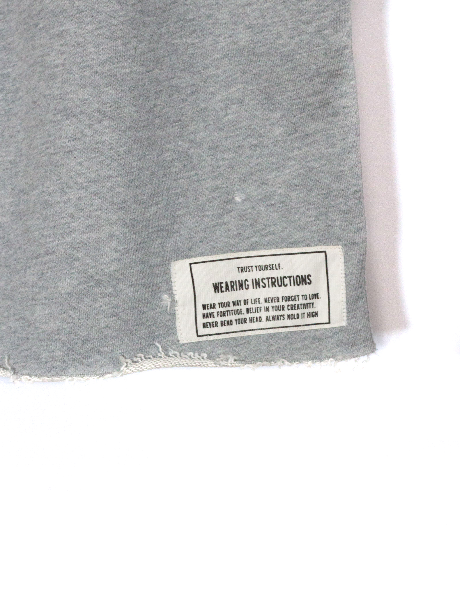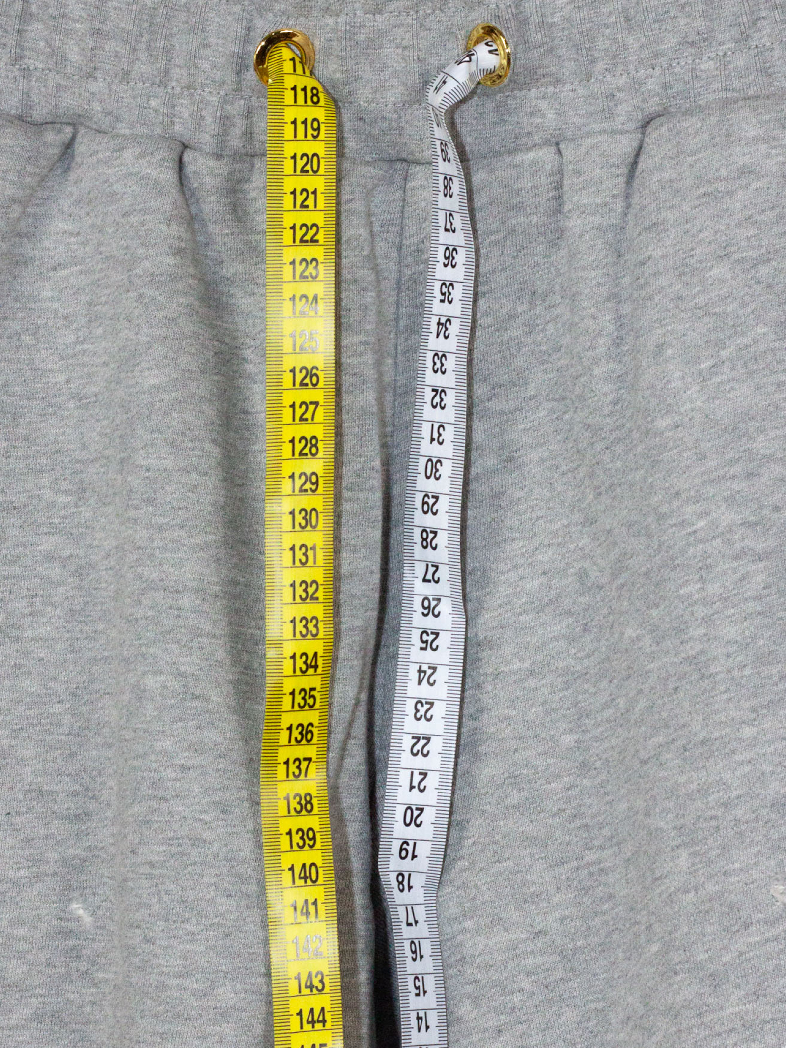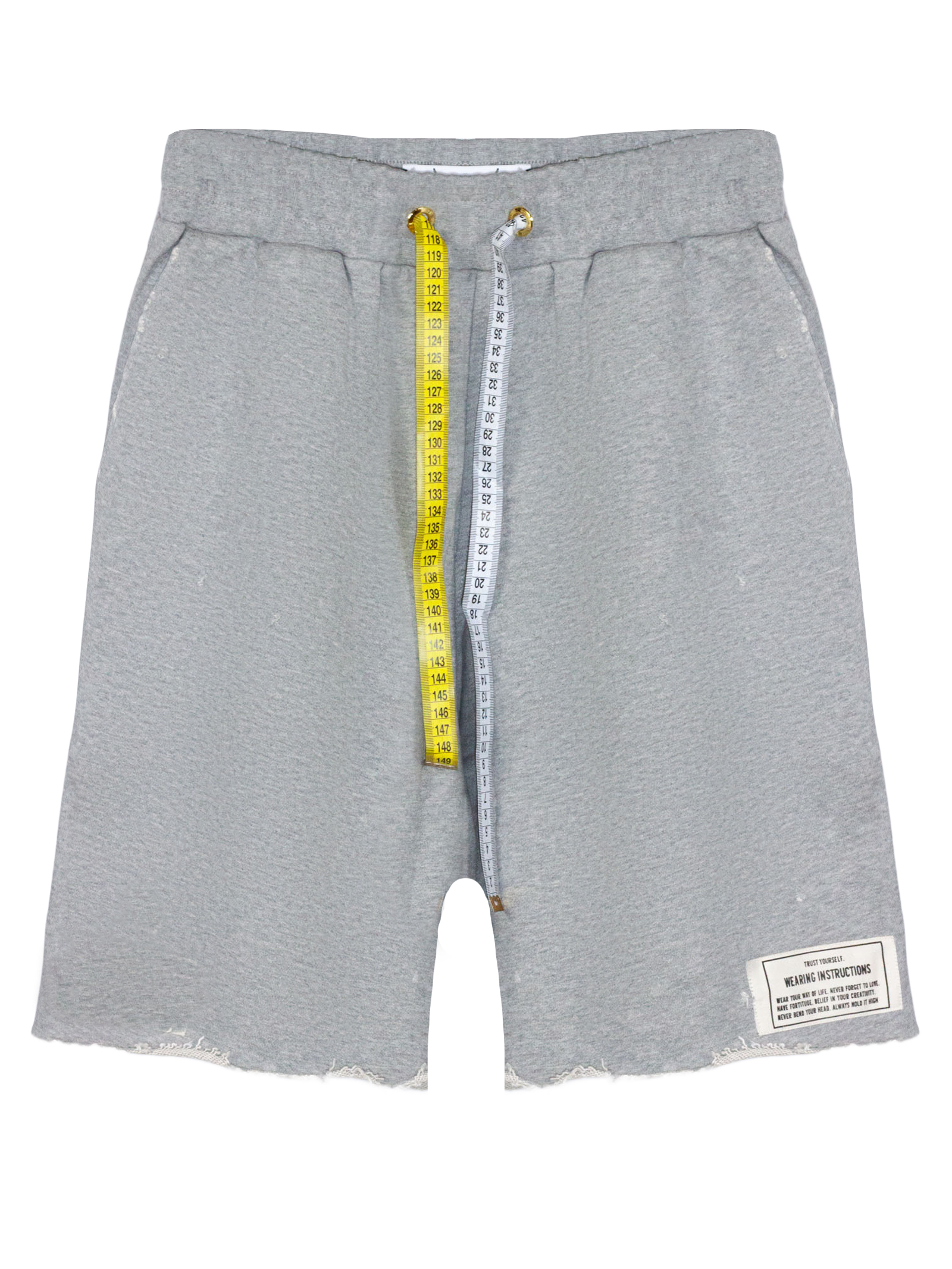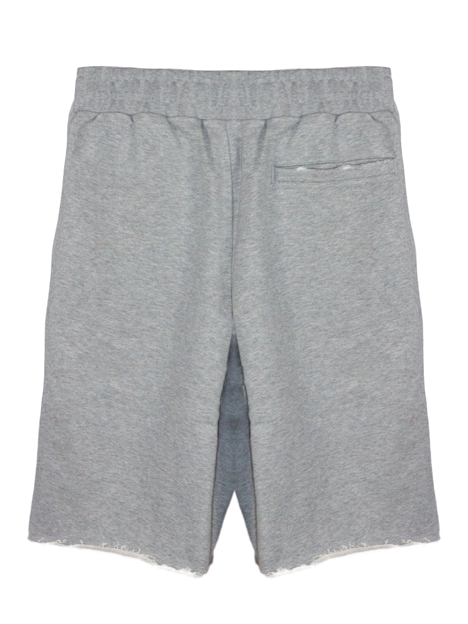 Gray cotton Bermuda shorts with a vintage look, a drawstring detail inspired by a tailor's measuring tape, raw-cut hem, side pockets, and a back pocket