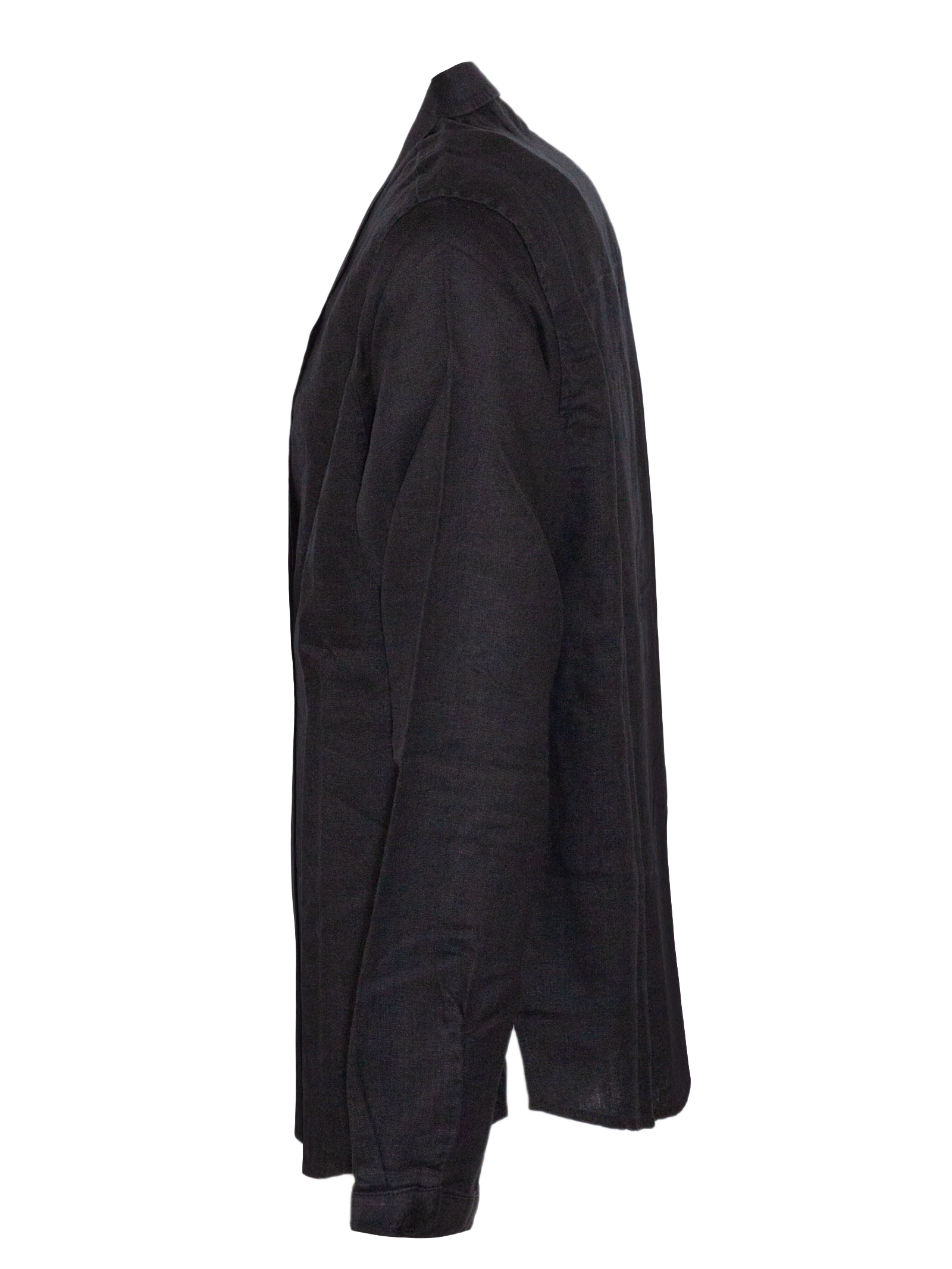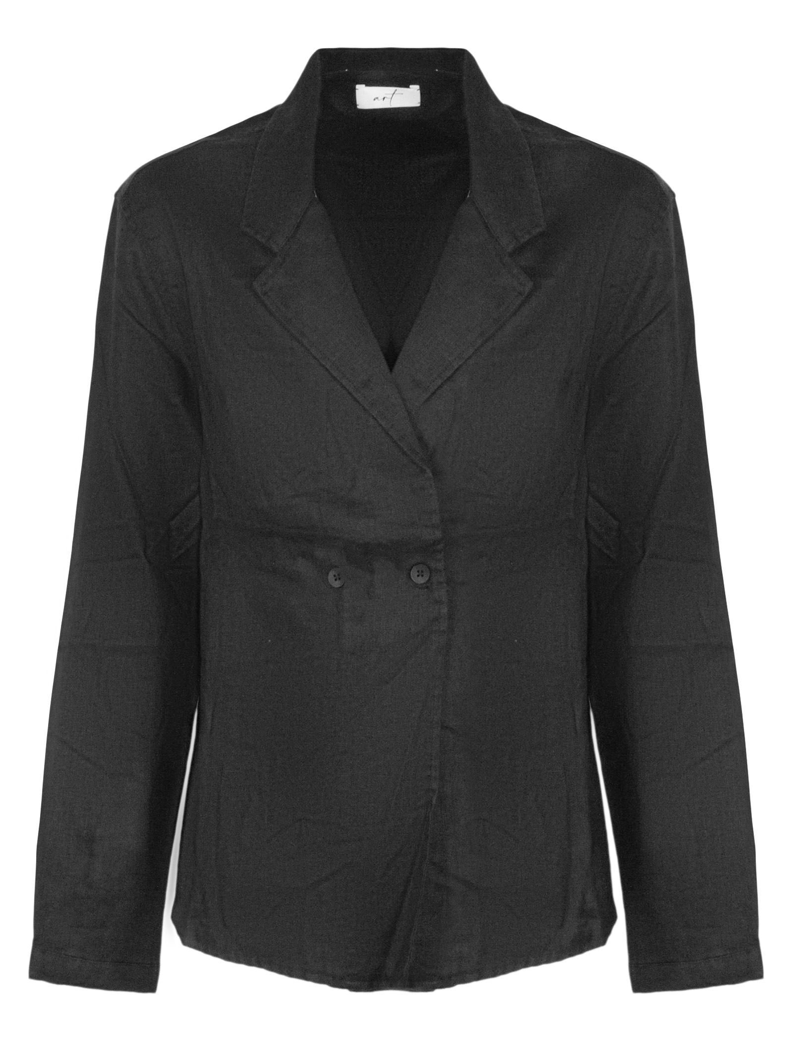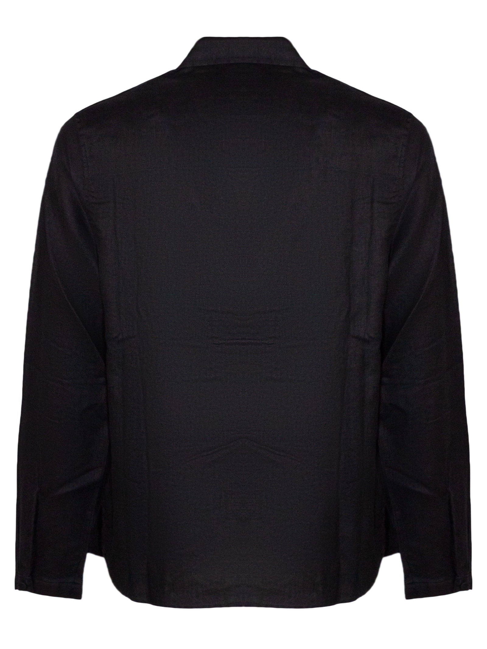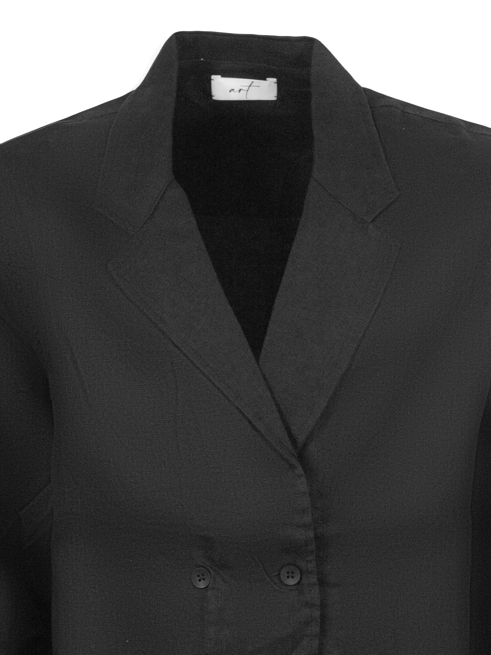 Lightweight black cotton jacket with a double-breasted button closure, classic lapels, and long sleeves with a button