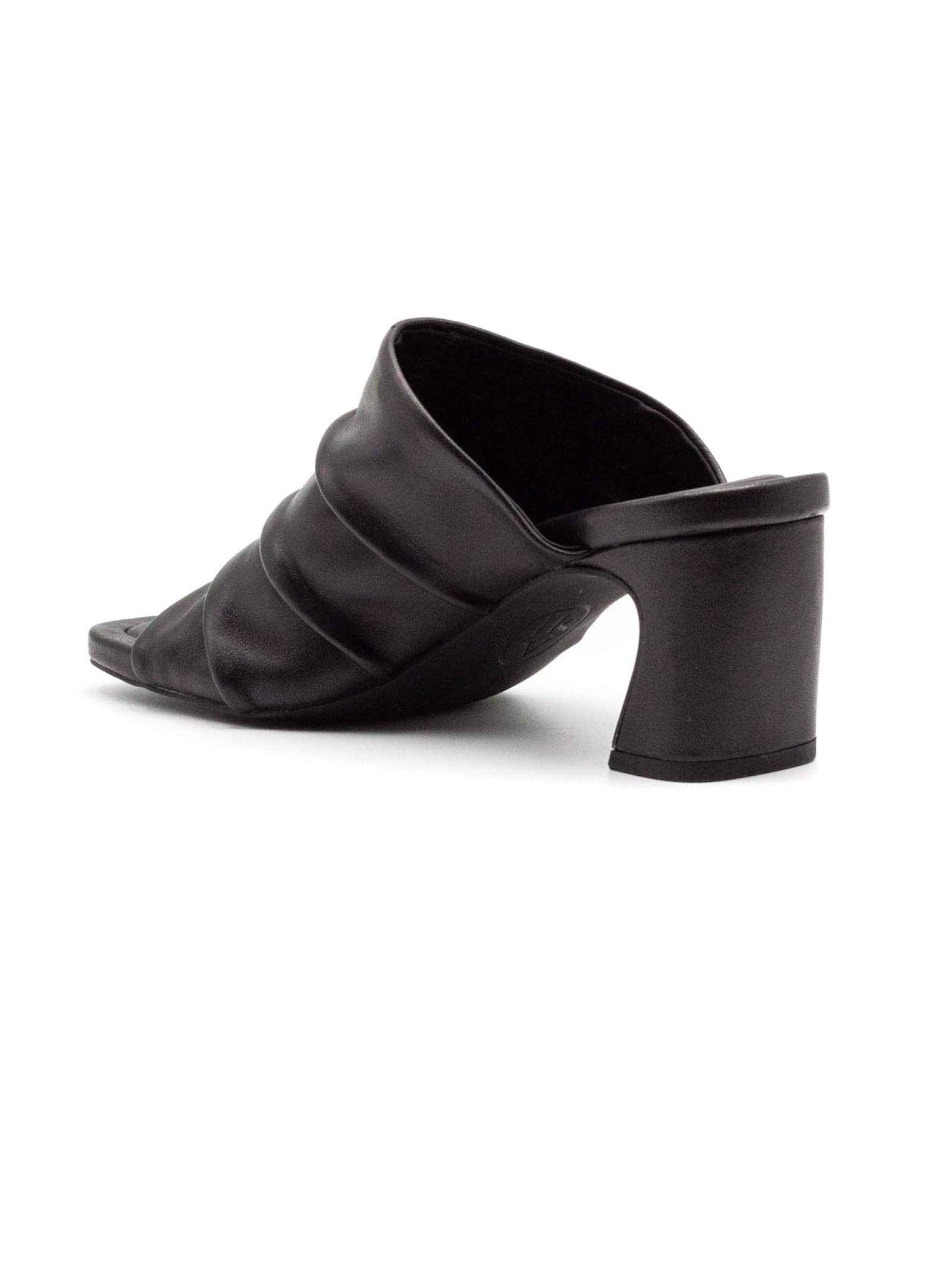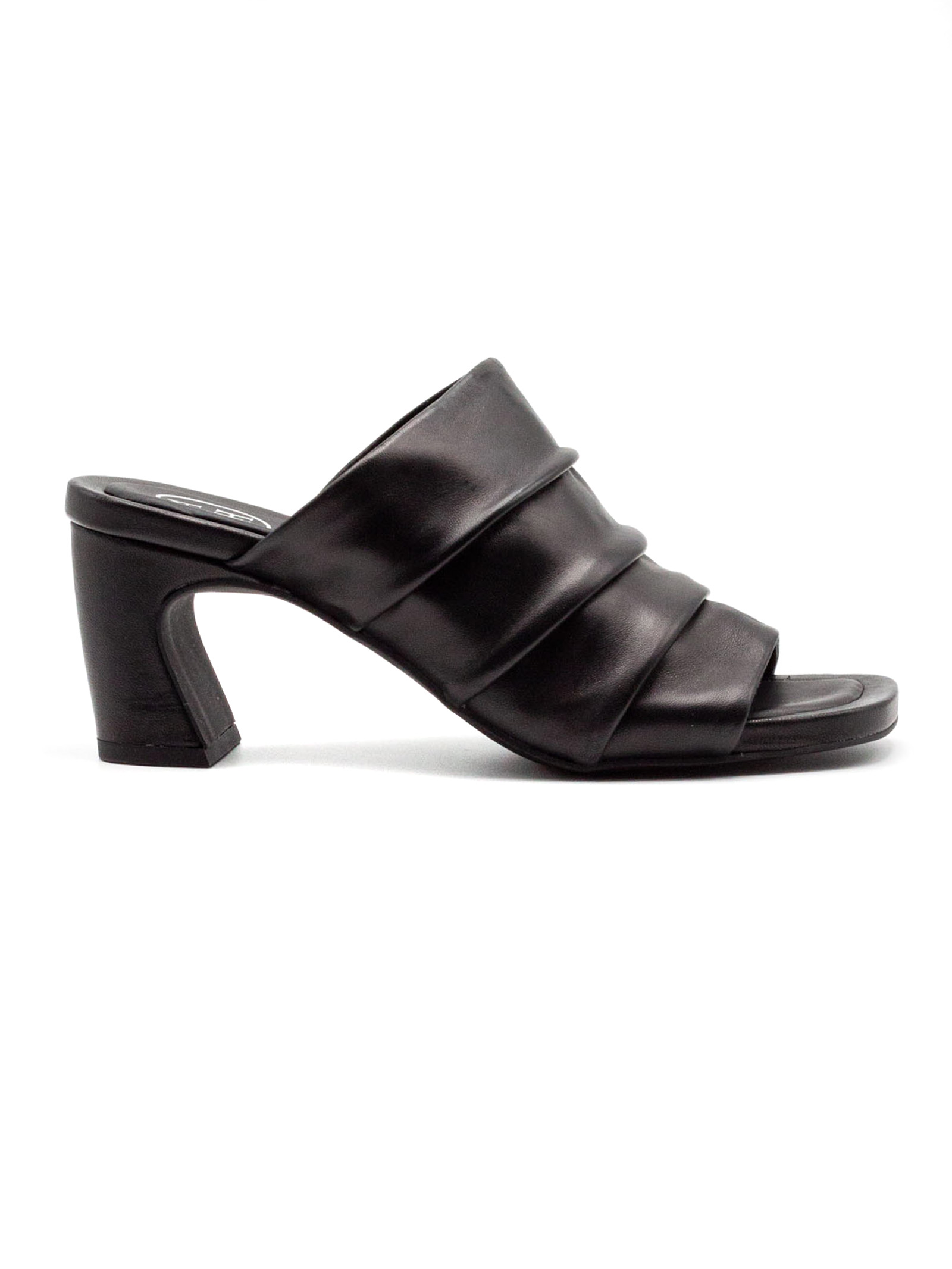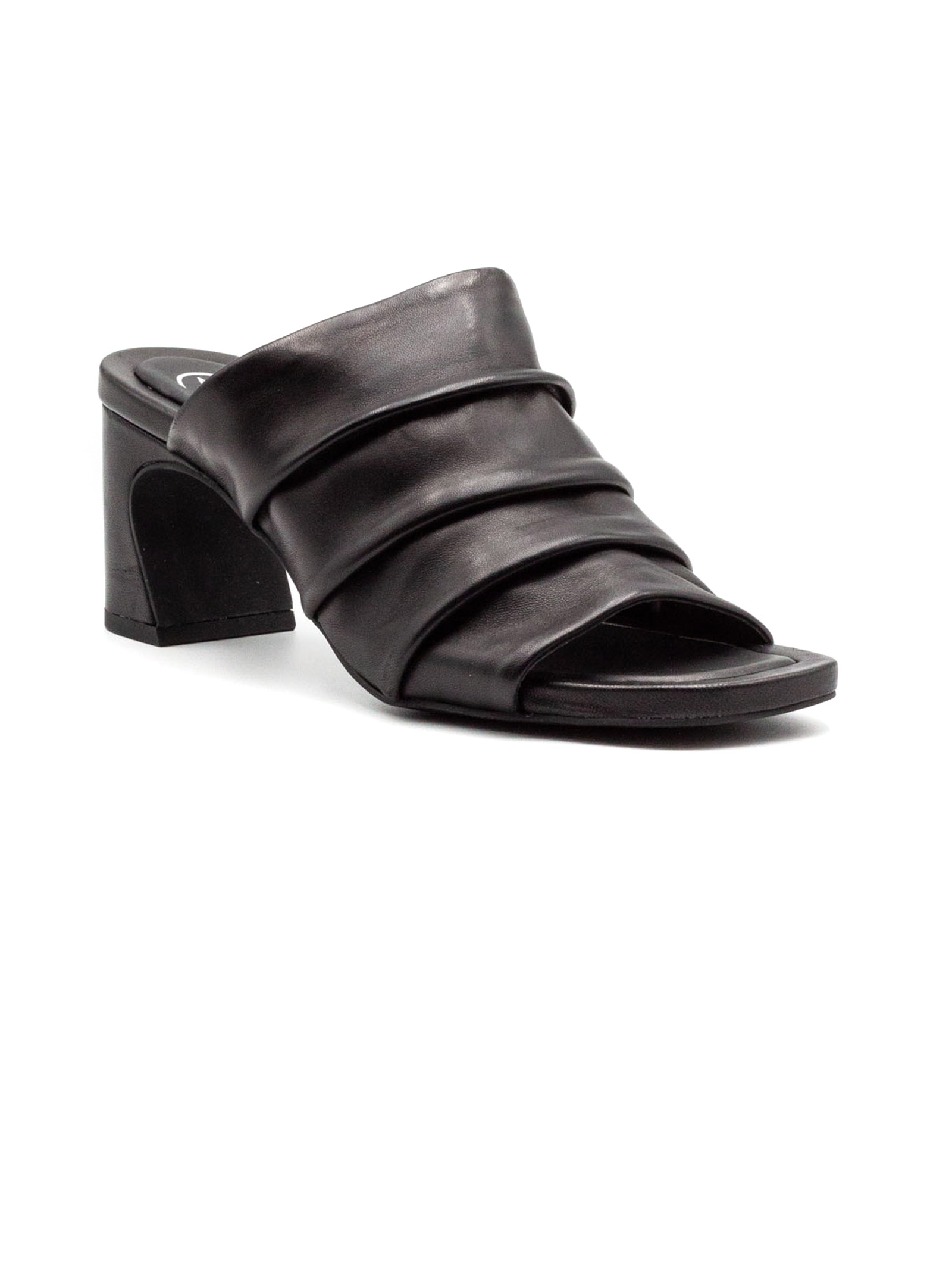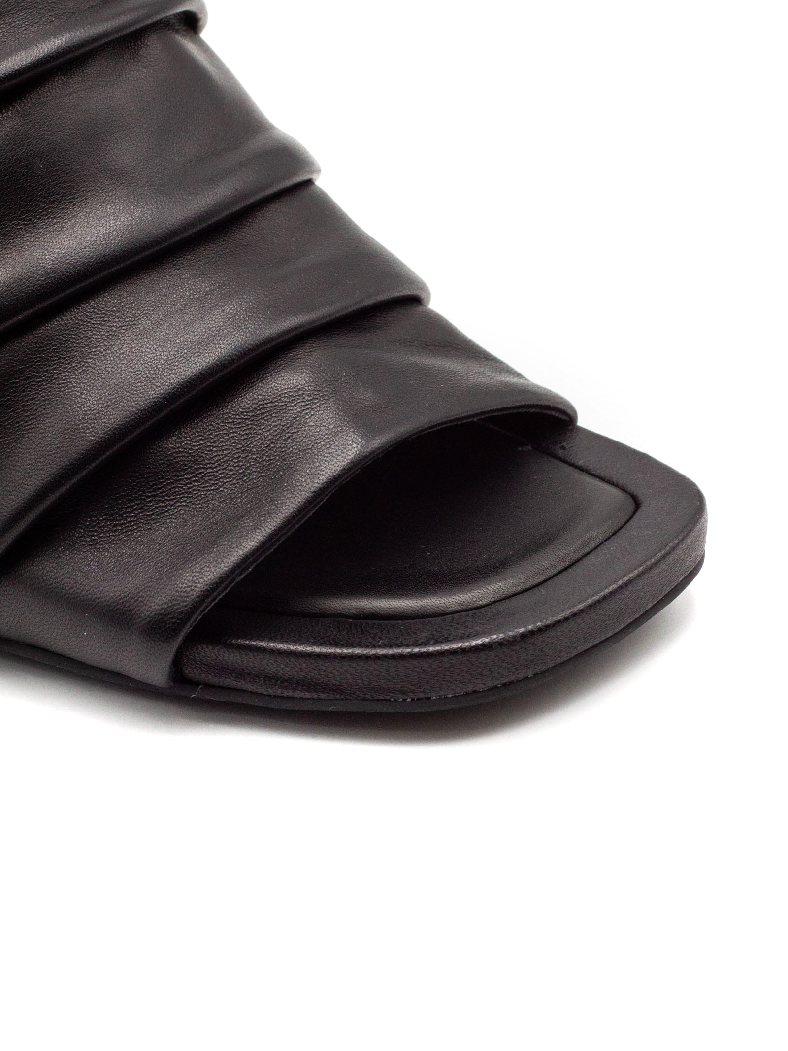 Black Leather Eva sandal, open-toe, wide gathered strap, medium-width heel, contoured sole, heel height 7 cm