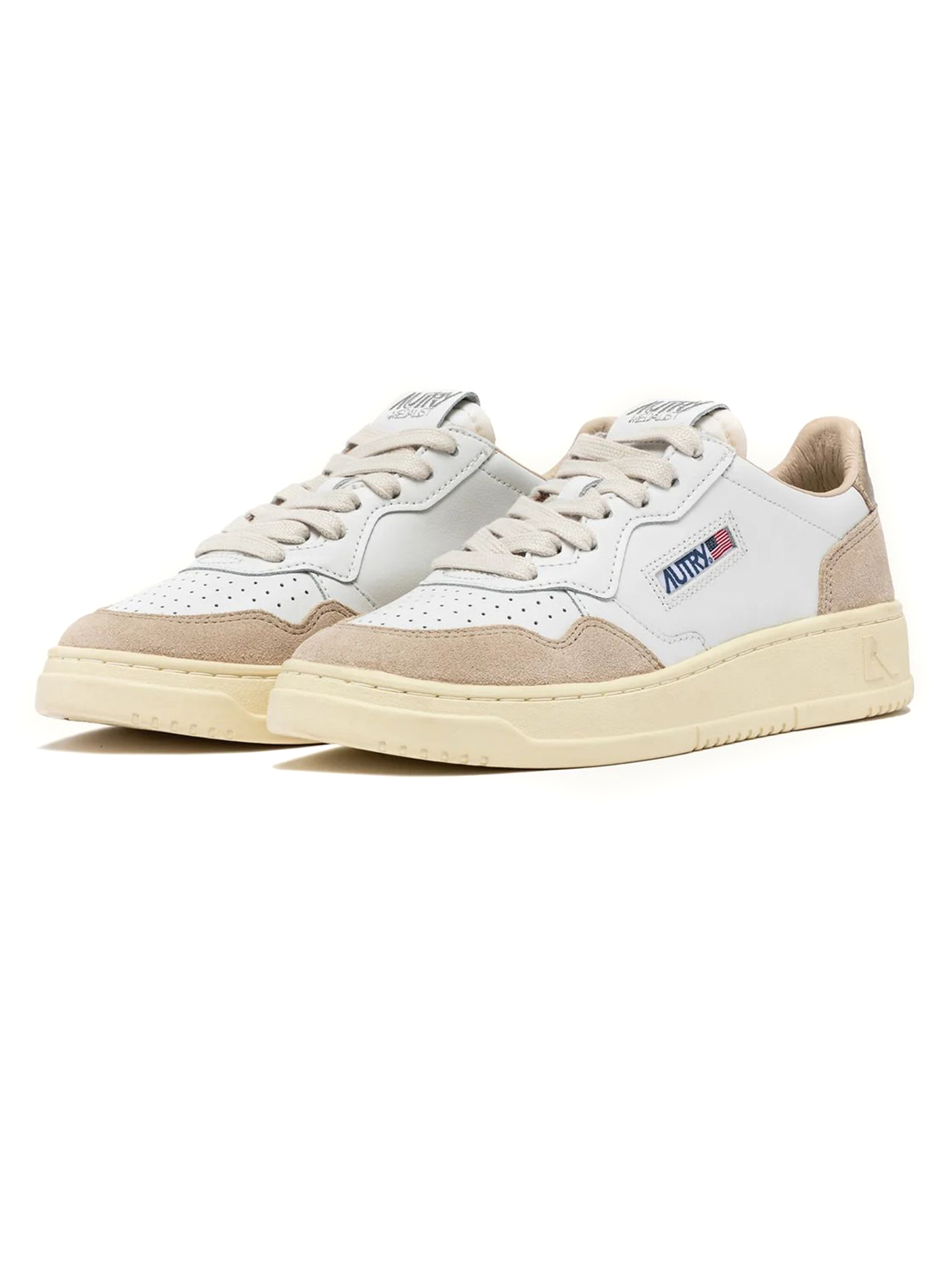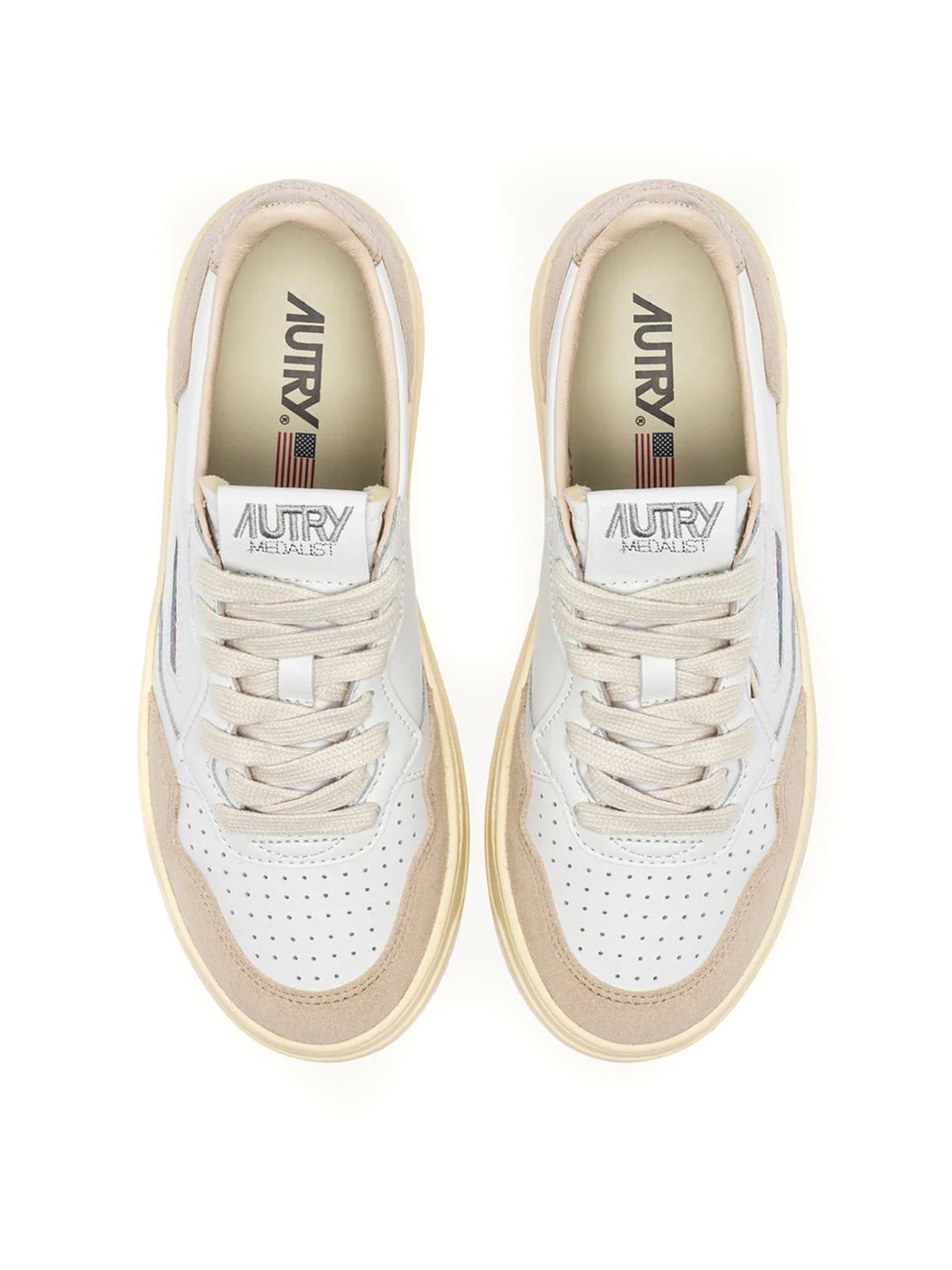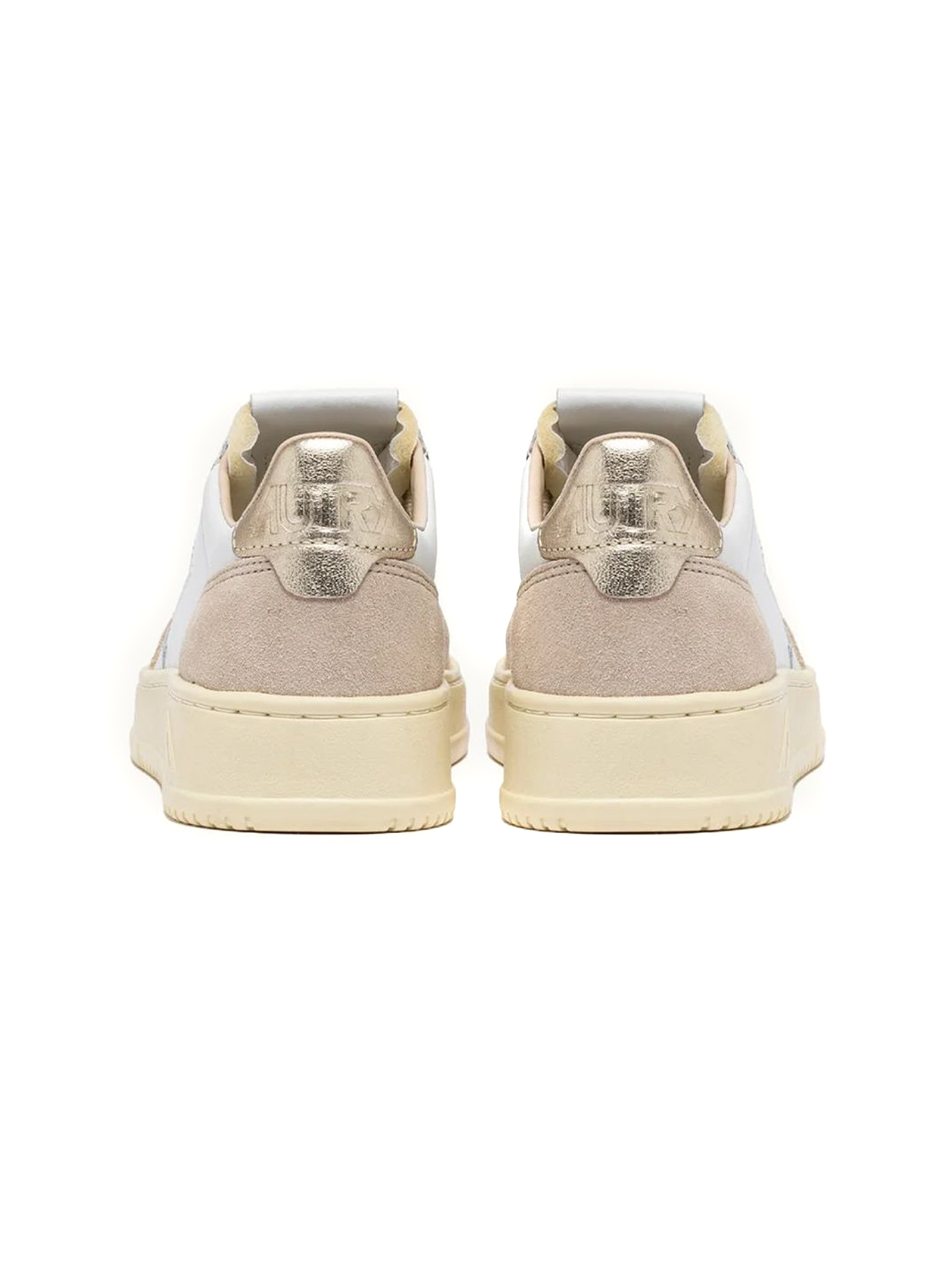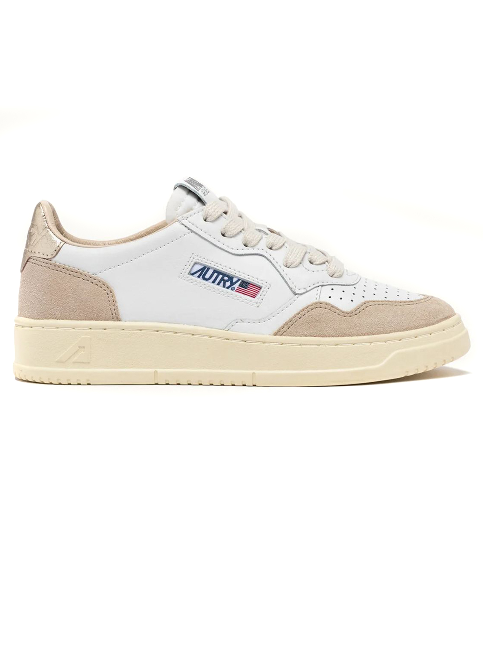 Medalist Low Sneakers In White And Gold Leather, Leather, suede and nylon upper, Perforated toe, Flat cotton laces, Label sewn on tongue, Padded ankle collar, Leather, towel and nylon lining, 2 cm leather insole, Rubber sole. Height of sole: 2.5-3.5 cm