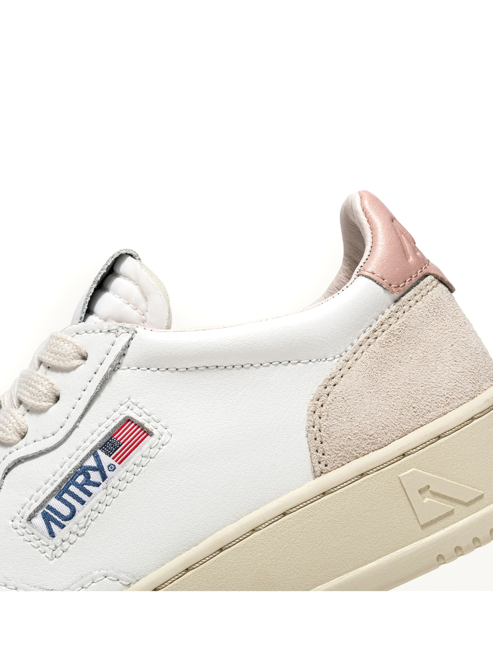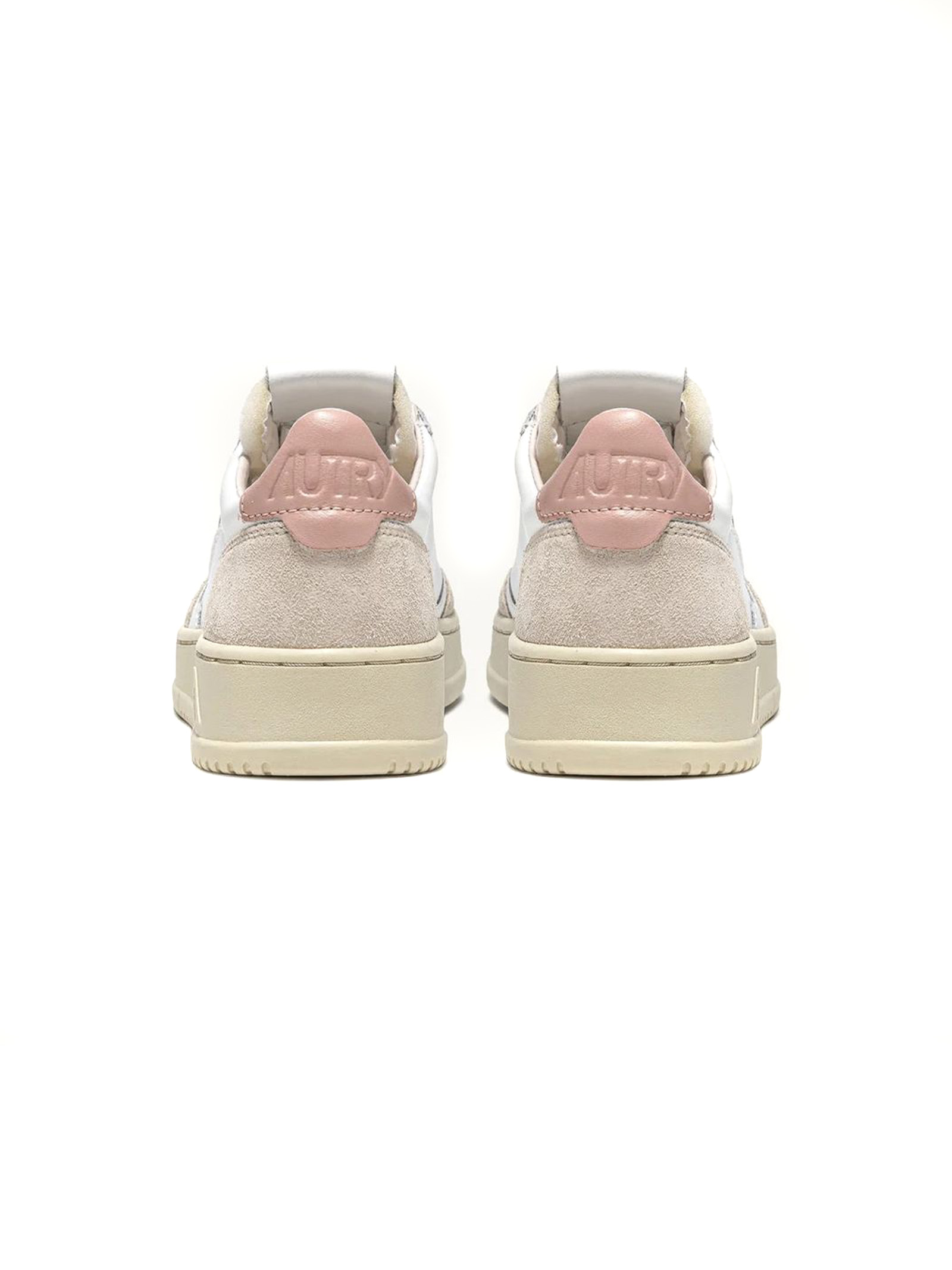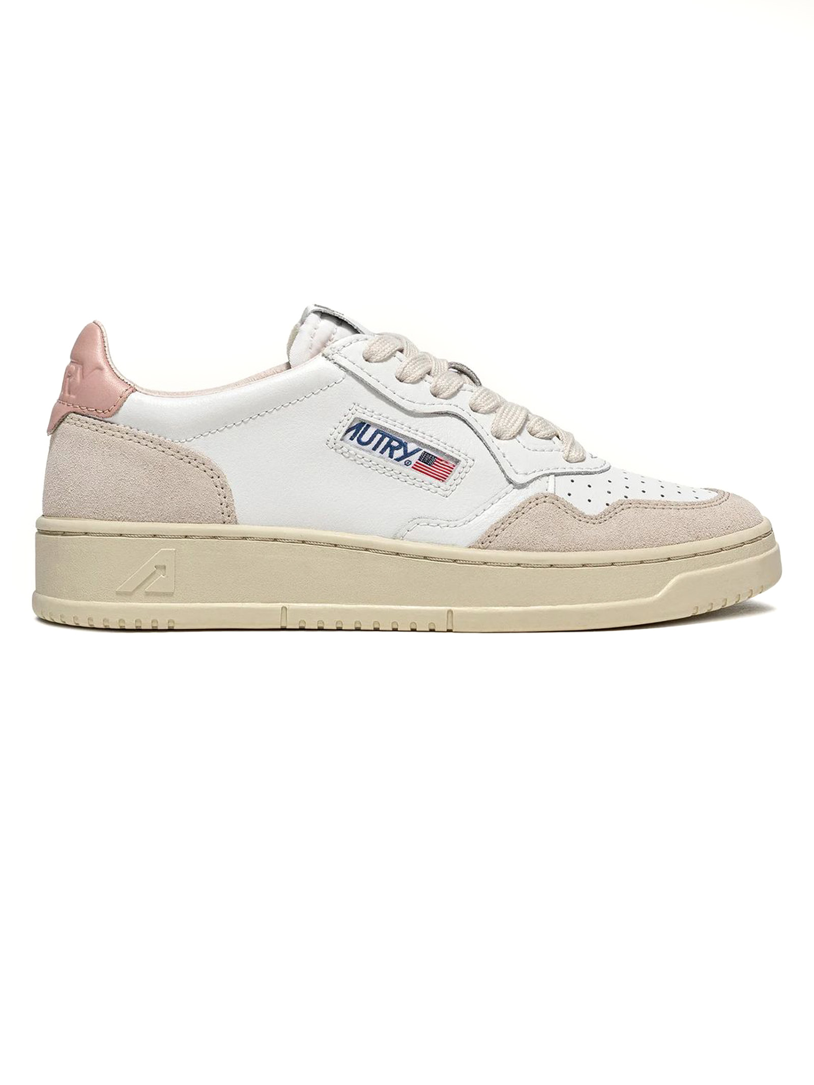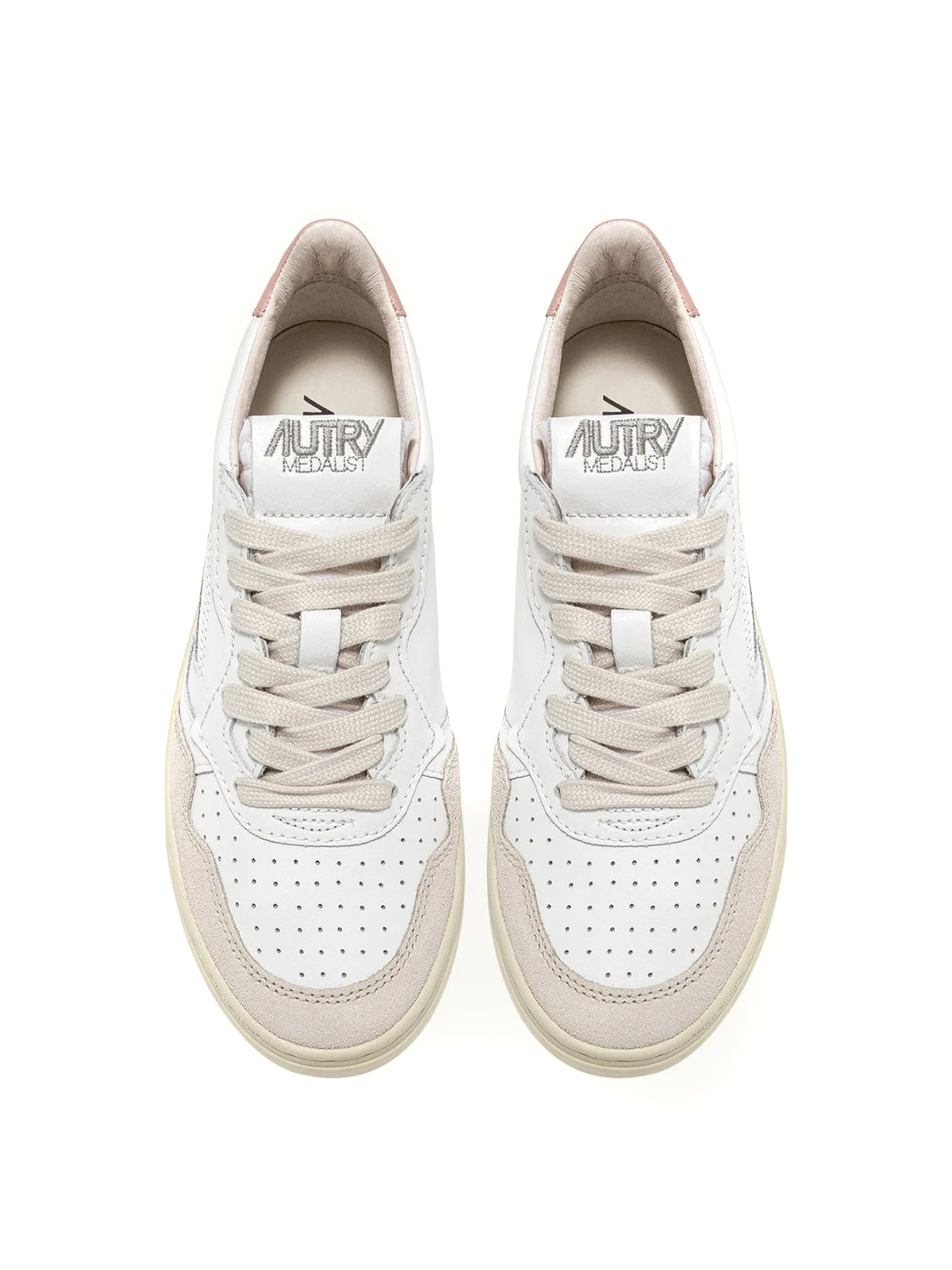 Medalist Low Sneakers In White And Powder Leather And Beige Suede, Perforated toe, Flat cotton laces, Label sewn on tongue, Padded ankle collar, Lined in leather and cotton terry, 2 cm leather insole, Rubber sole, Height of sole: 2,5-3,5 cm, Fabric dust bag