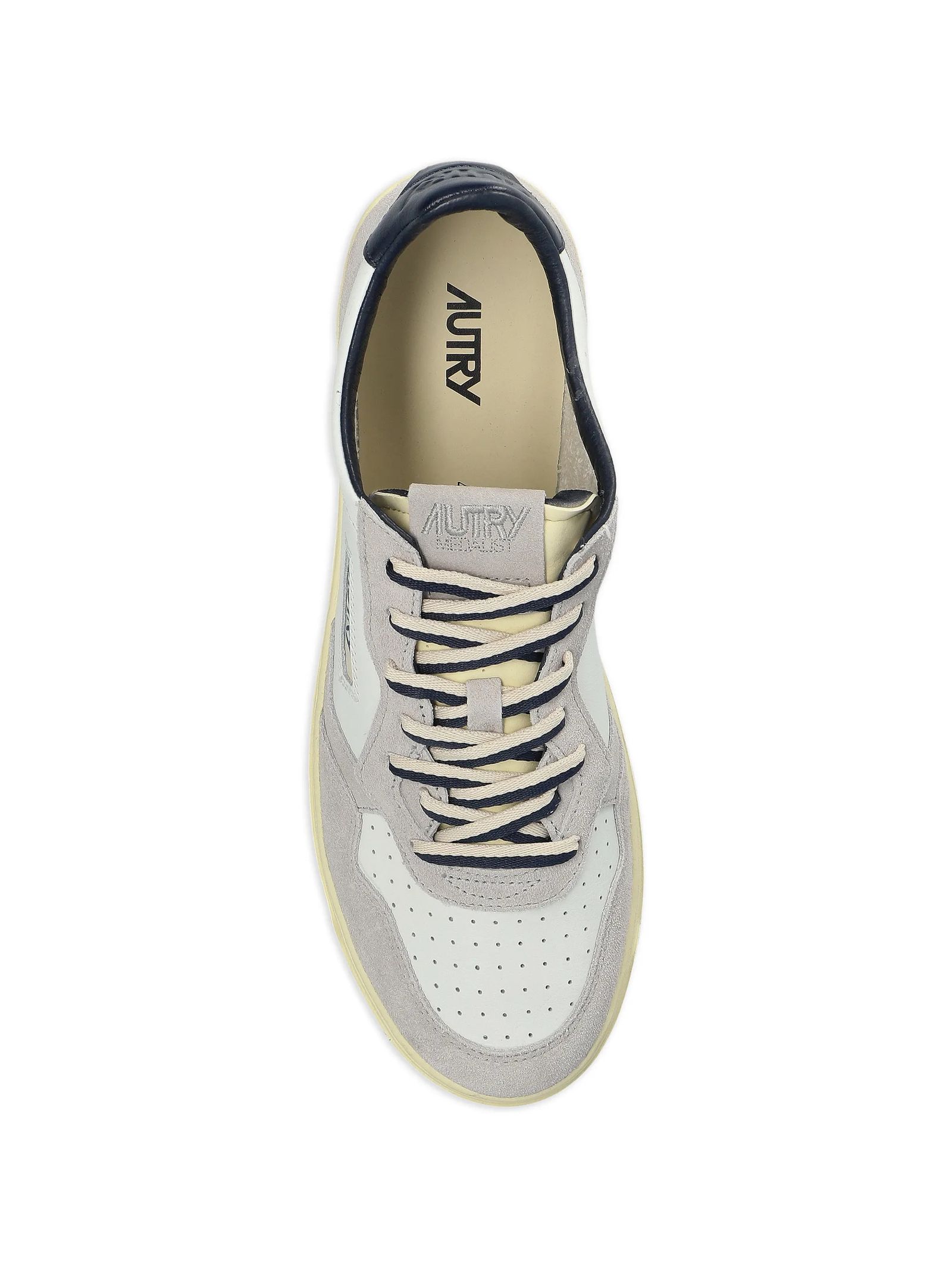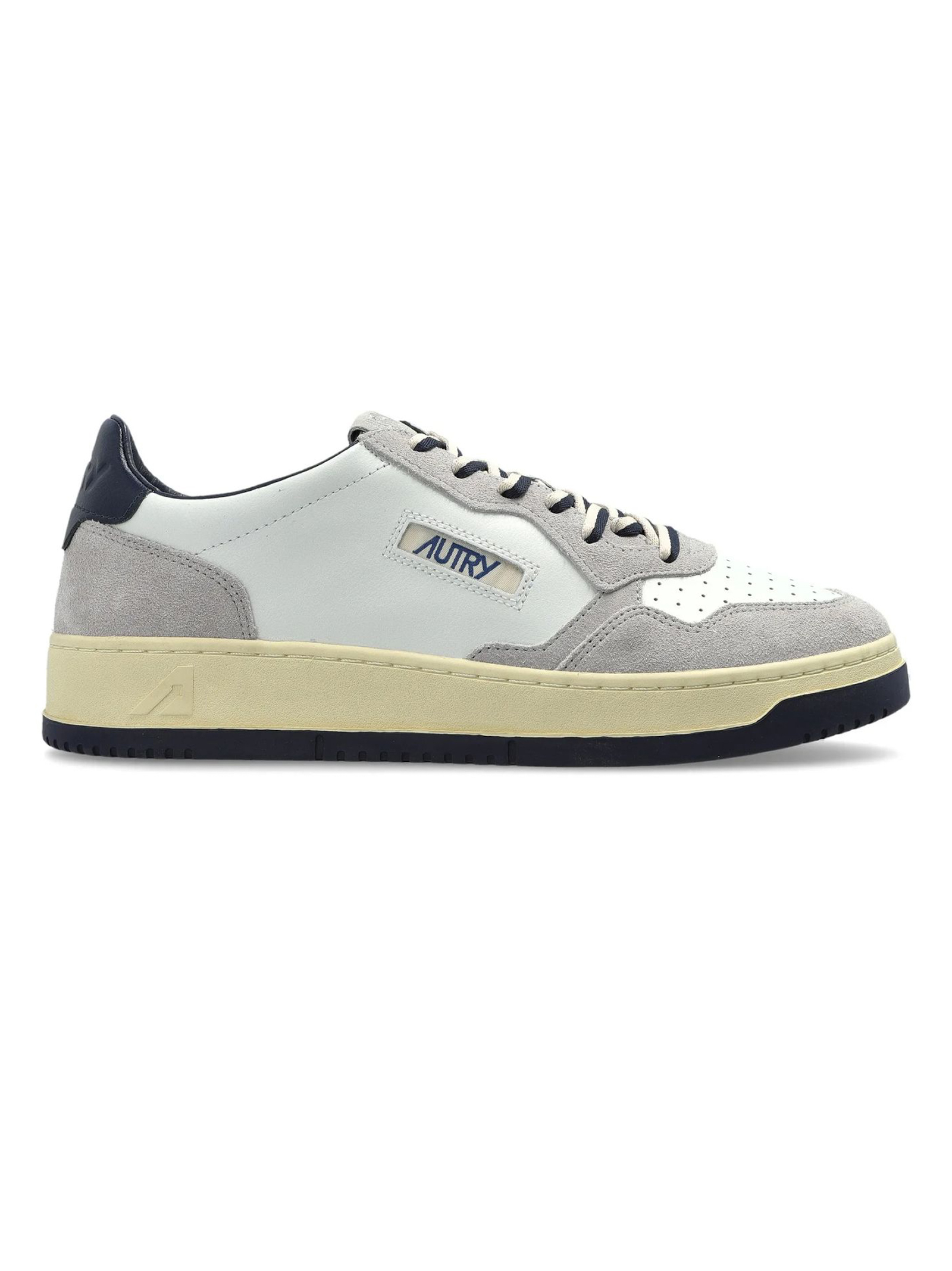 Medalist Low Sneakers in White Leather and Gray Suede, Toe cap with micro-perforations, Flat cotton laces, Embroidered label sewn onto the tongue, Padded collar, Leather and cotton terry lining, 2 cm raised leather insole, Rubber sole, Sole height: 2.5-3.5 cm