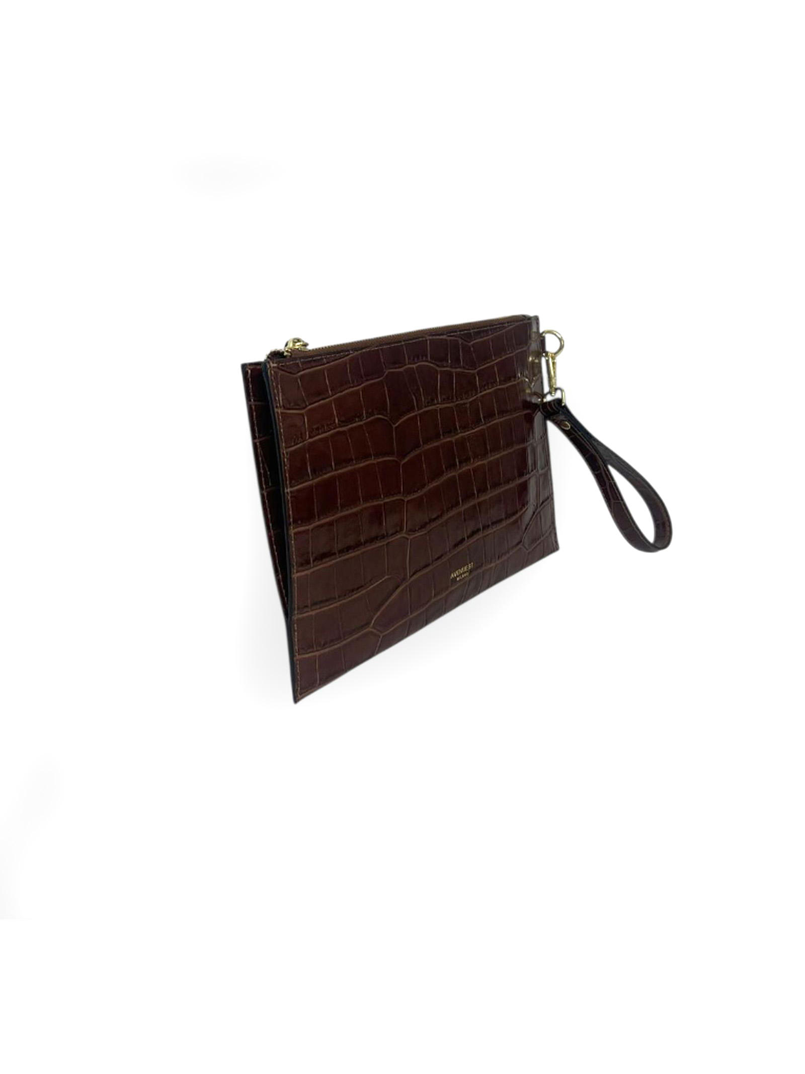 Croco bag in dark brown leather, semi-rigid with removable wrist strap, zip closure, single central compartment, internal zip pocket, double storage pocket, L.30 x H.20 x D.2