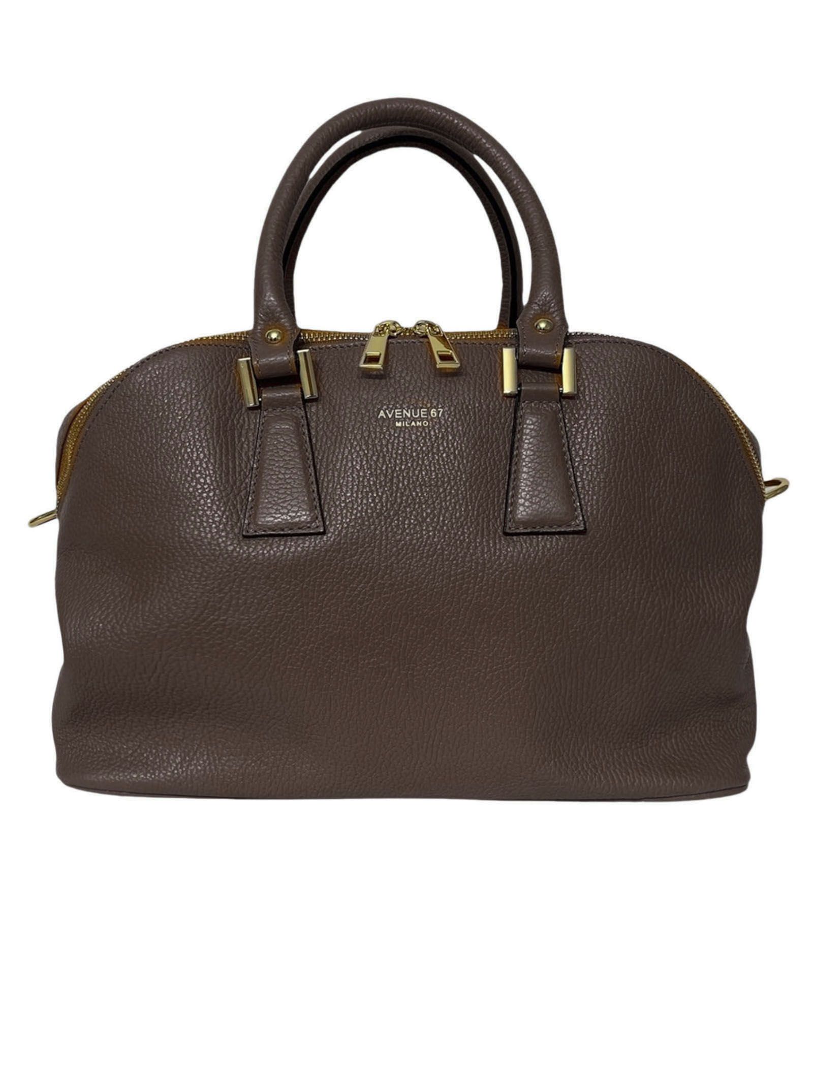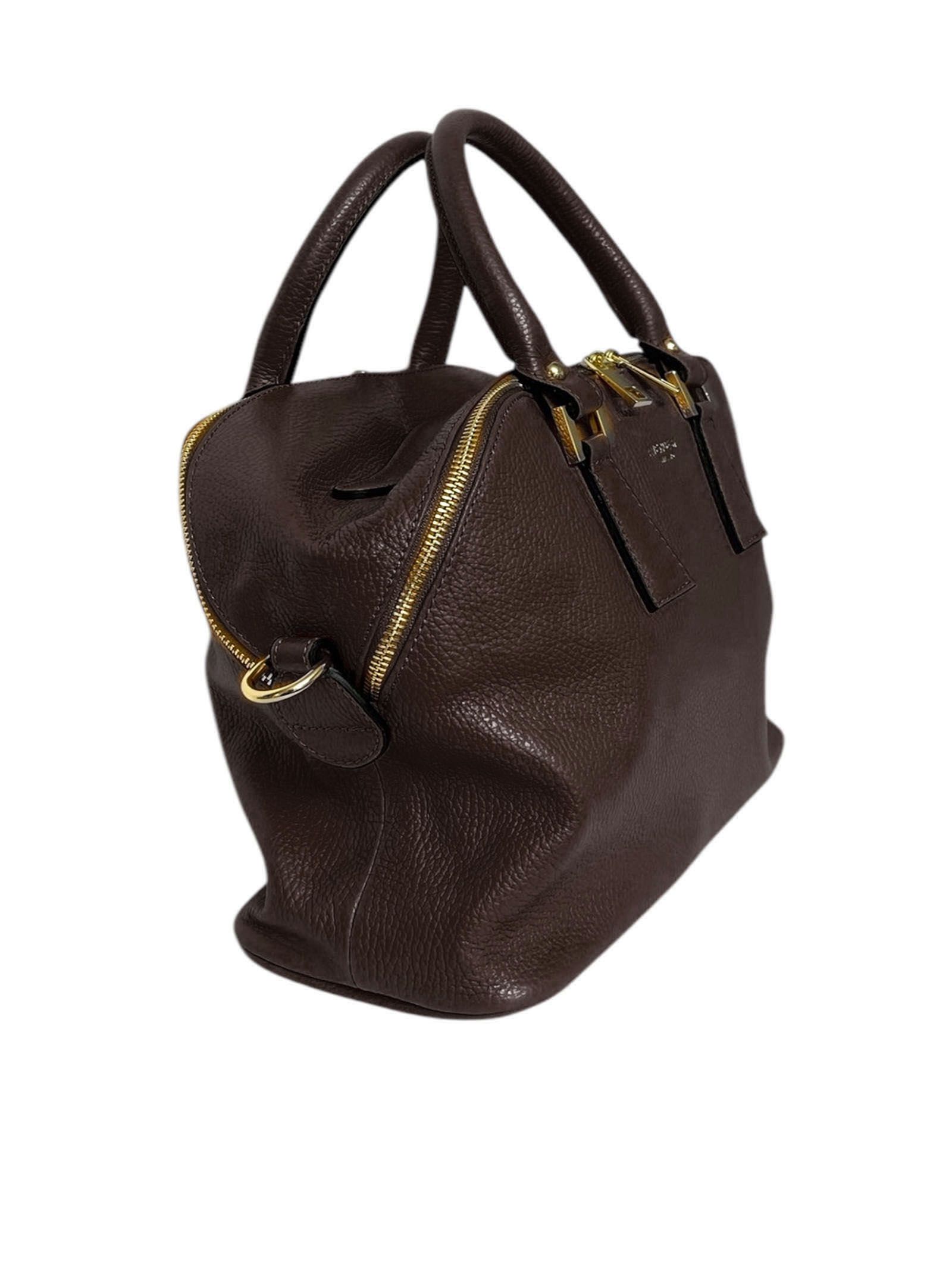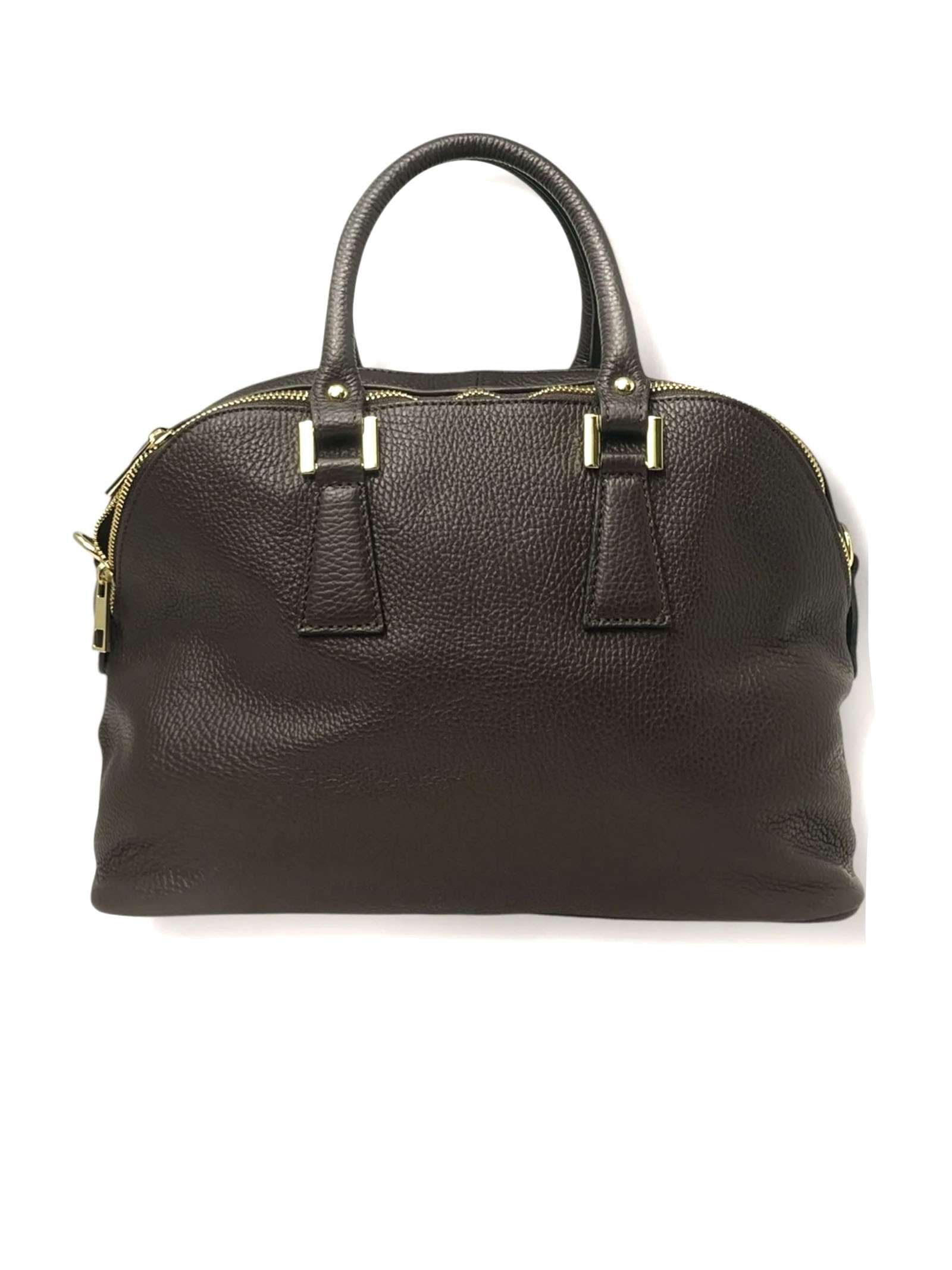 Dark brown grained soft leather bag, double handles, double zippered closure, interior zippered pocket and double slip pocket with flap, single interior compartment, removable and adjustable shoulder strap maximum length 128 cm, W.35 H.24 D.14