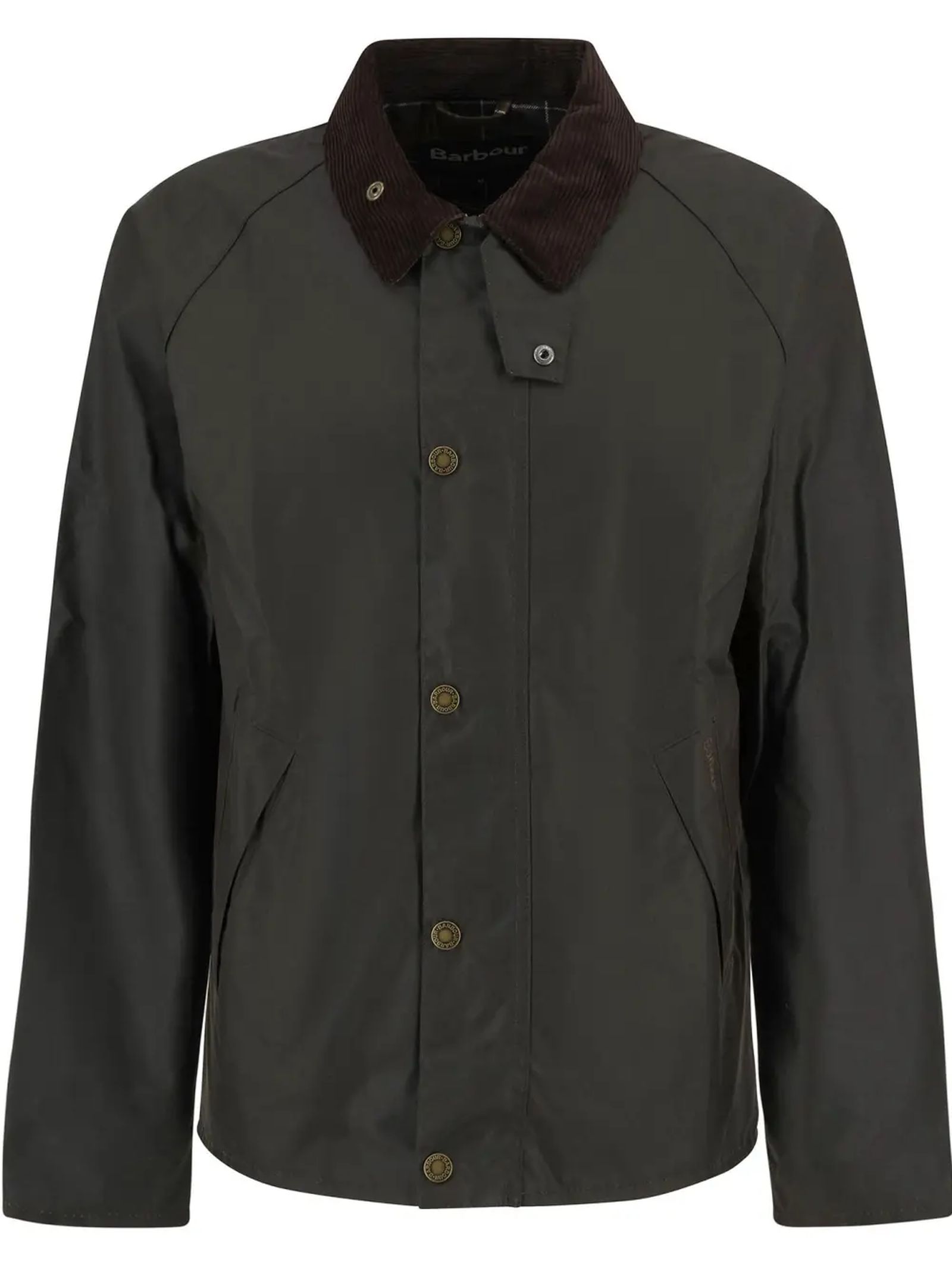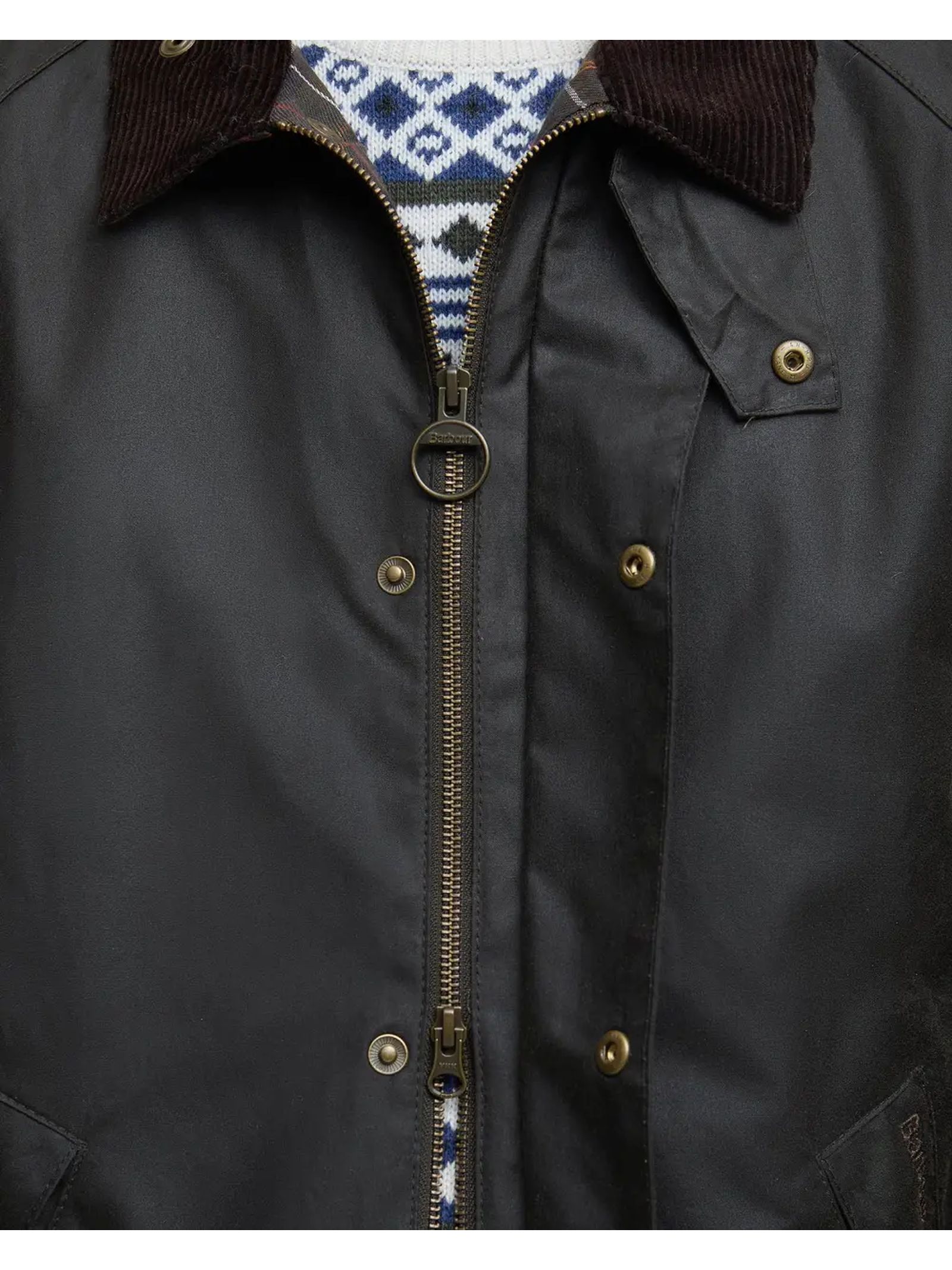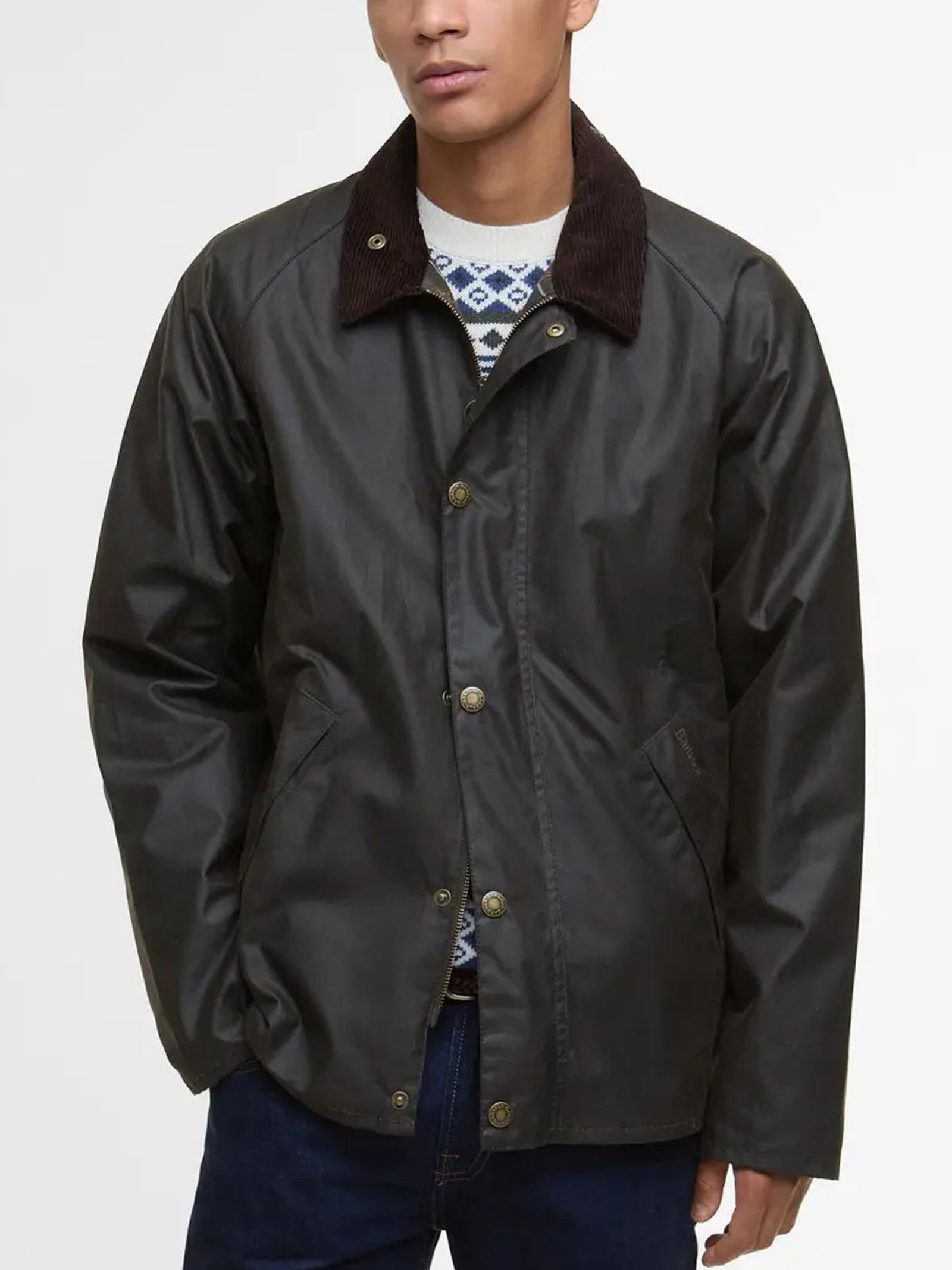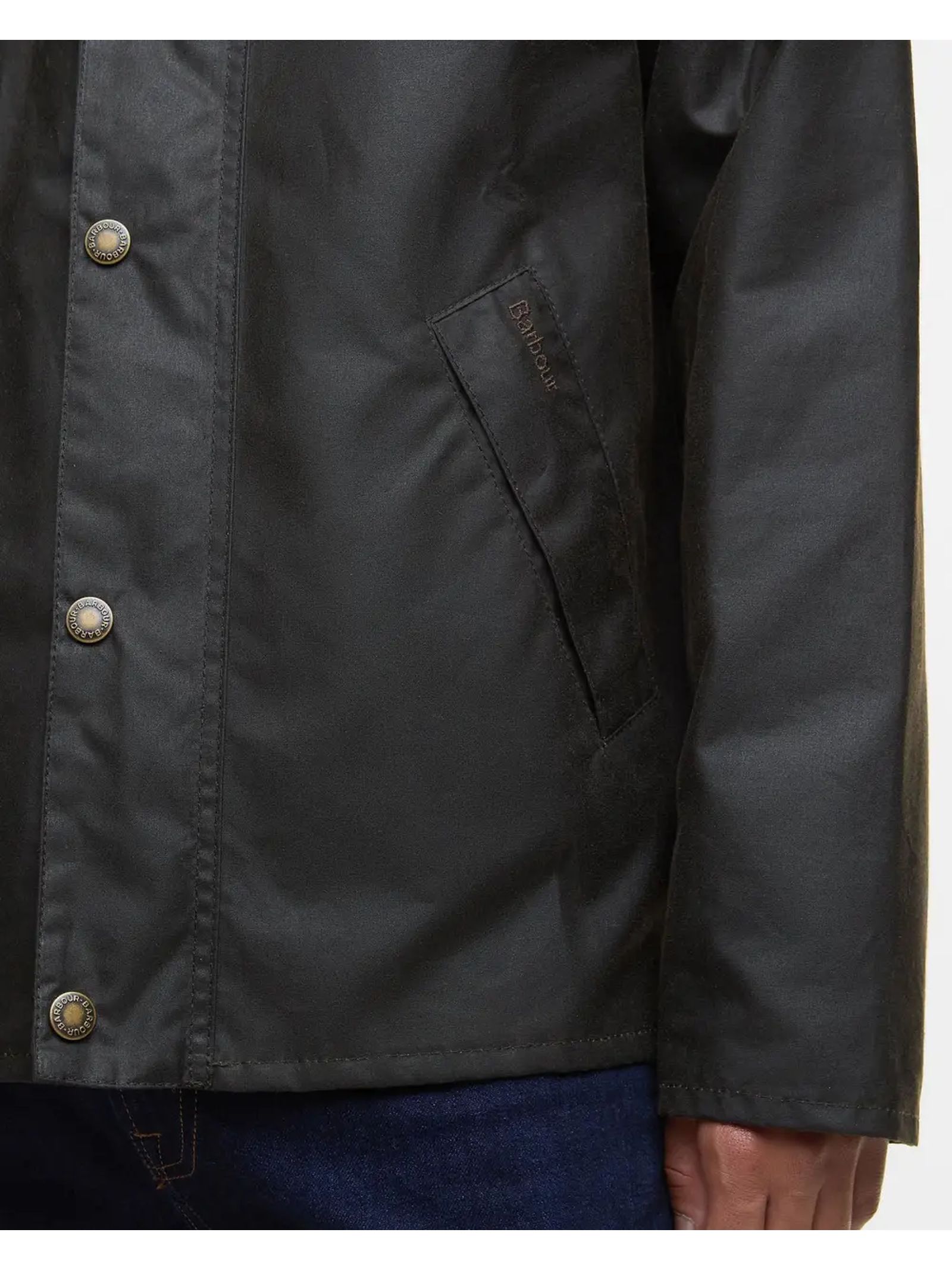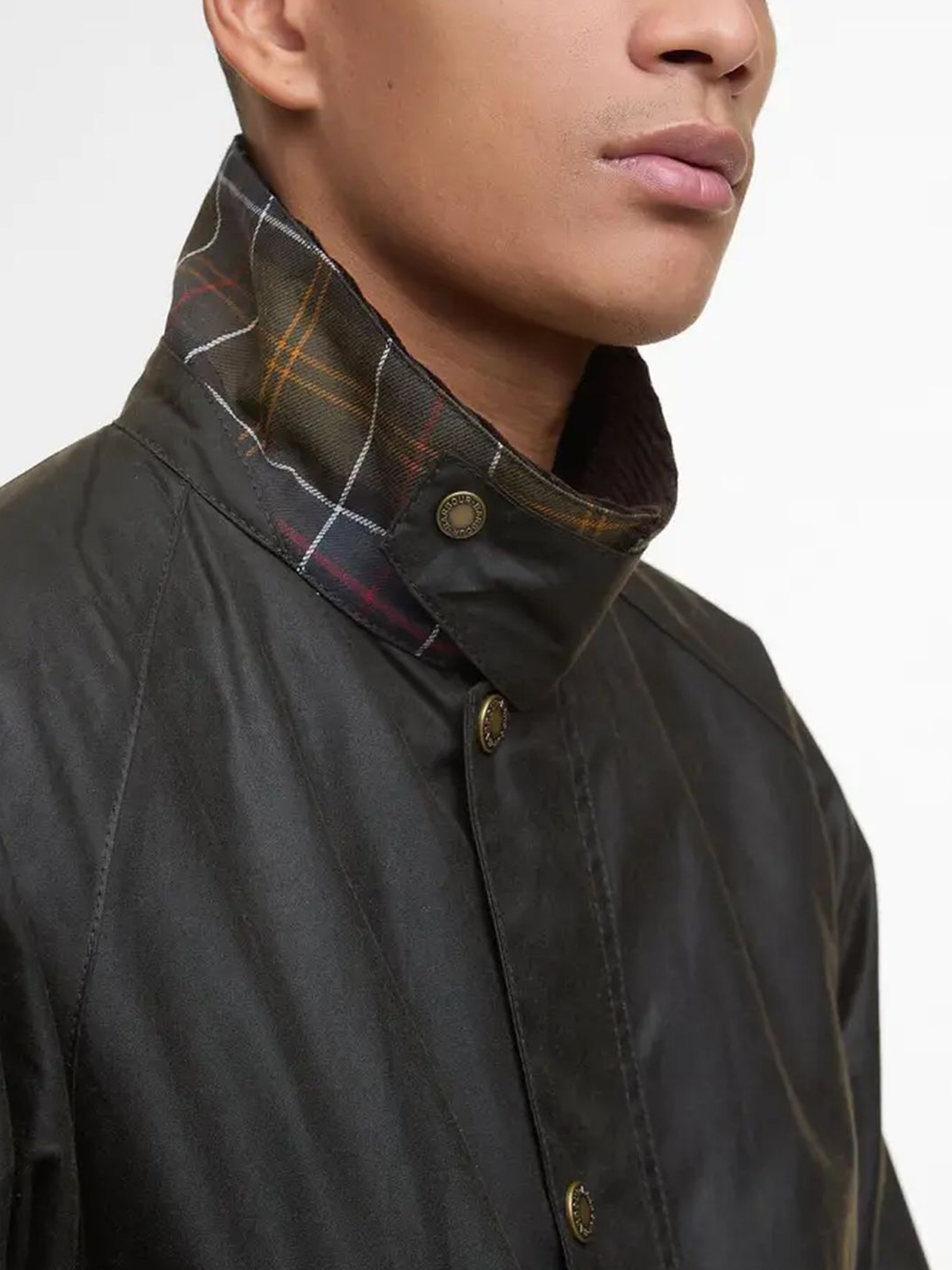Olive waxed cotton jacket with zip and stud front placket. This style features lower storm welt pockets, cord collar with throat flap and cotton tartan lining