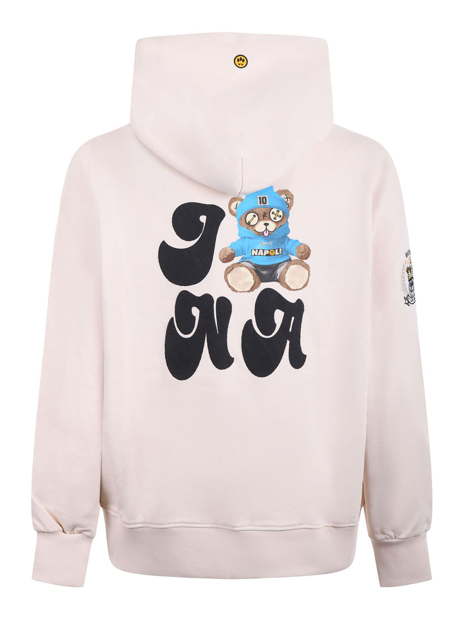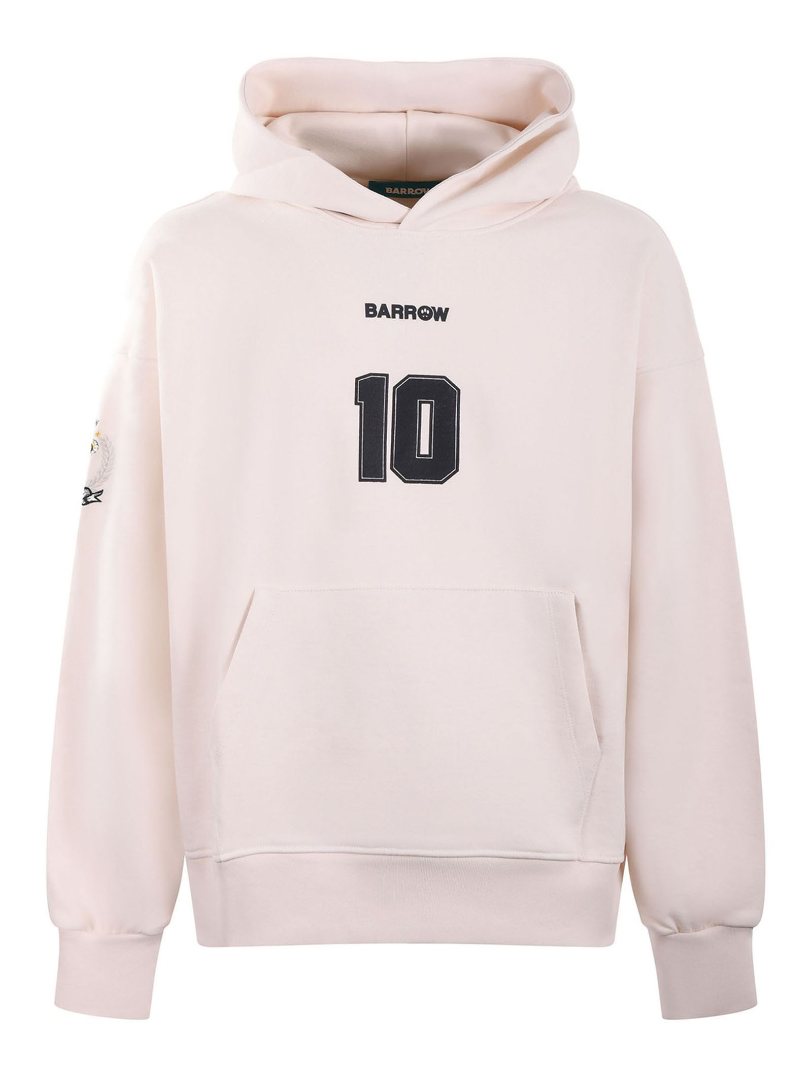 Beige cotton hoodie with contrasting BARROW logo on the chest, kangaroo pocket and mini smile patch on the hood, print on the back