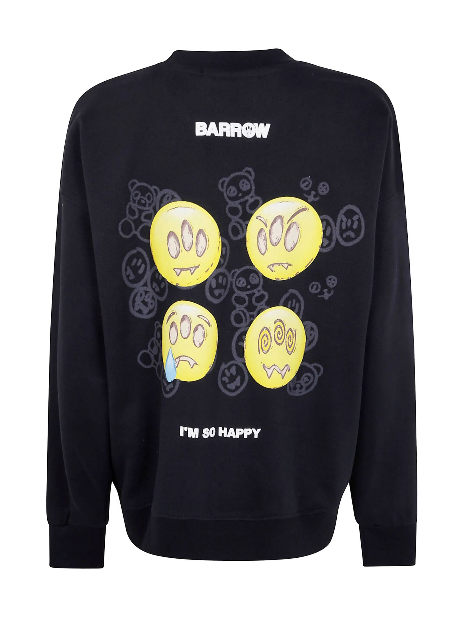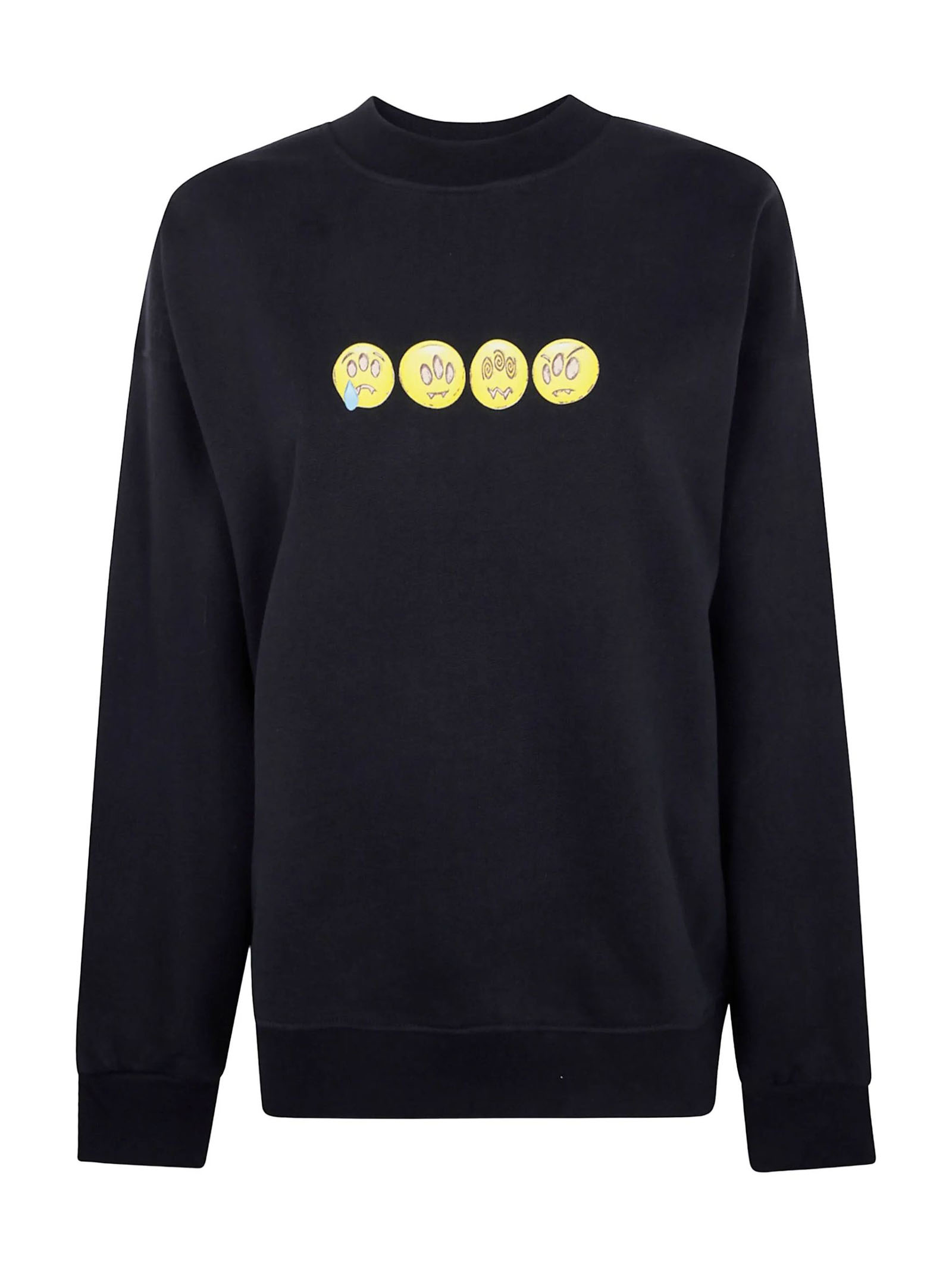 Black cotton sweatshirt featuring emoticon print, crew neck, long sleeves, 'I'm So Happy' text