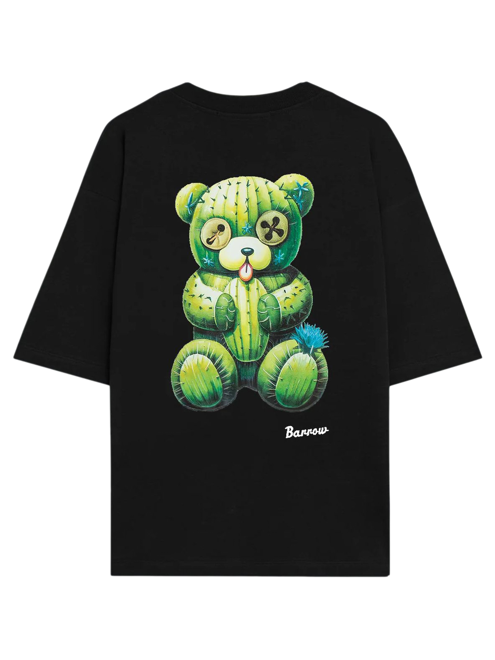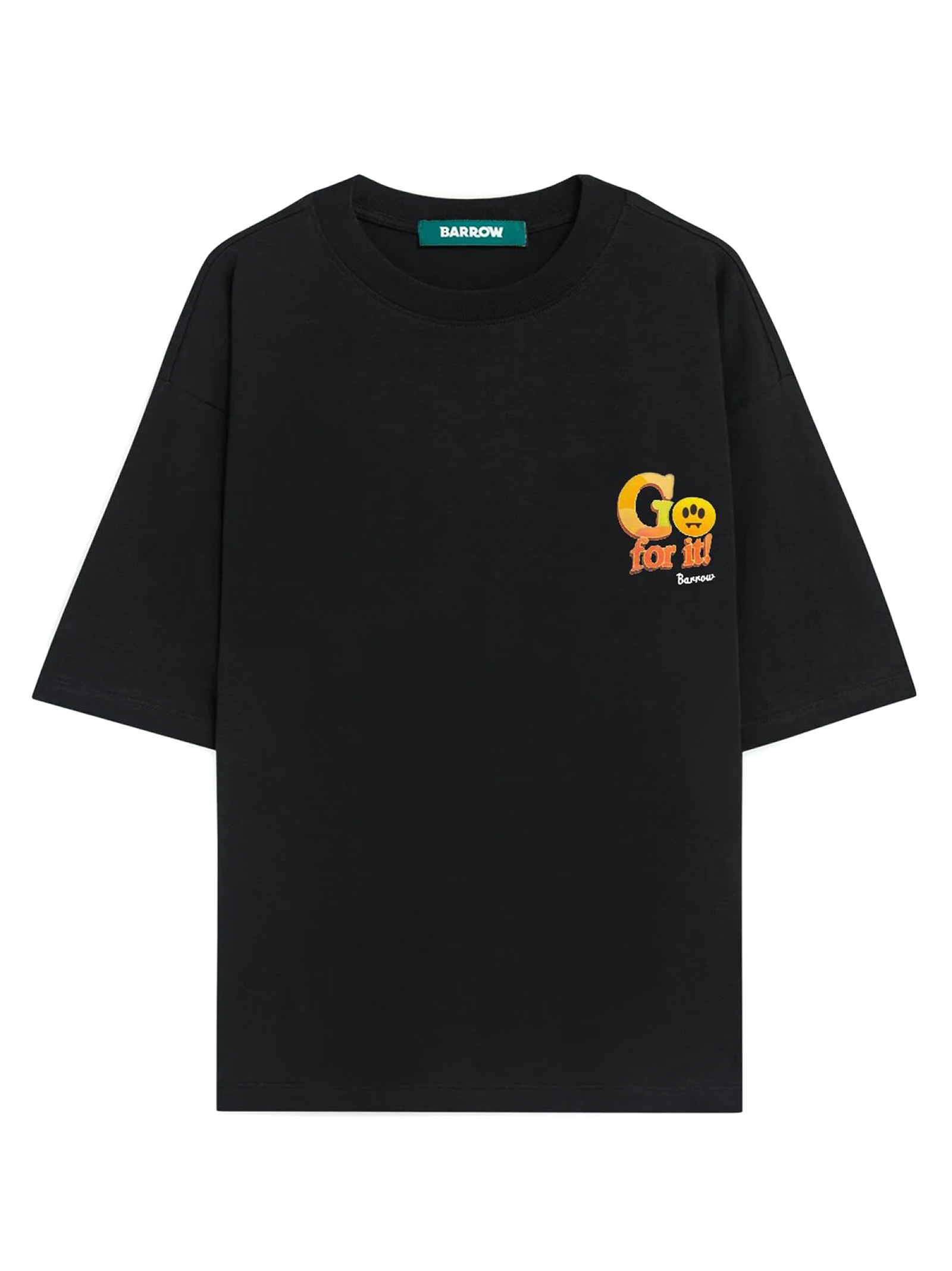 Black cotton T-shirt with a relaxed fit, a crew neck, and short sleeves. The front features a small contrasting Go for it! Barrow print on the chest