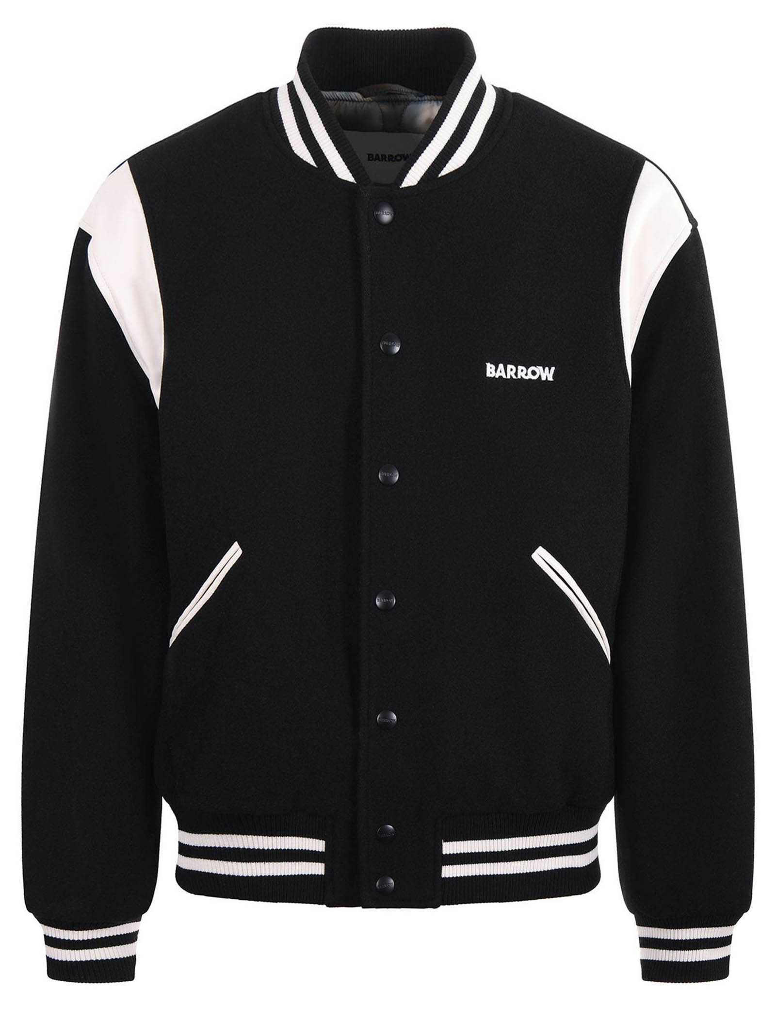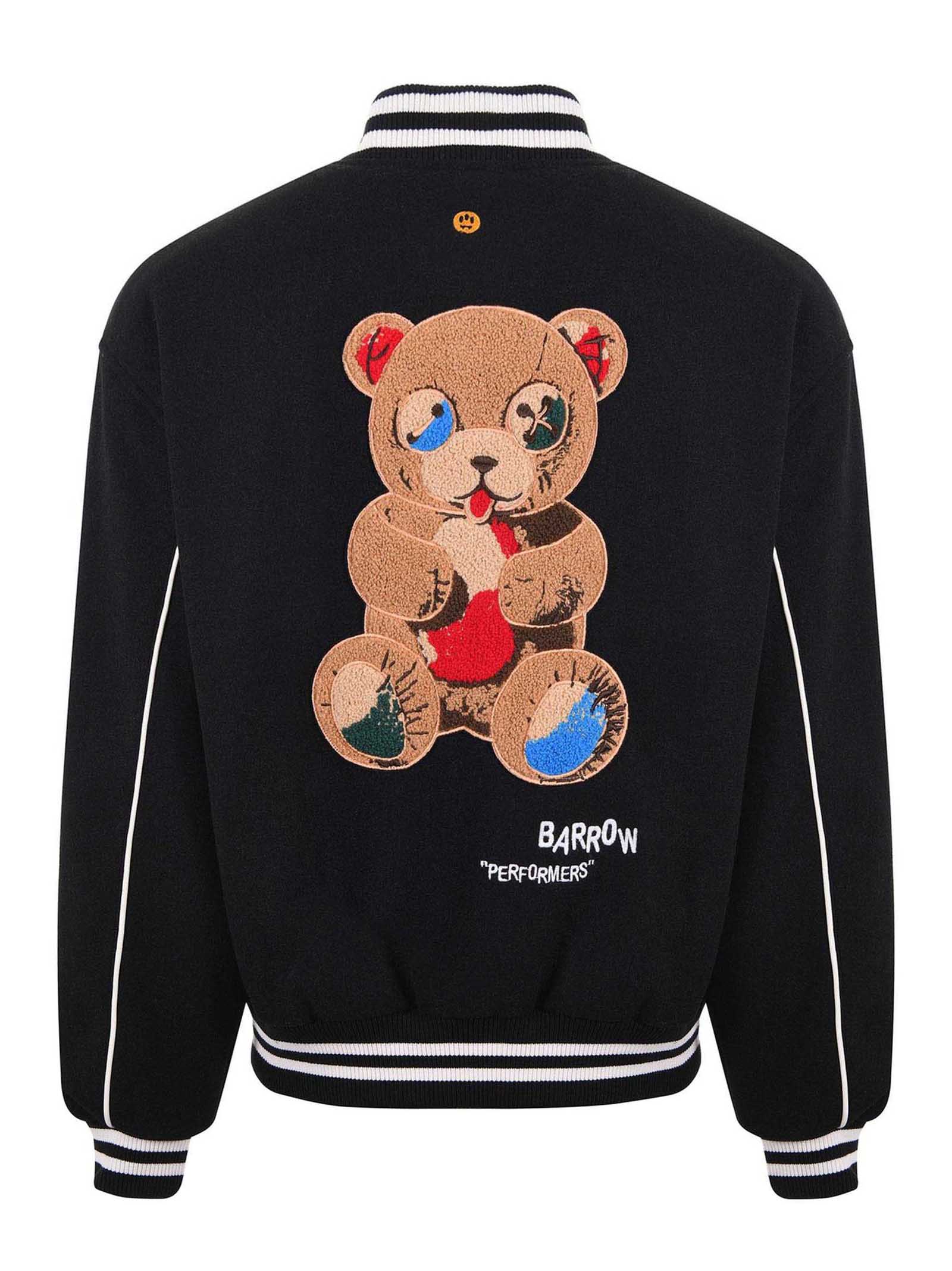 Varsity jacket with faux leather sleeves and details, Barrow logo embroidered on the chest, Large embroidered patch on the back with bear and Barrow Performers lettering, Ribbed striped collar, hem and cuffs