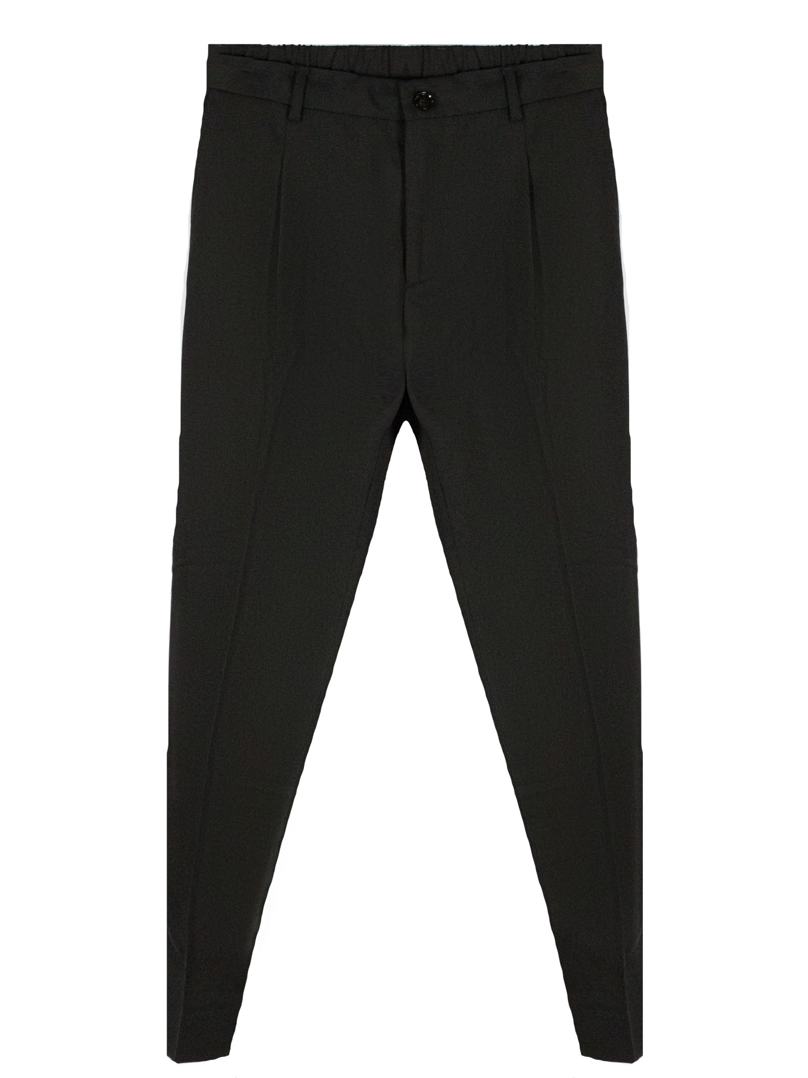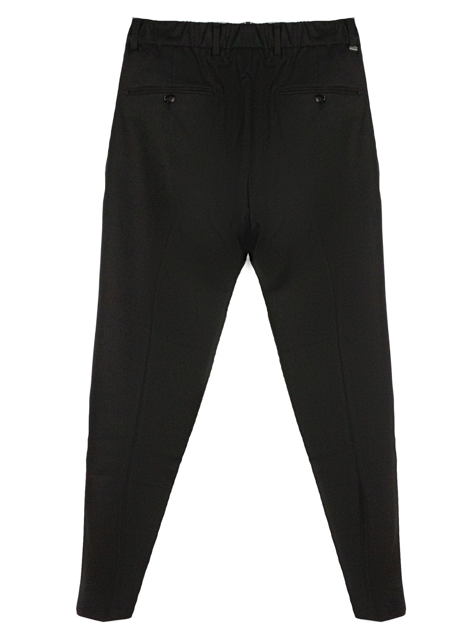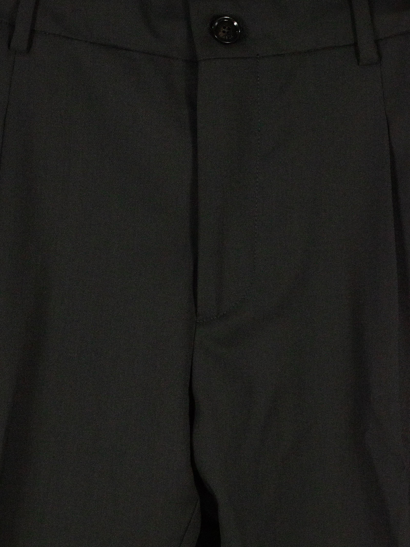 Black virgin wool blend Riccardo trousers in with drawstring, front button and zip fastening, belt loops, side pockets, back pockets, pleats