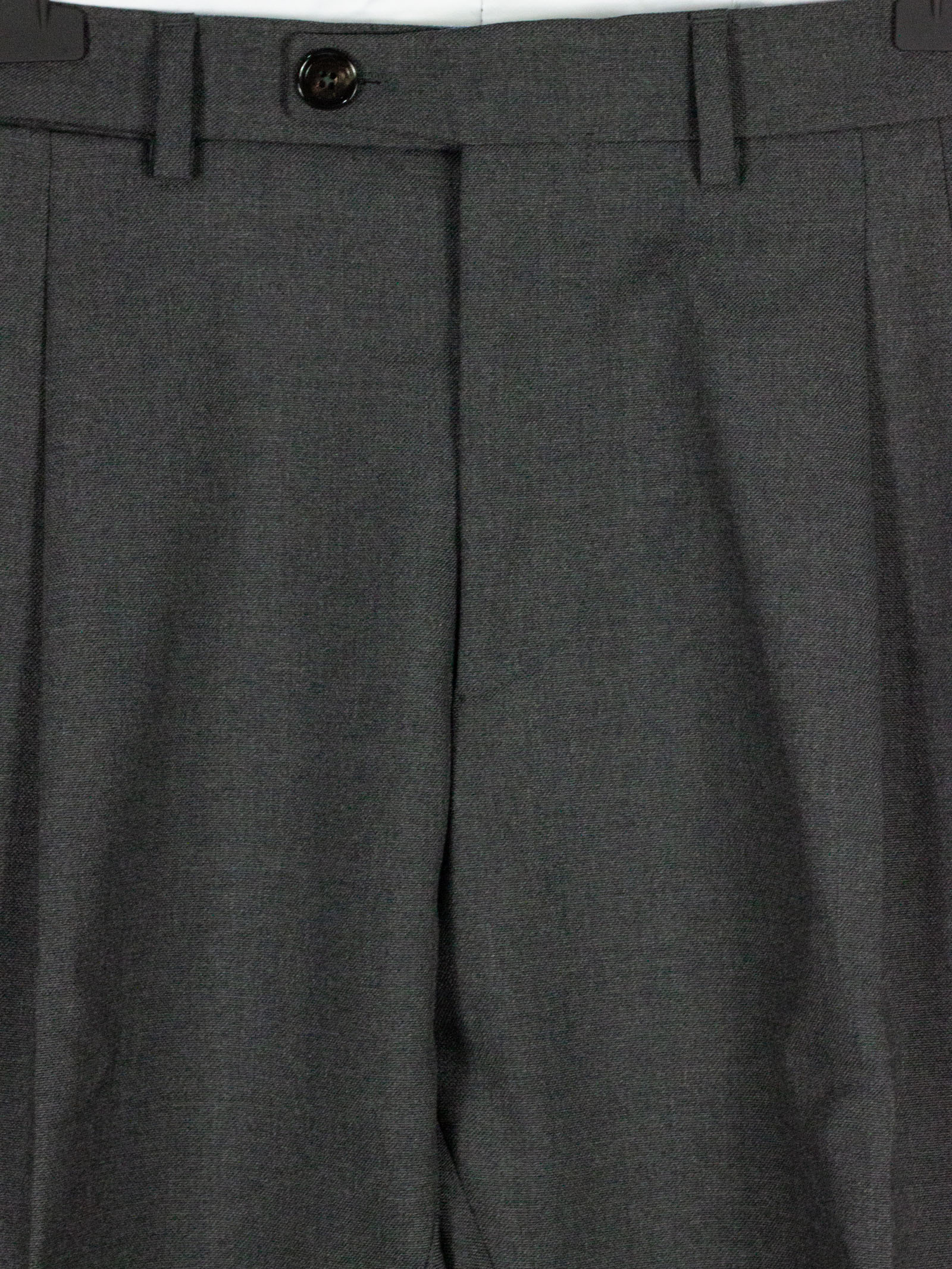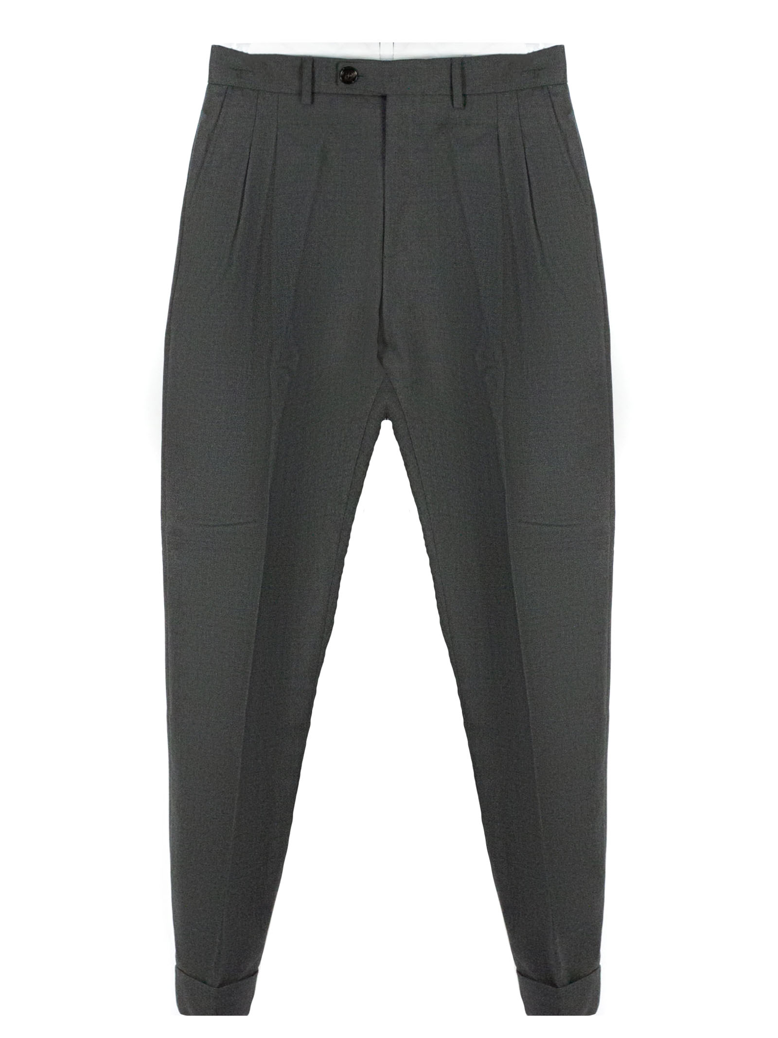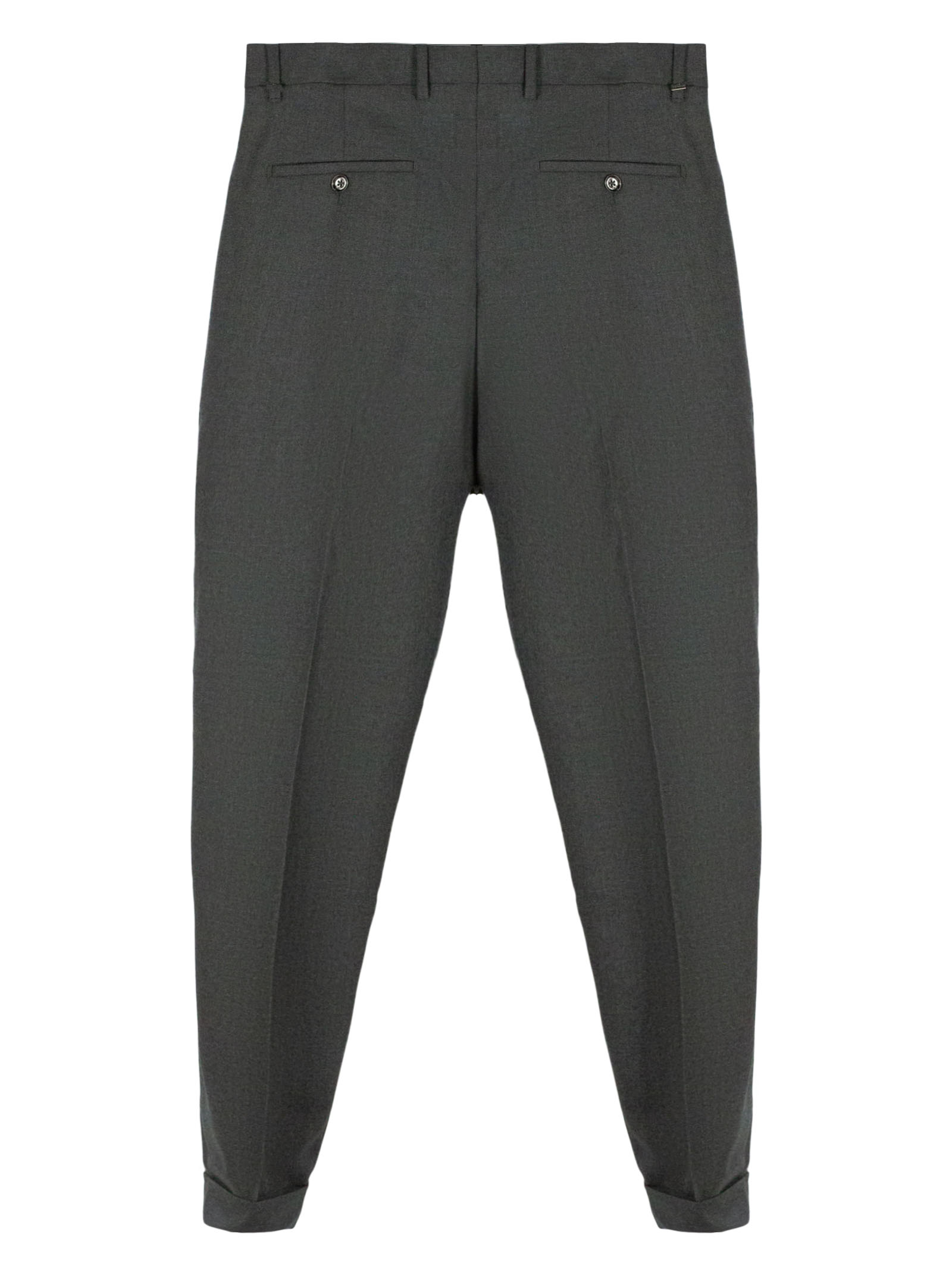 Grey melange virgin wool Robert trousers with front zip and button fastening, pleats, side pockets, back pockets with buttons