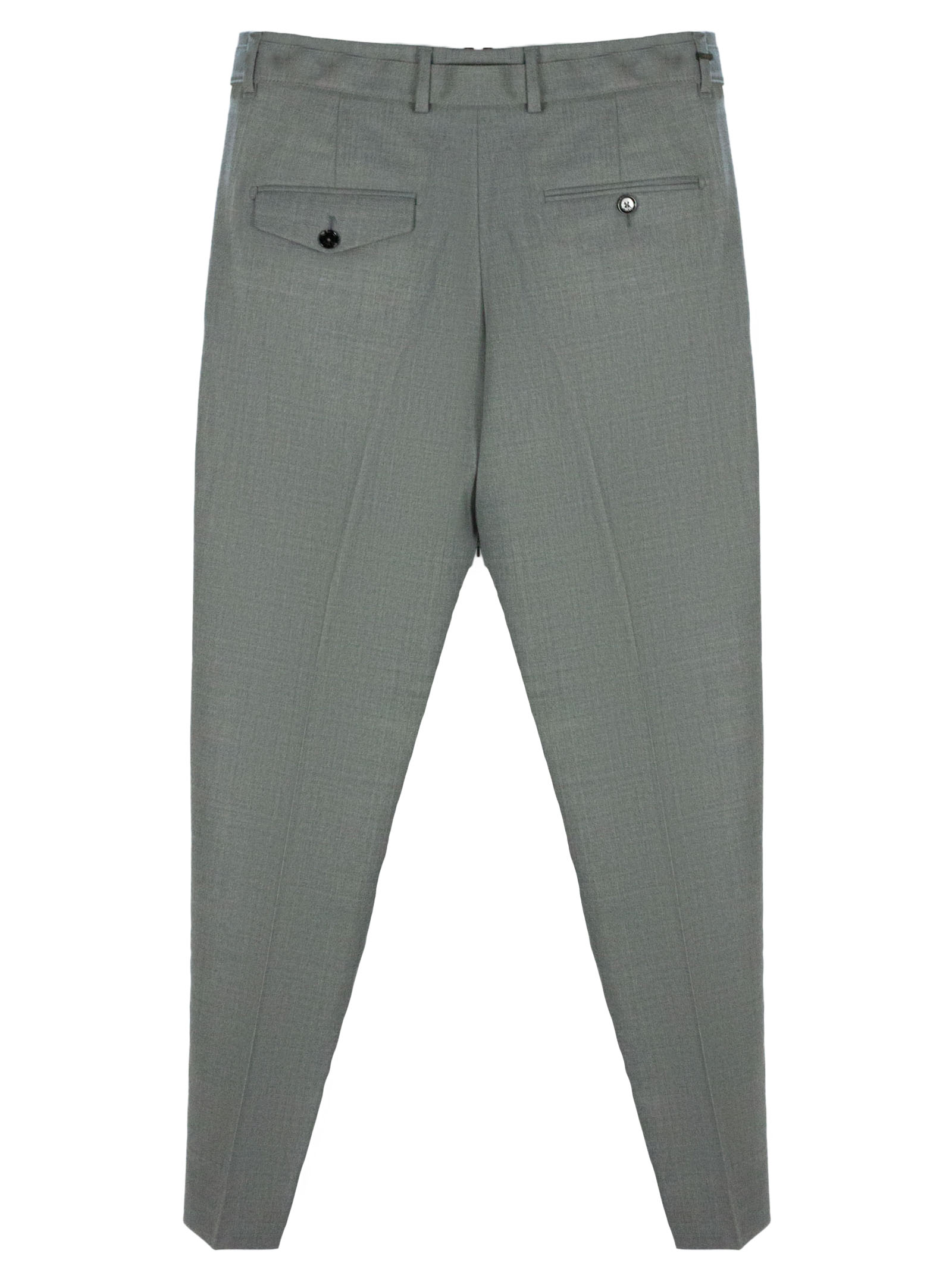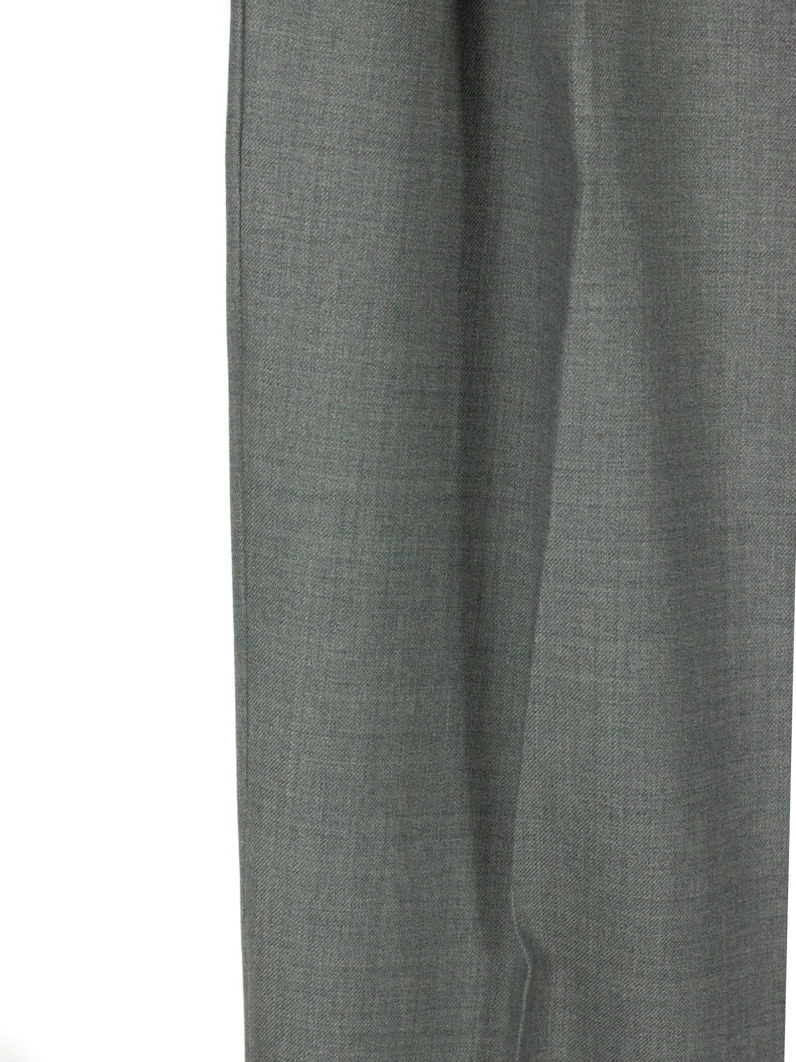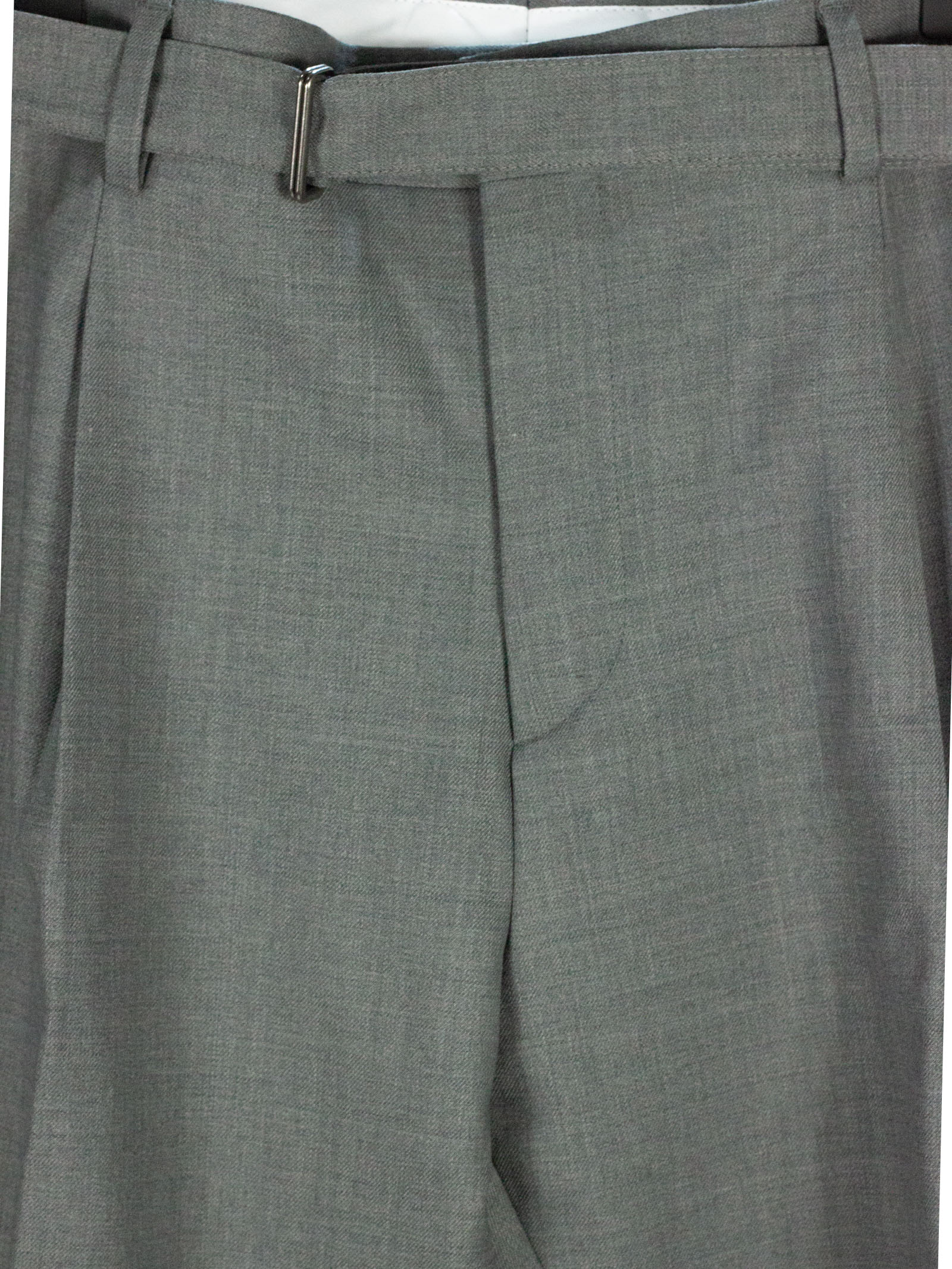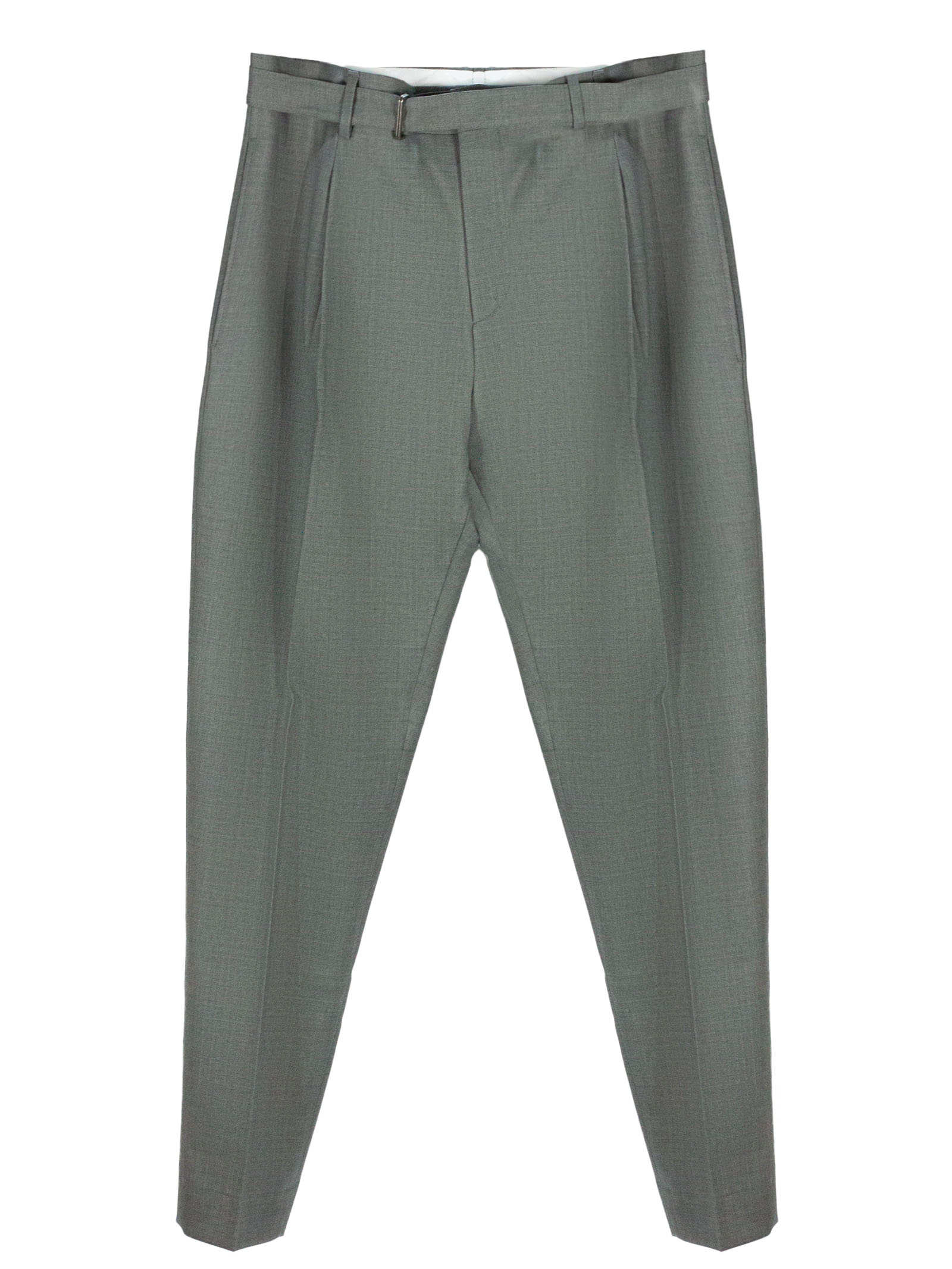 Grey virgin wool blend Riccardo trousers in with drawstring, front button and zip fastening, belt loops, side pockets, back pockets, pleats