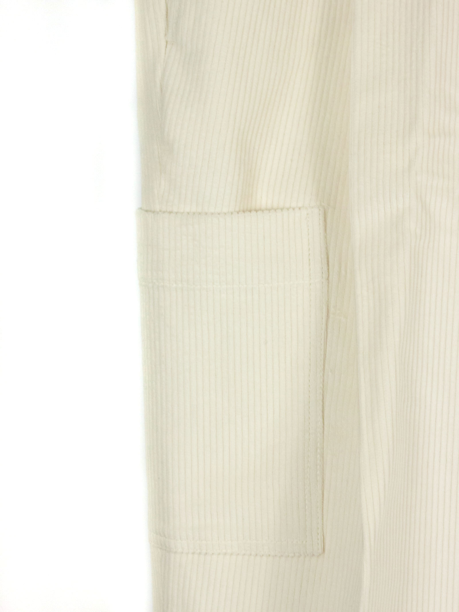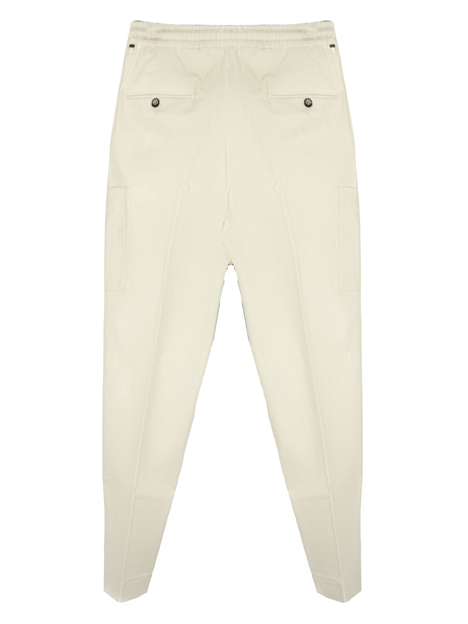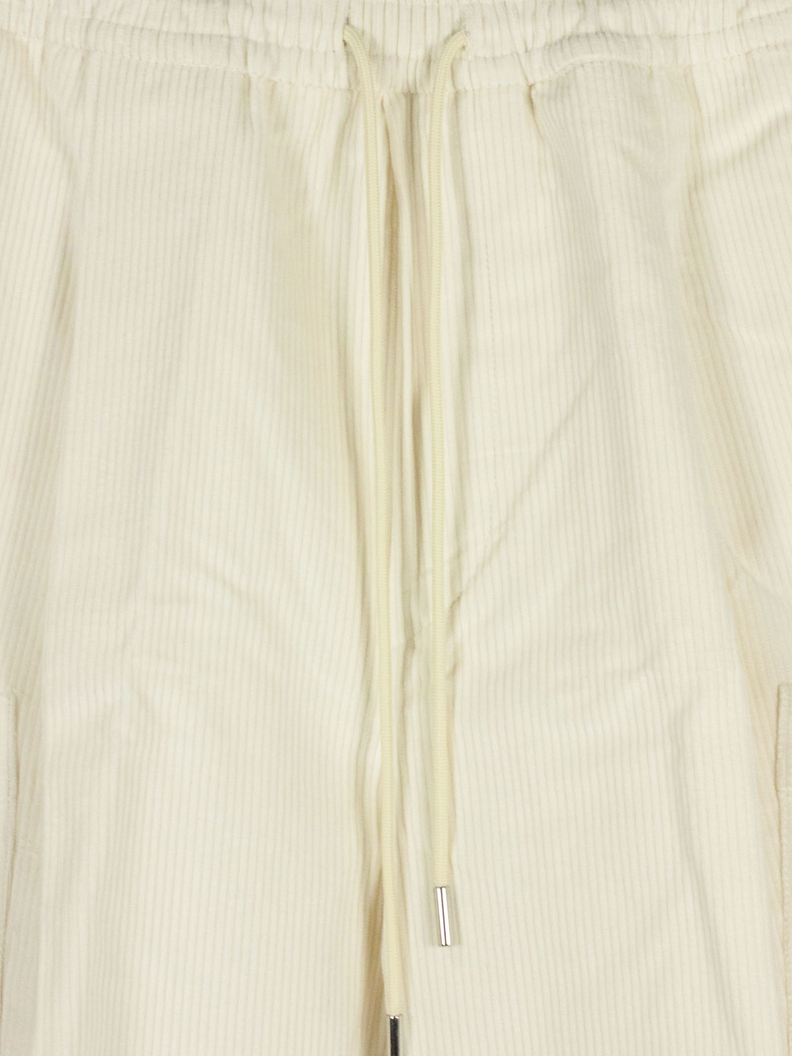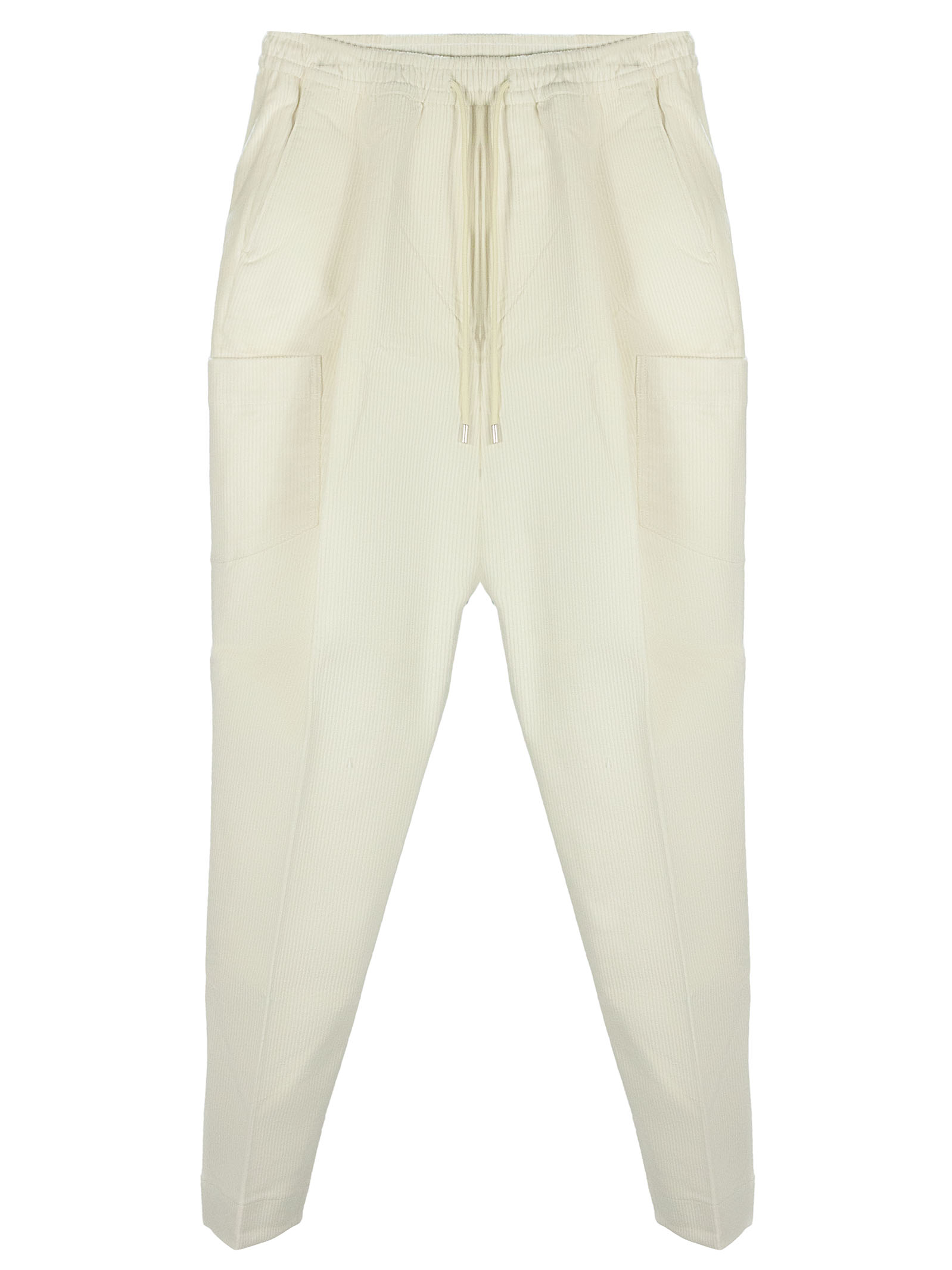White cotton Noah trousers with ribbed design, side pockets, back pockets, front drawstring, elasticated waistband