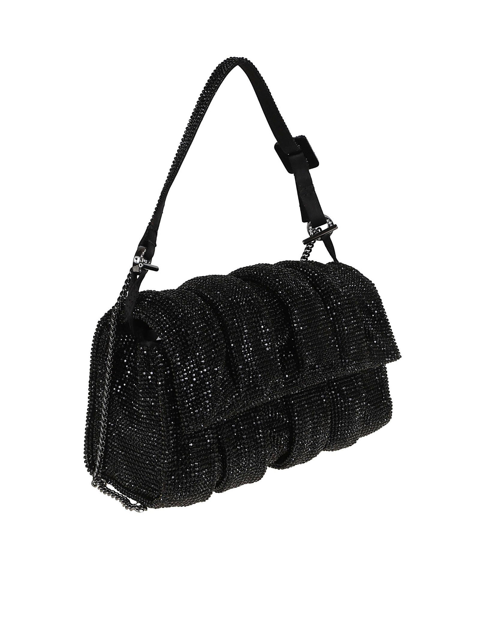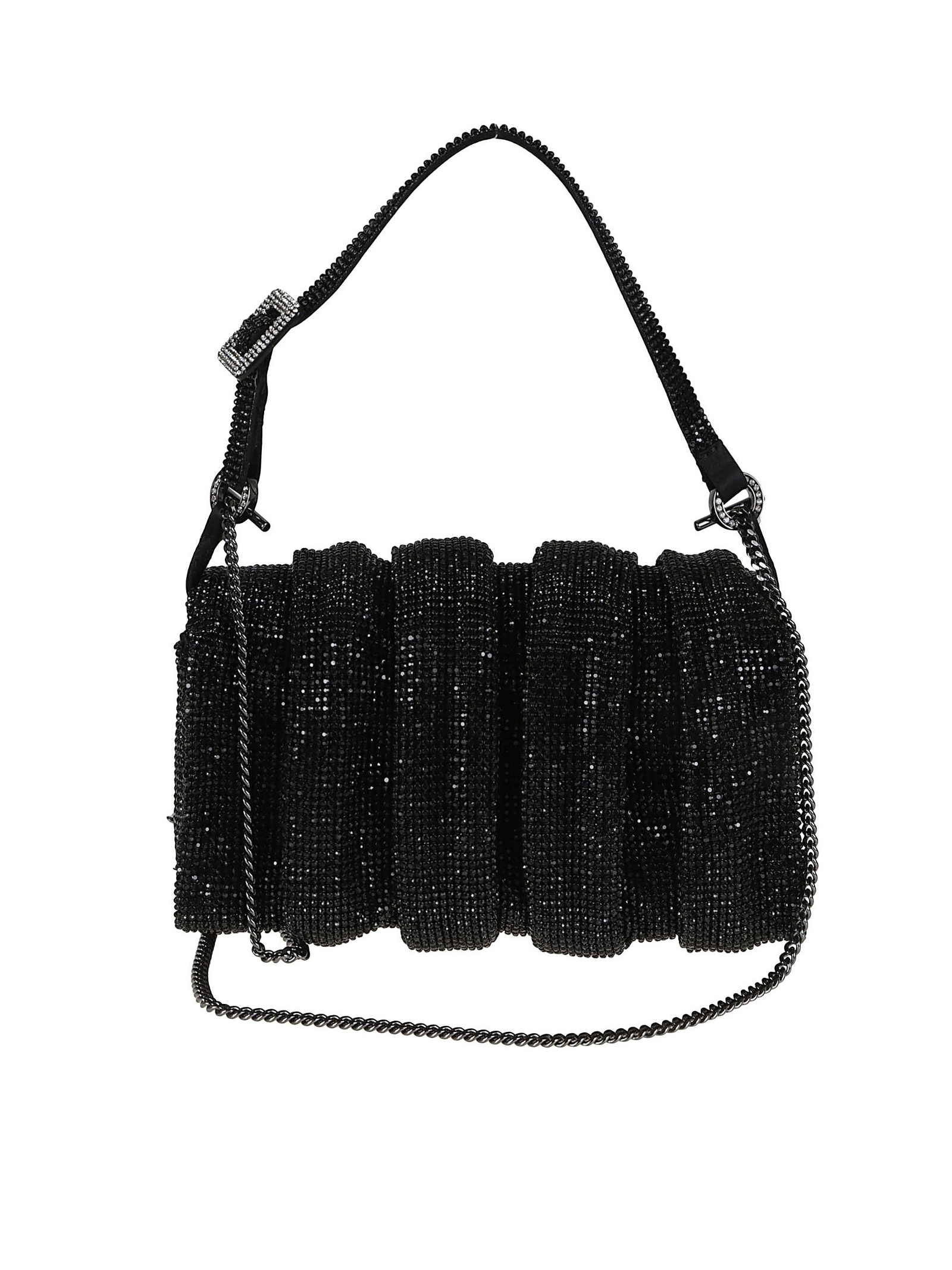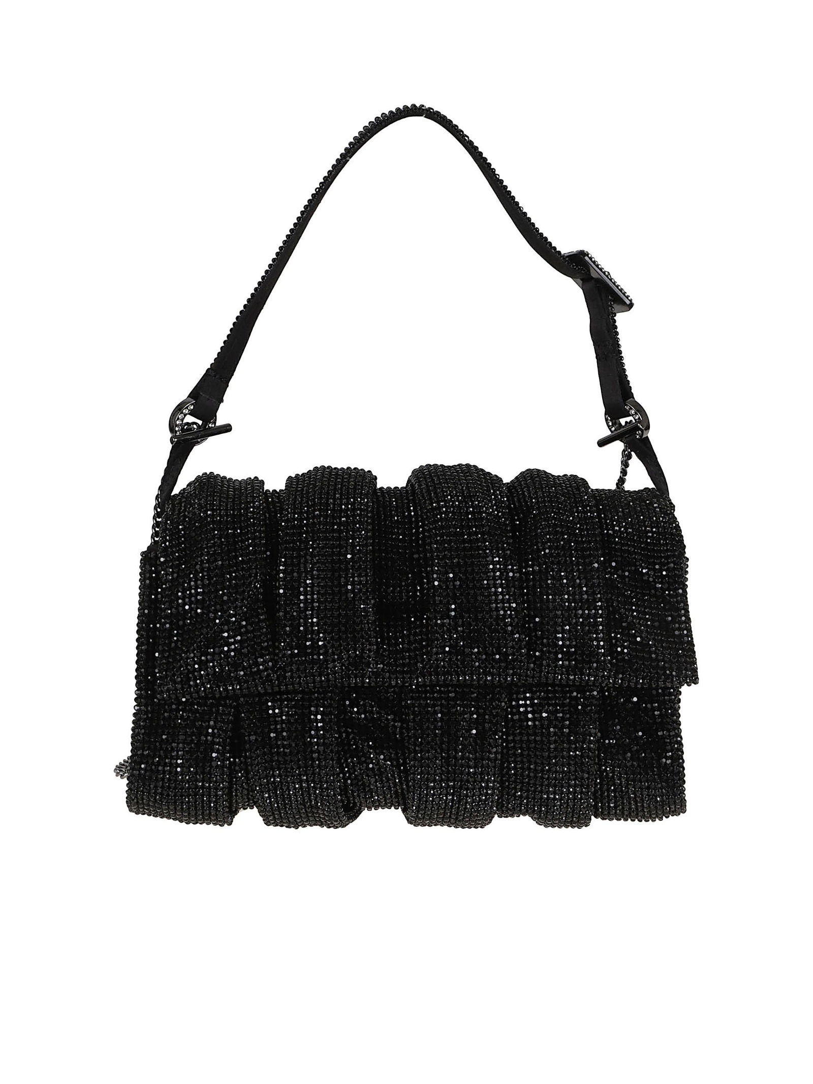 Iris James Bond Jet Black, made with a network of sparkling crystals sewn by hand, inside, a silk satin clutch bag, W20 x H11 x D8cm, aluminium mesh studded with crystal rhinestones, removable metal shoulder strap