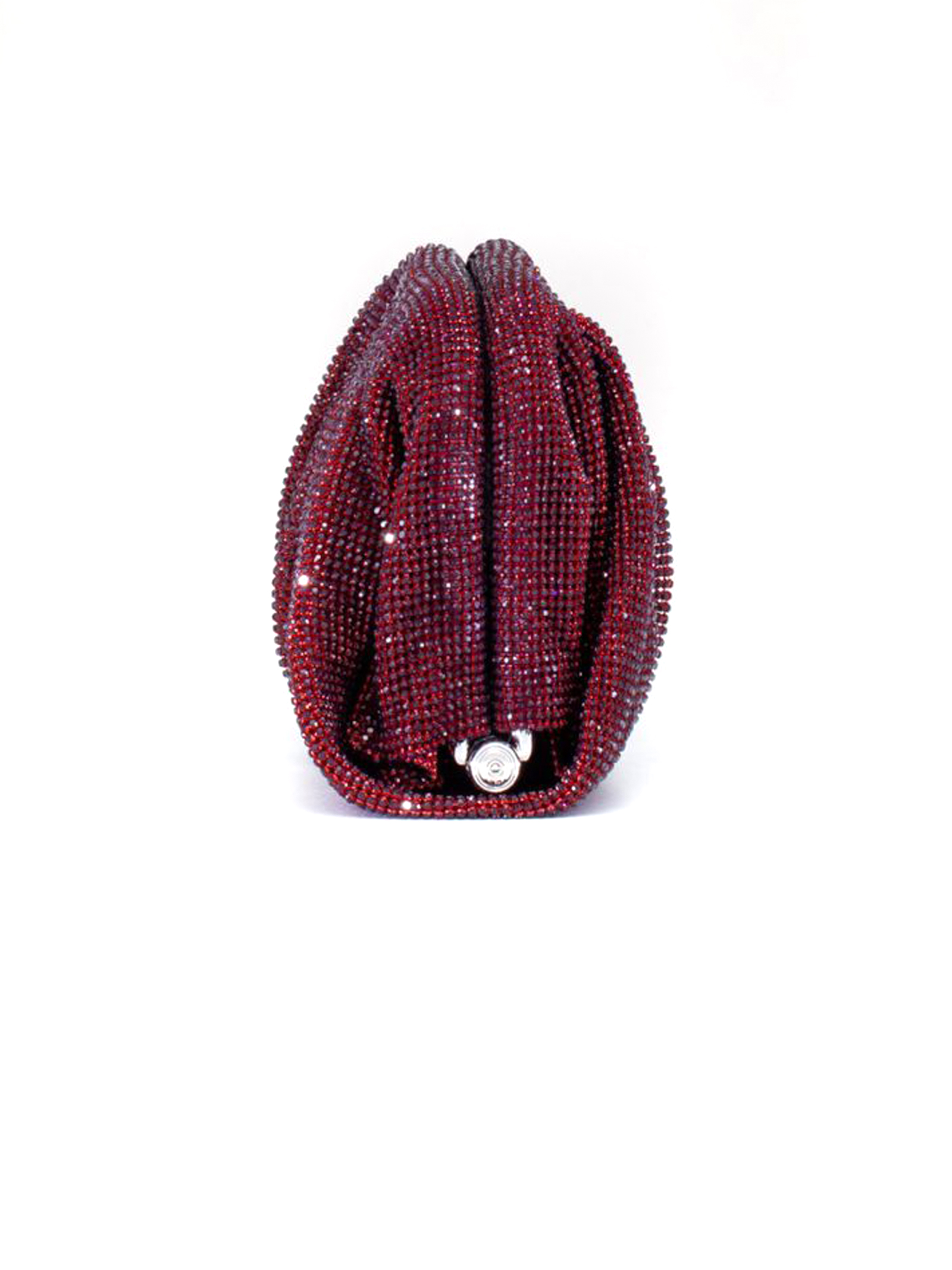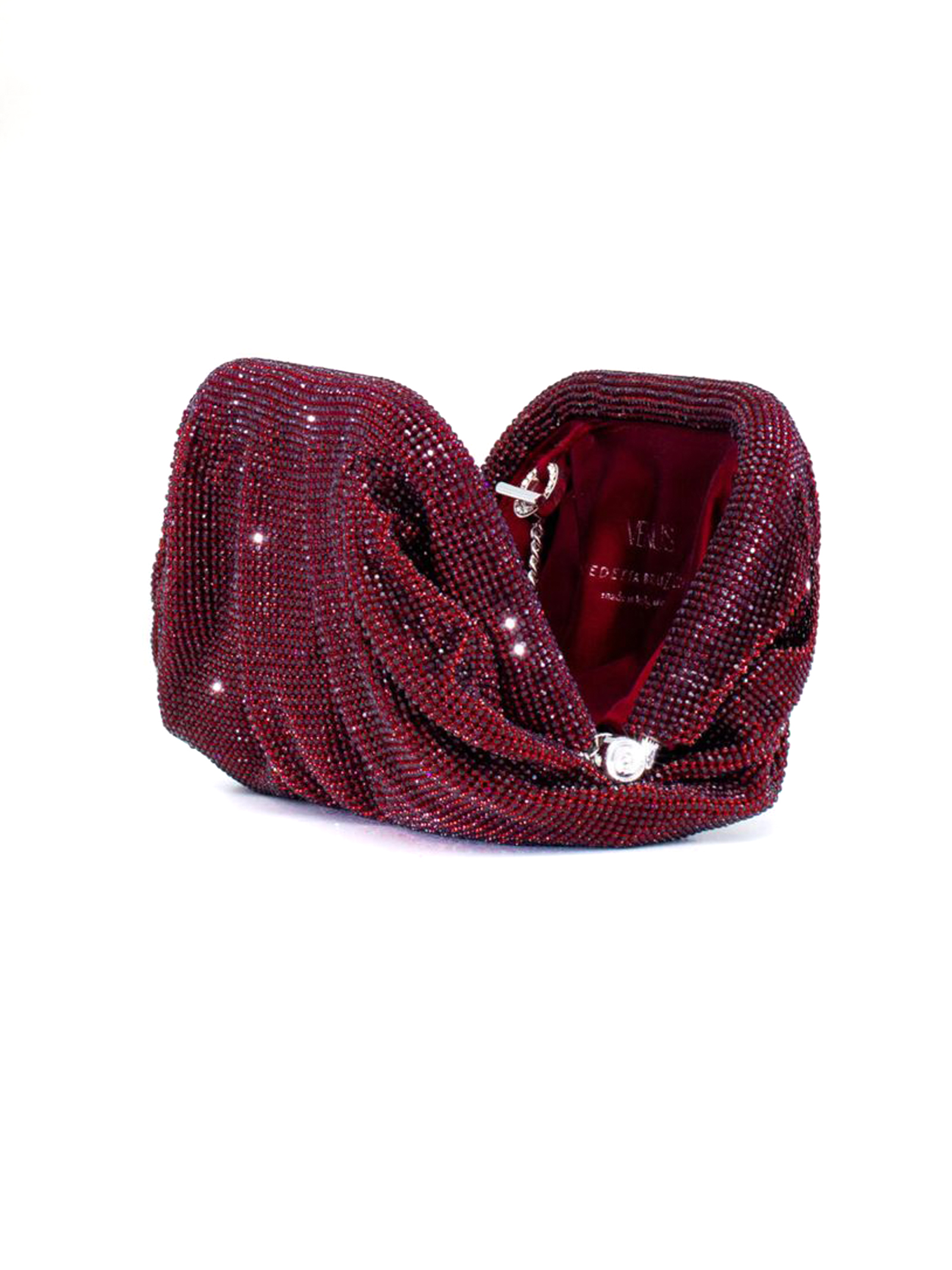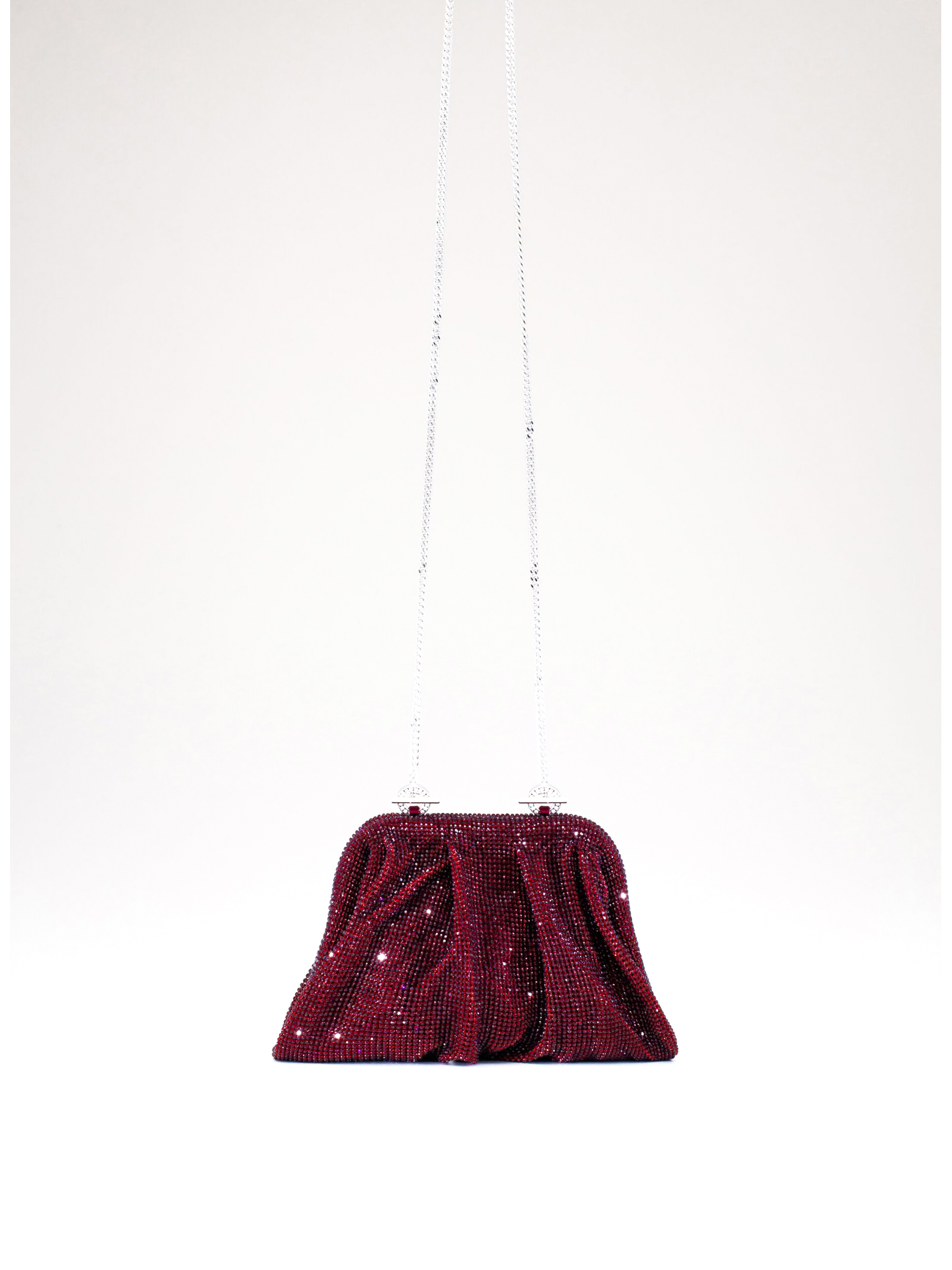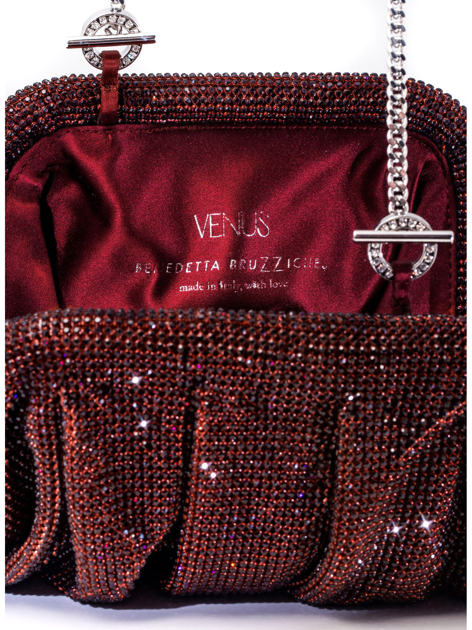 Venus La Petite Miss Dracula with a network of sparkling crystals, Inside, a silk satin clutch, Measures: H: 12cm X D: 5,5cm X W: 22cm, Aluminium mesh studded with crystal rhinestones, Detachable metal chain shoulder strap, External: 100% Metal MeshInternal: 100% Silk Satin