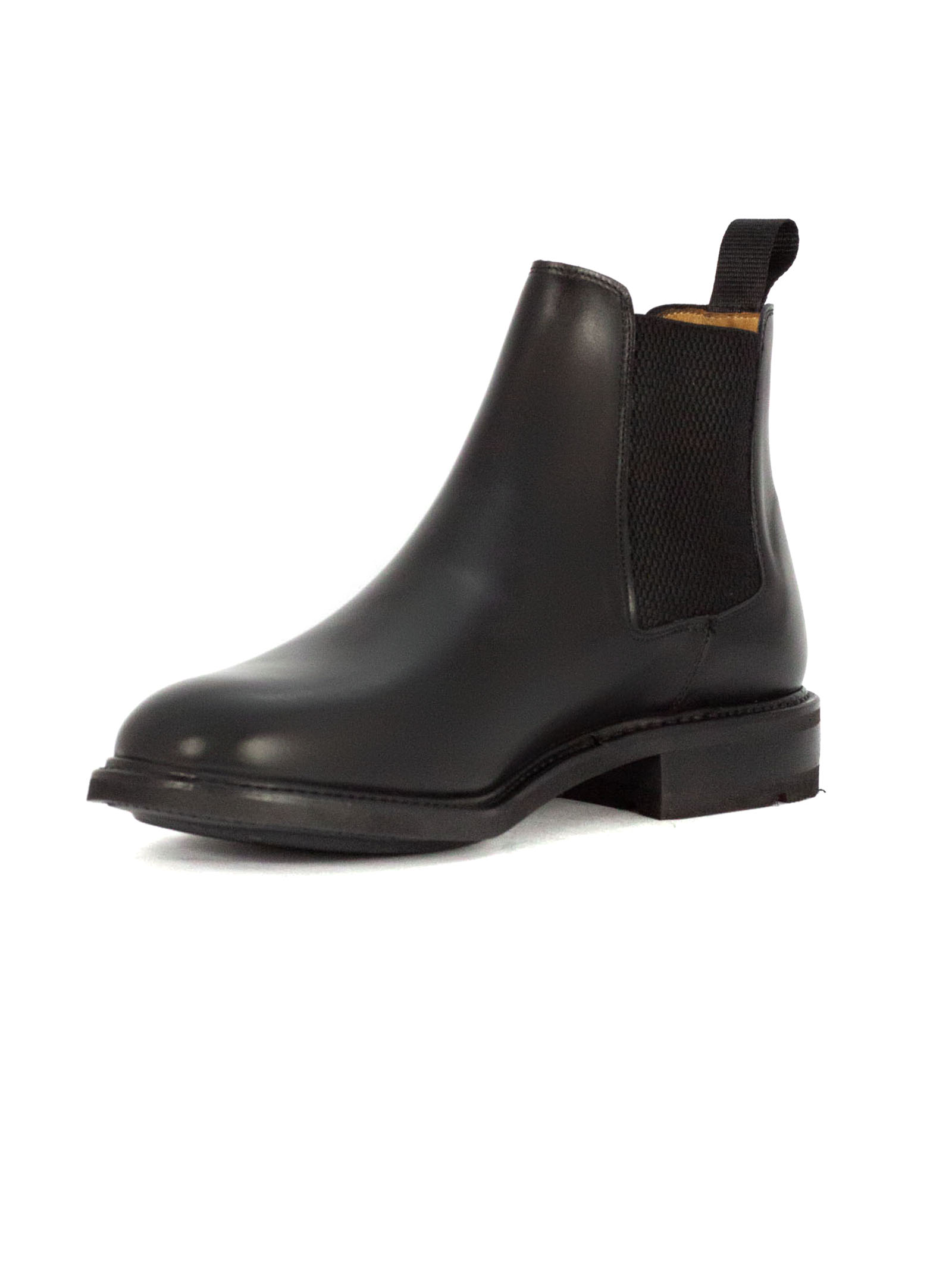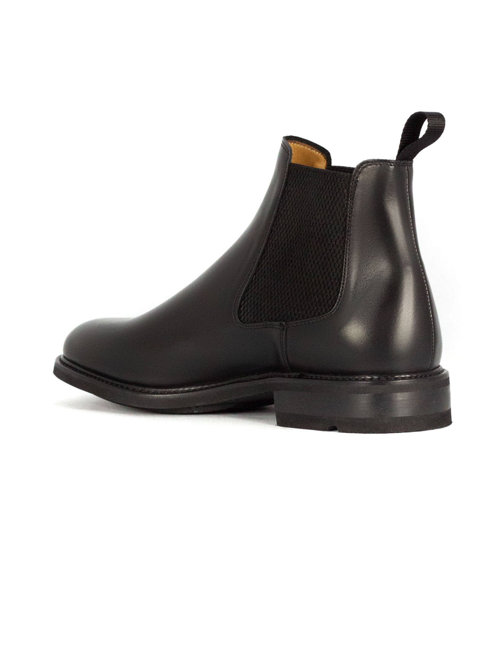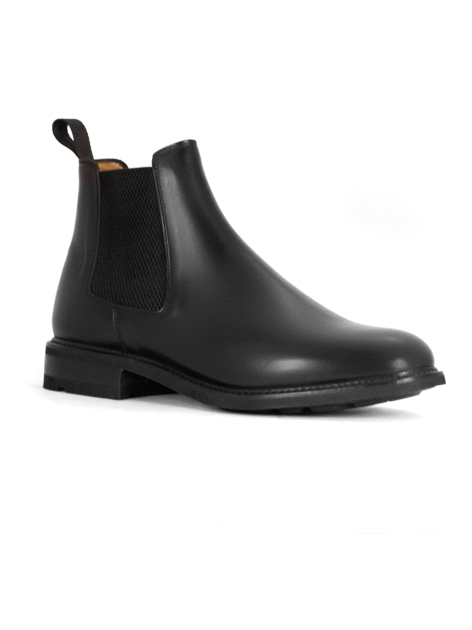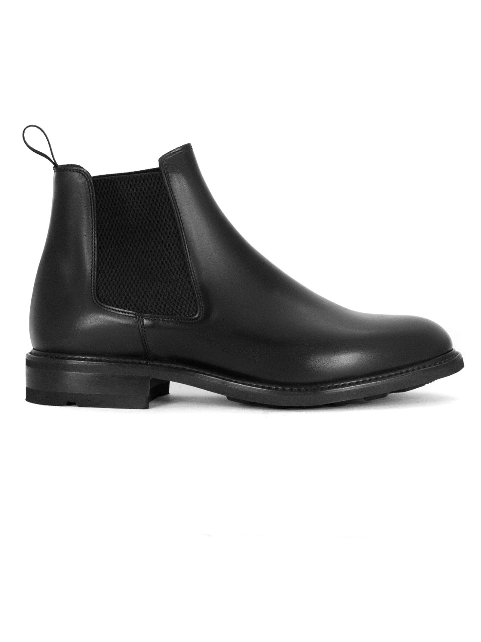 Chelsea boot in French-tanned calfskin leather with Vibram sole, elastic side inserts, Goodyear construction, fabric pull tab at the back
