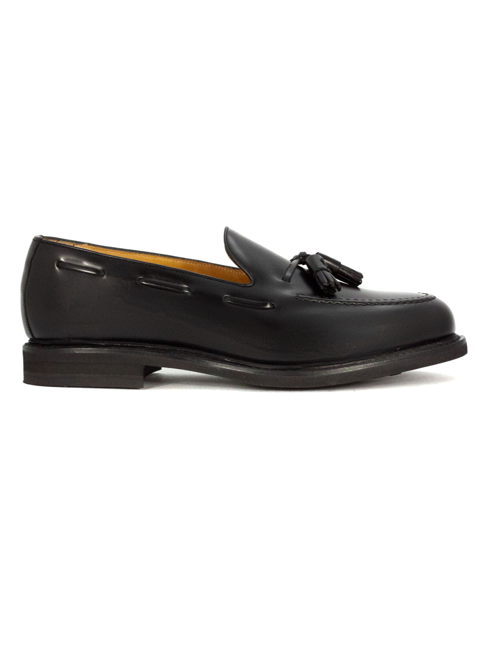 Black leather loafer with tassels, lace-up fastening, leather insole, Dainite sole, Construction: Goodyear Welt