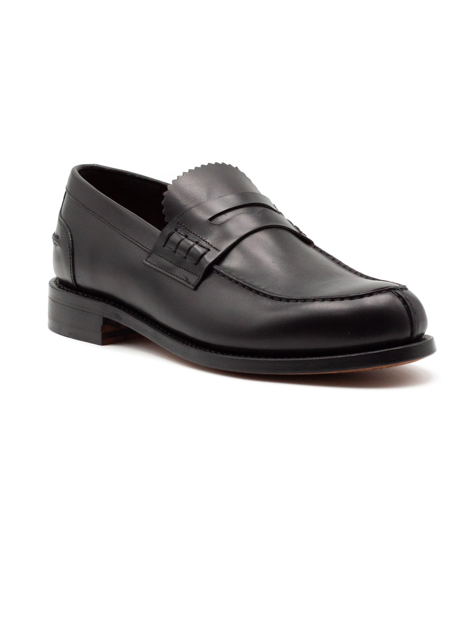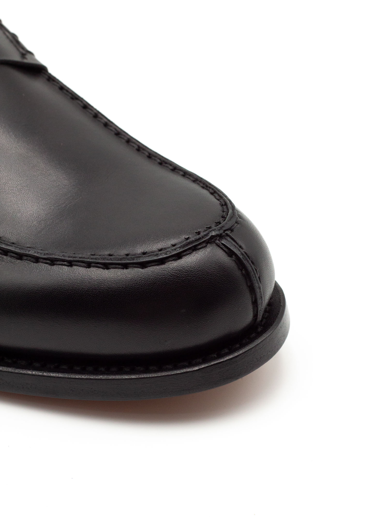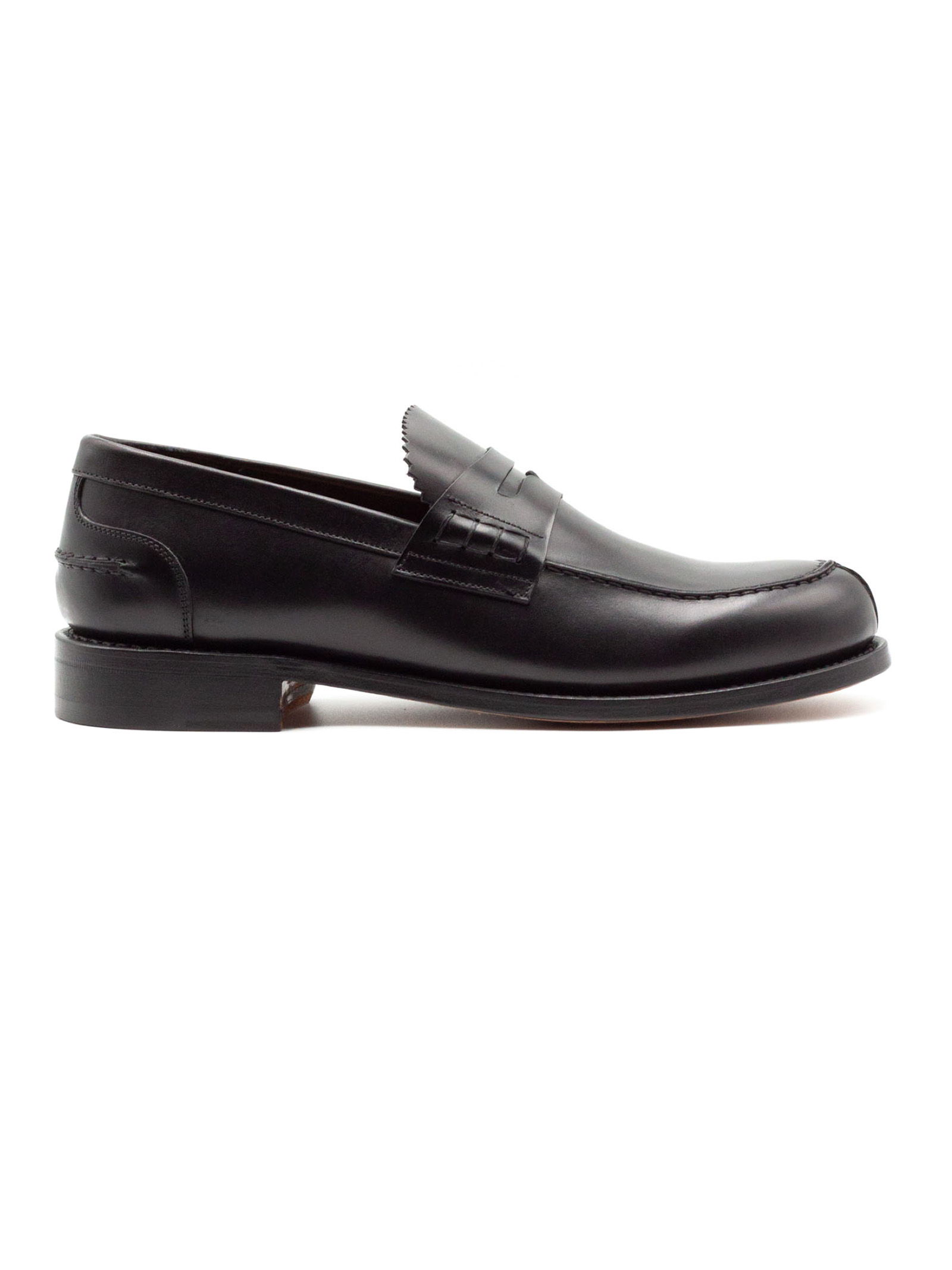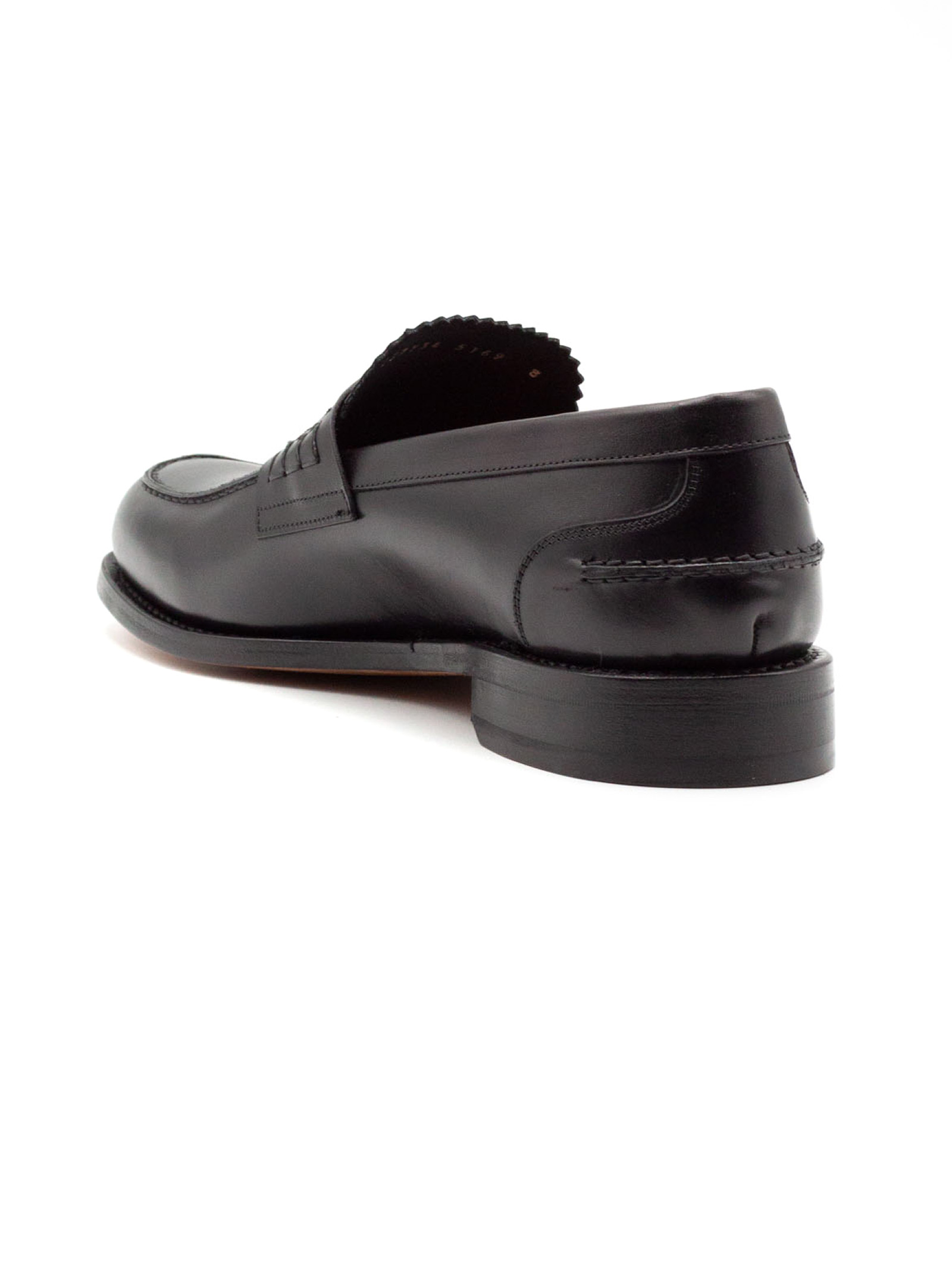 Black leather penny loafers with a smooth, glossy finish, a low leather sole, and Goodyear welt construction