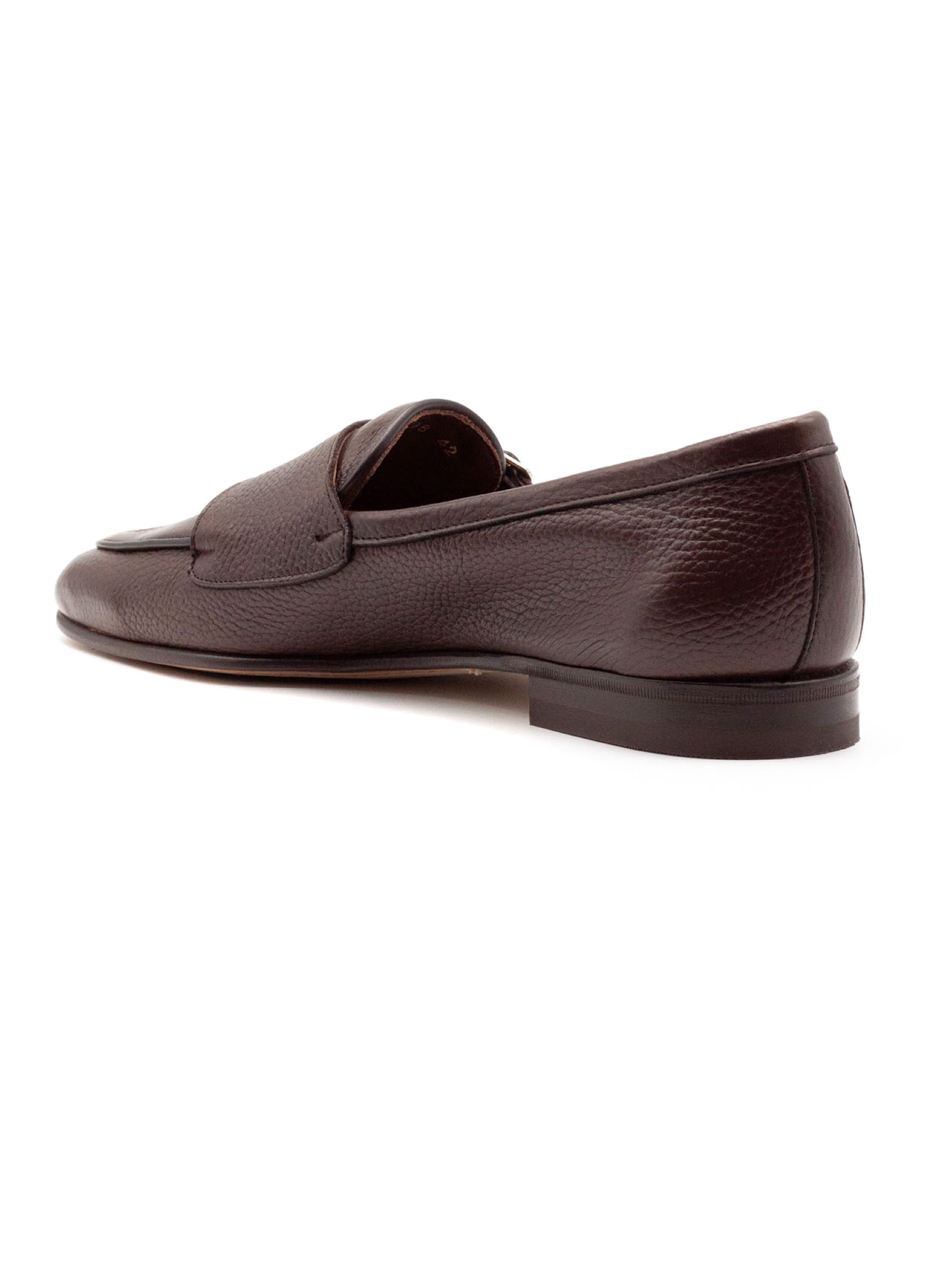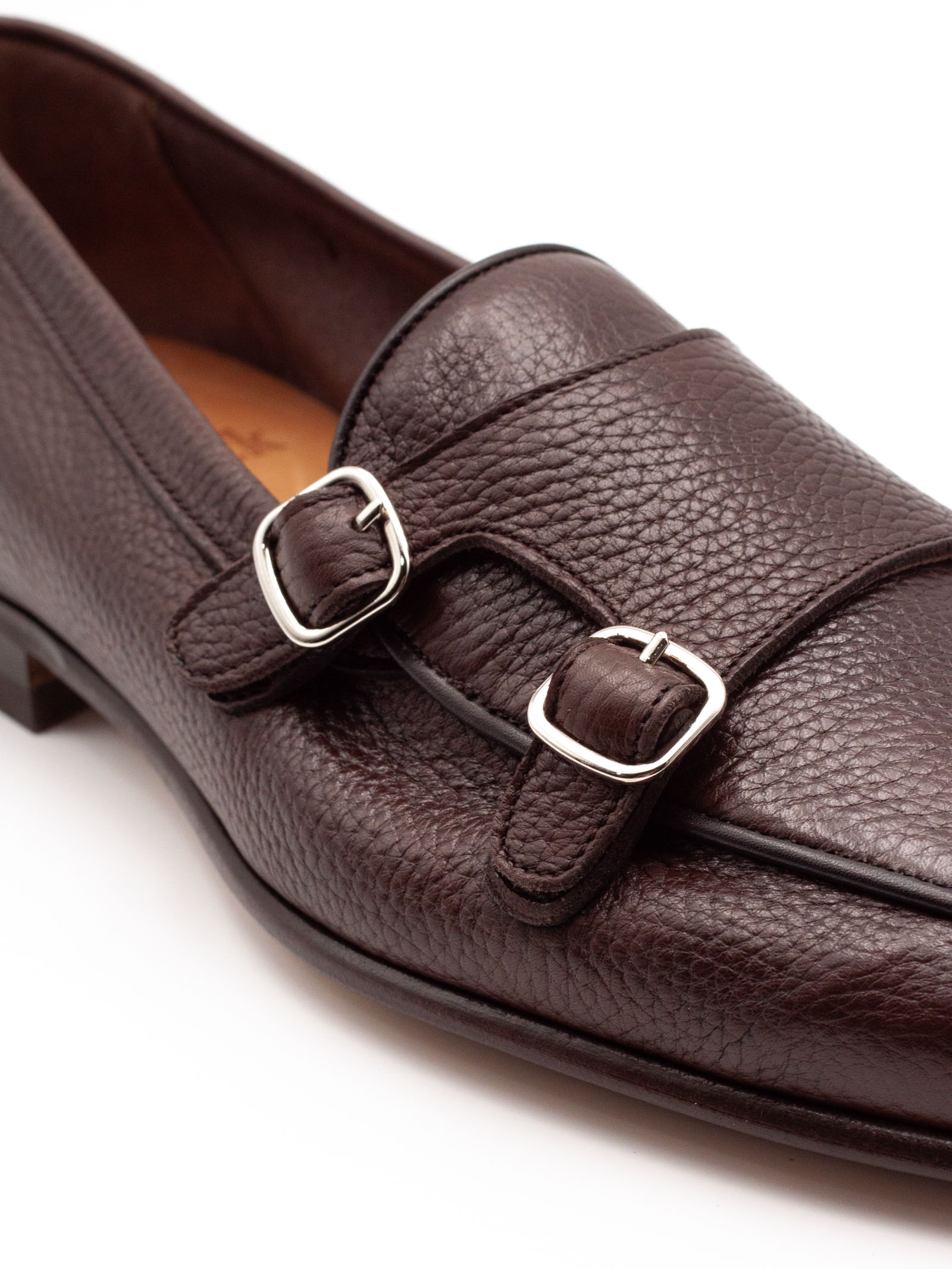 Brown leather double-buckle loafer with a hammered finish and a low leather sole, Goodyear welt