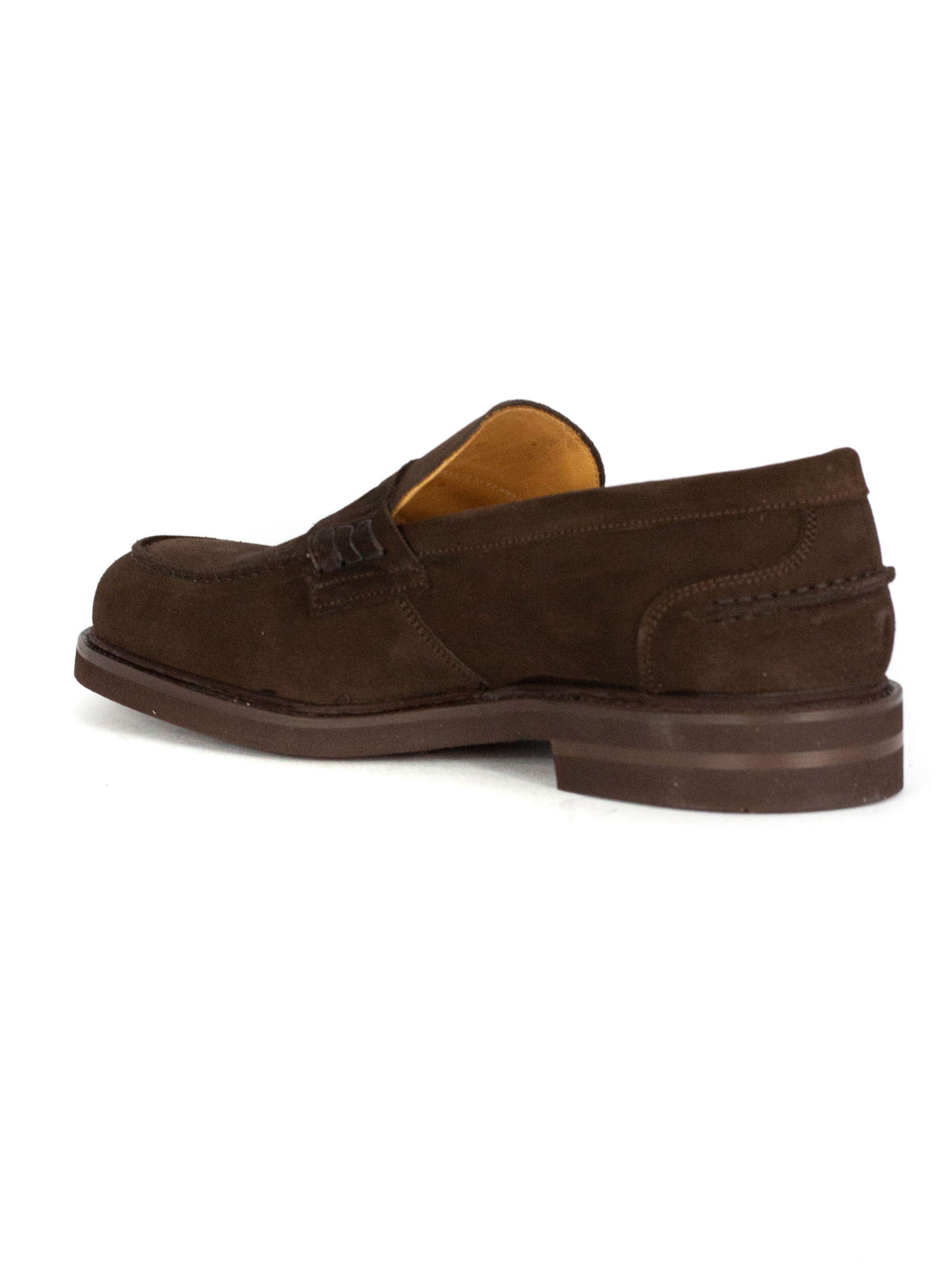 Brown suede loafer with mask, leather insole with logo, Goodyear construction, rubber sole
