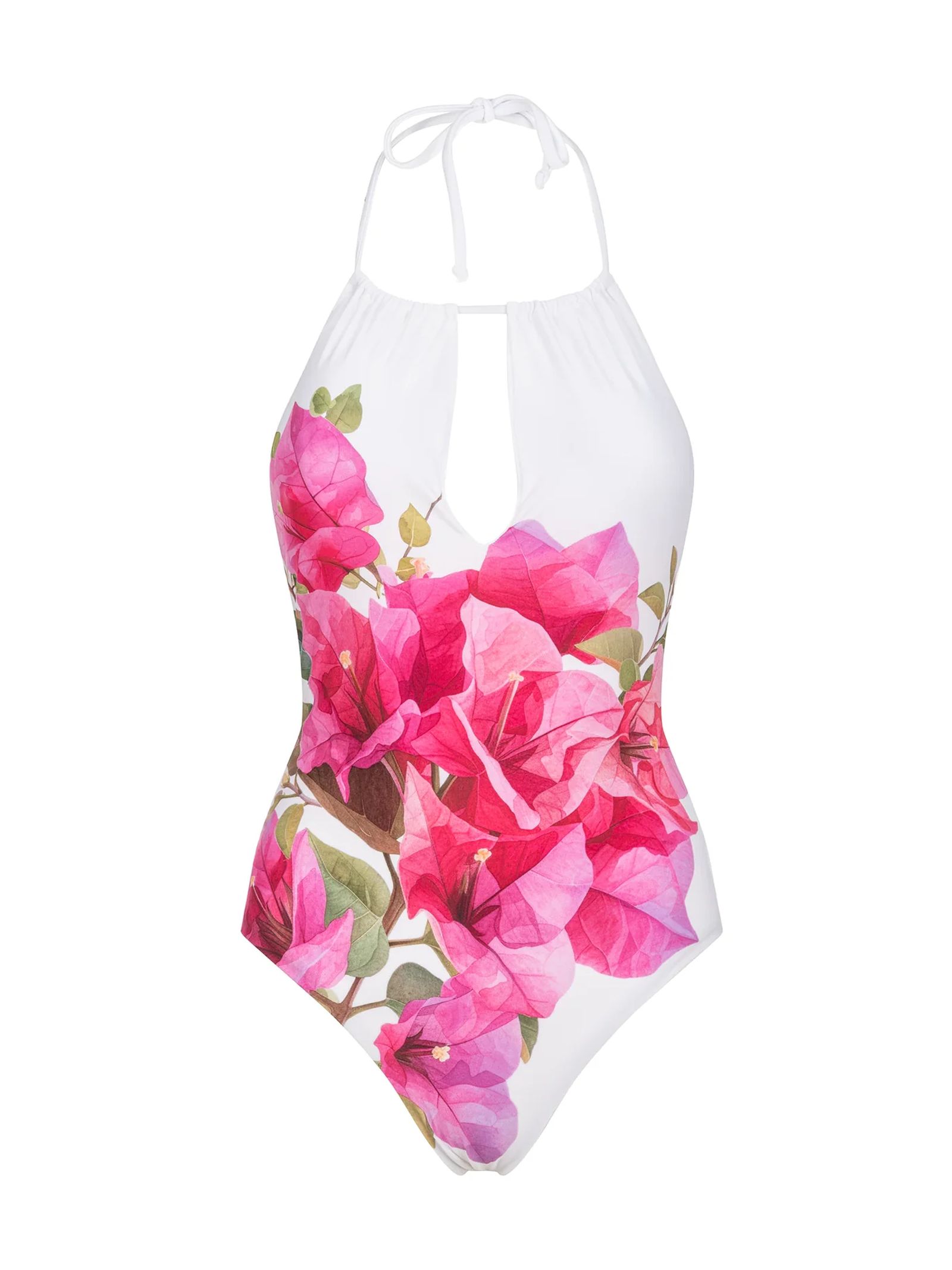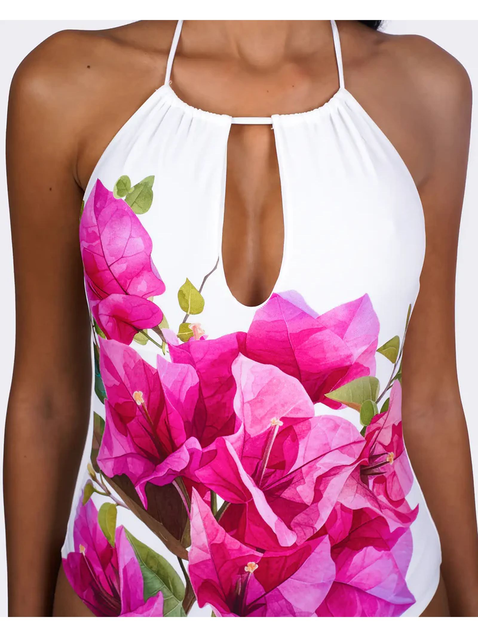 Bouganvillea Bliss Drawstring One-Piece Swimsuit, Premium double-layer Italian fabric, UPF 50+ sun protection, Removable cups, Medium coverage, Adjustable neck tie, Shaping and comfortable fit, Lightweight, breathable, and quick-drying, Limited edition, 80% nylon, 20% spandex