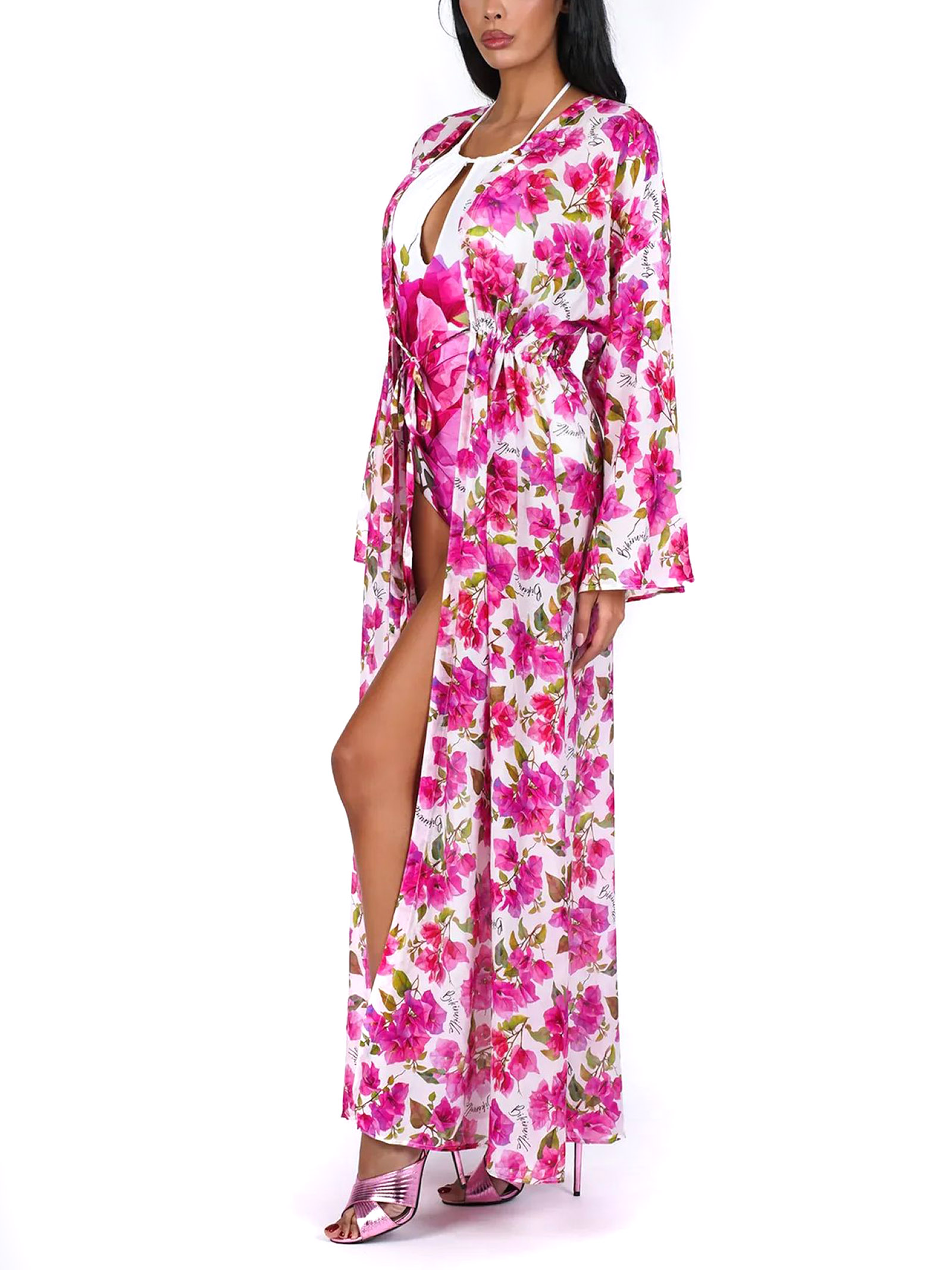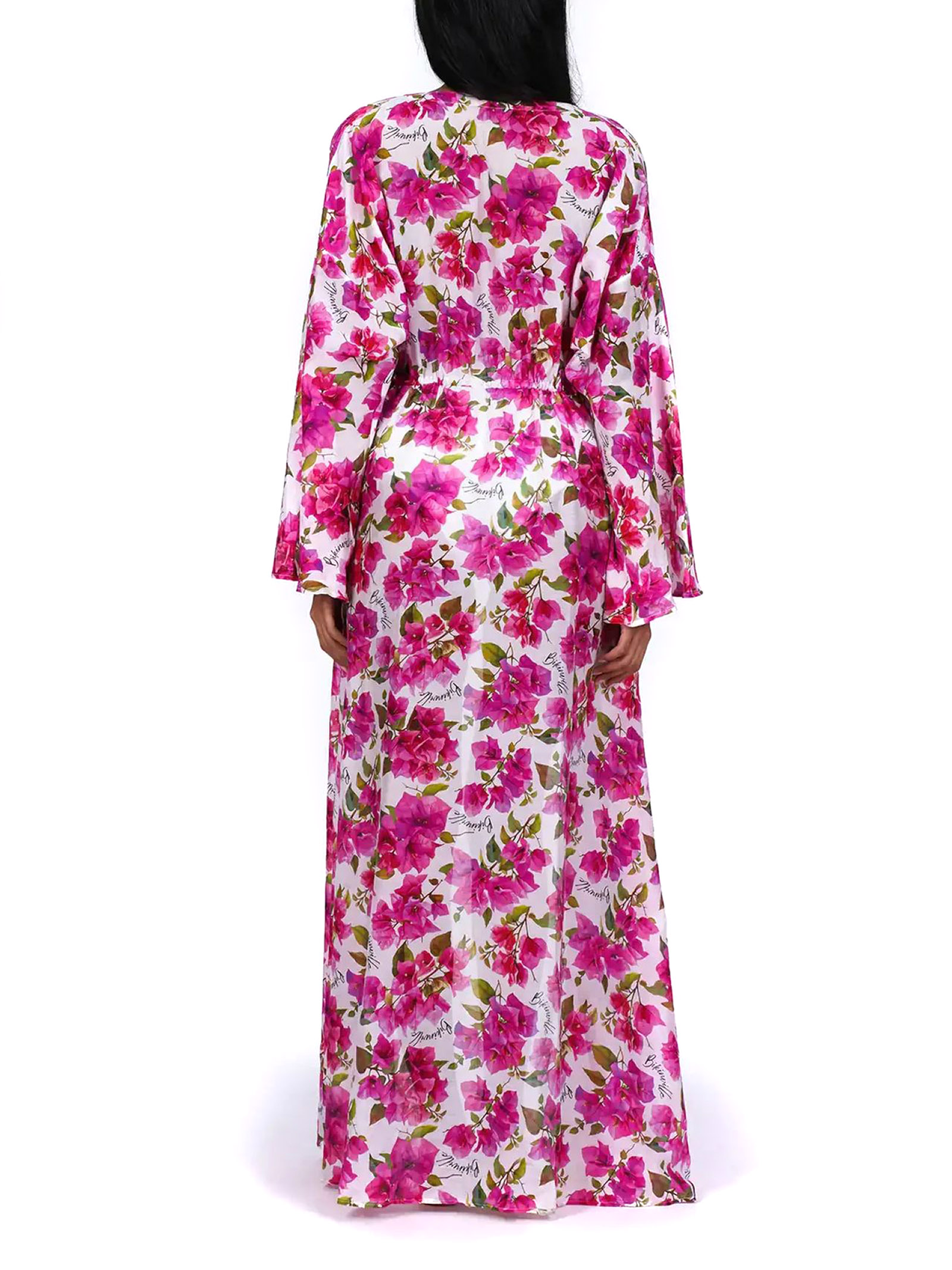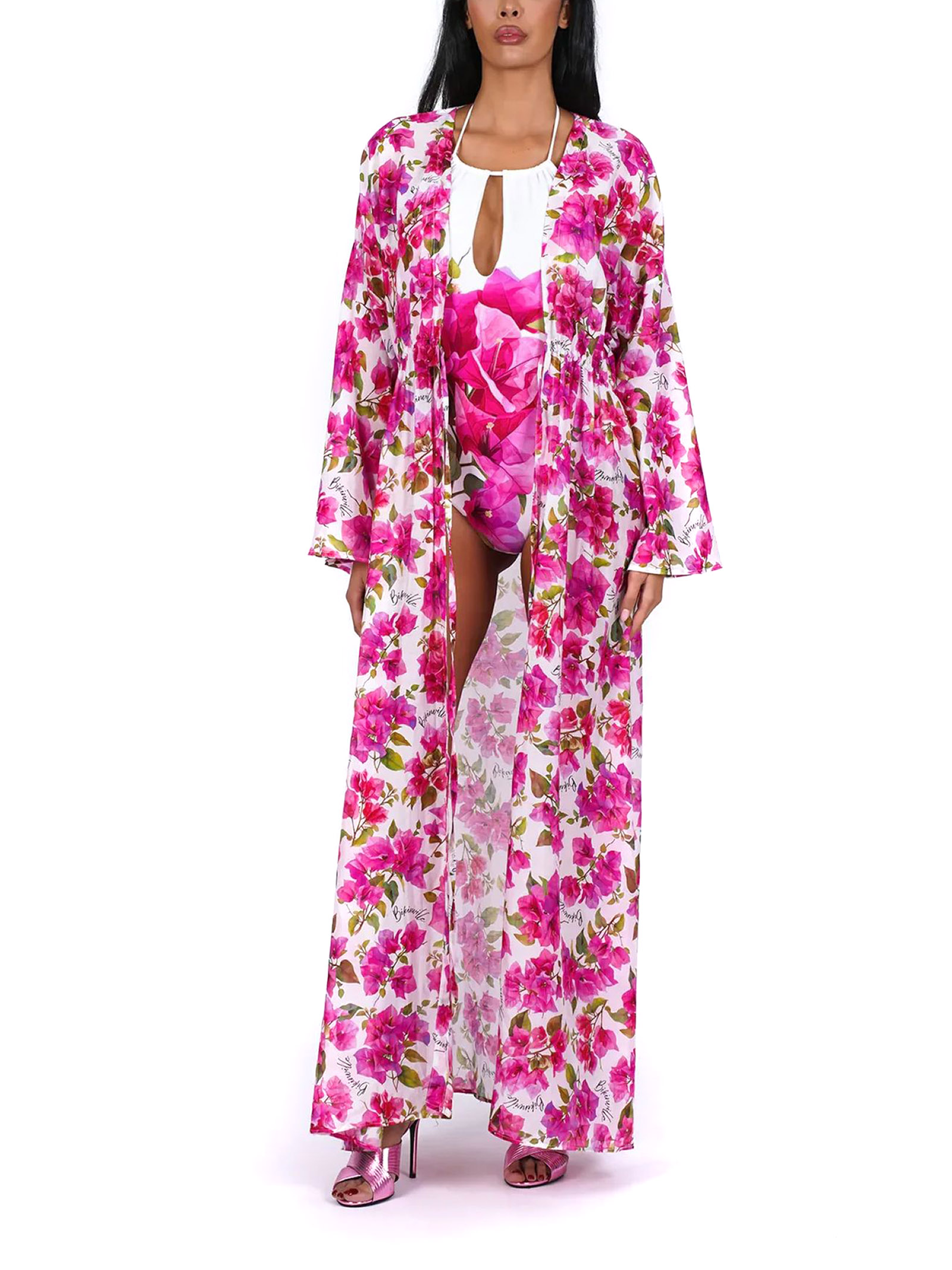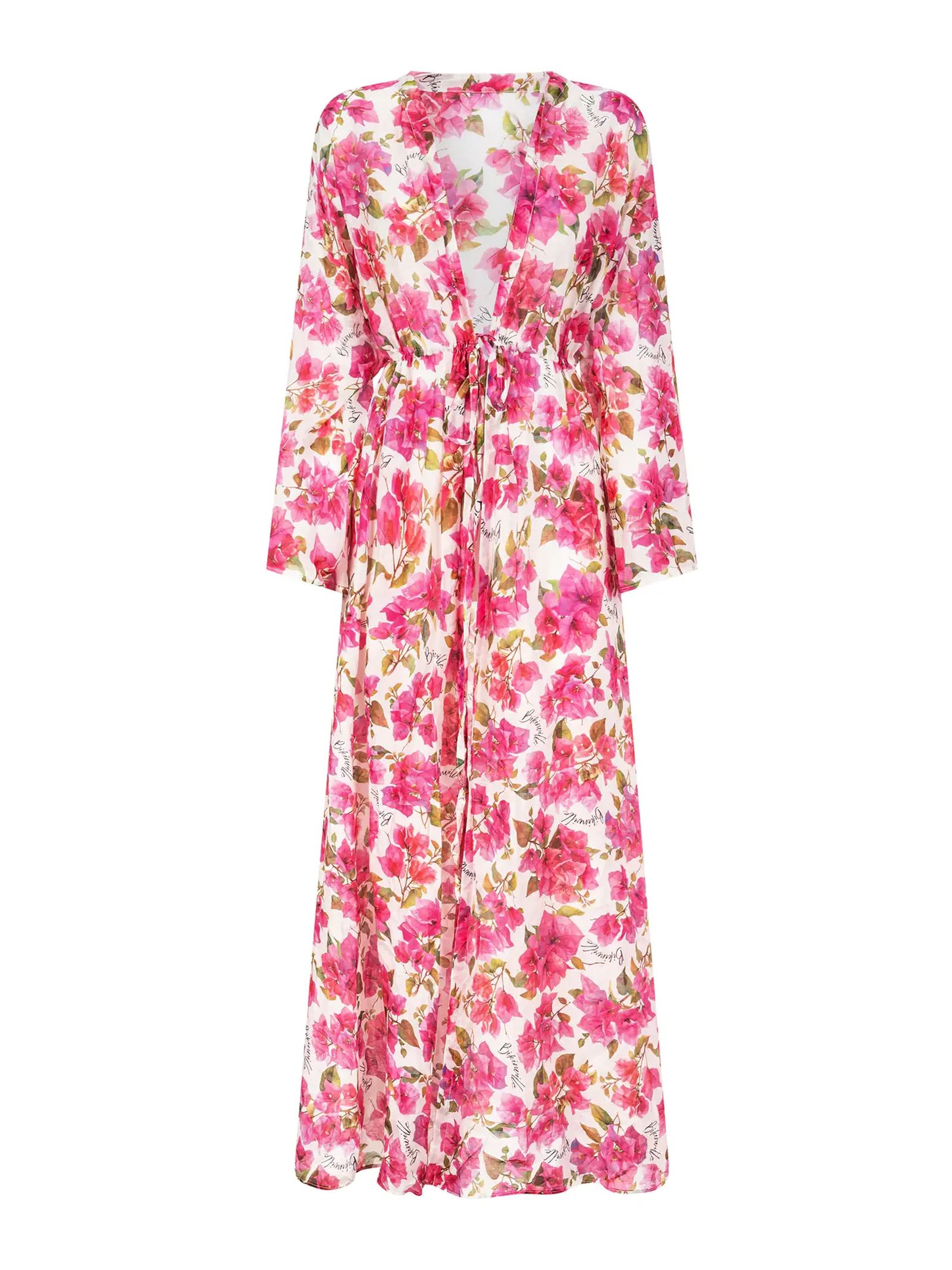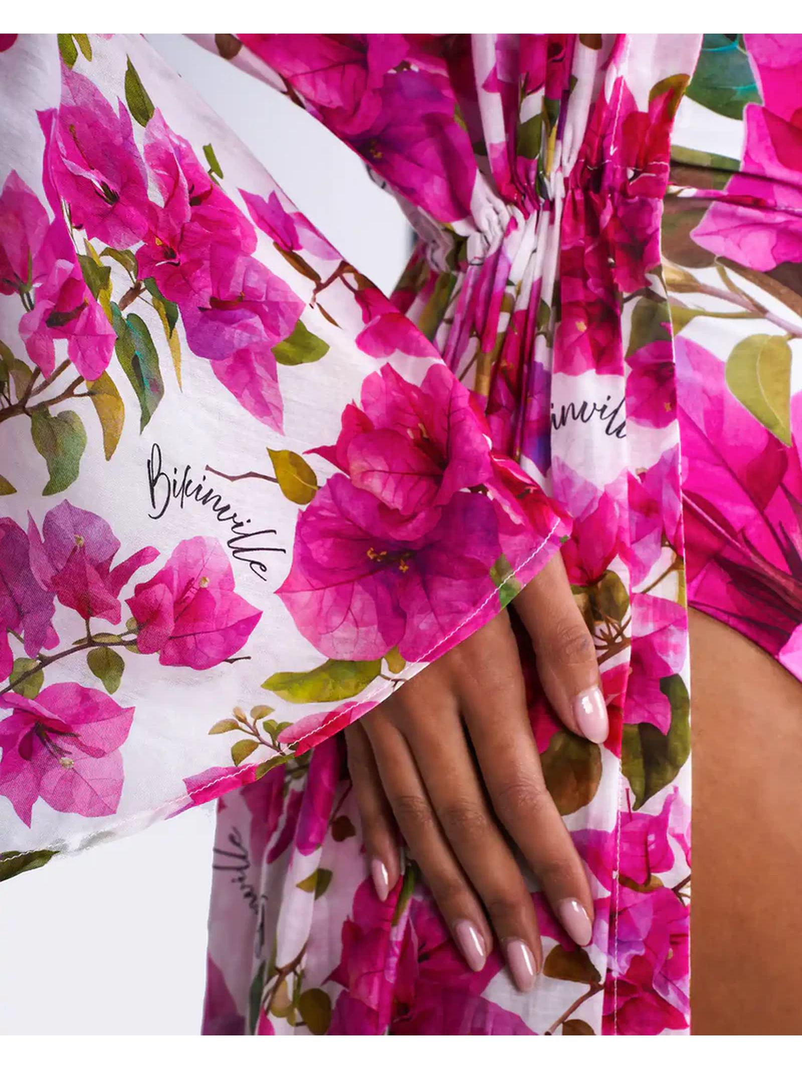 Bouganvillea Bliss Kaftan, Cotton-silk blend, natural and breathable fabric, Lightweight and airy, Extremely soft against the skin, Exclusive bougainvillea print, Adjustable waist, Flowing sleeves, Romantic and feminine design, 78% cotton, 12% silk