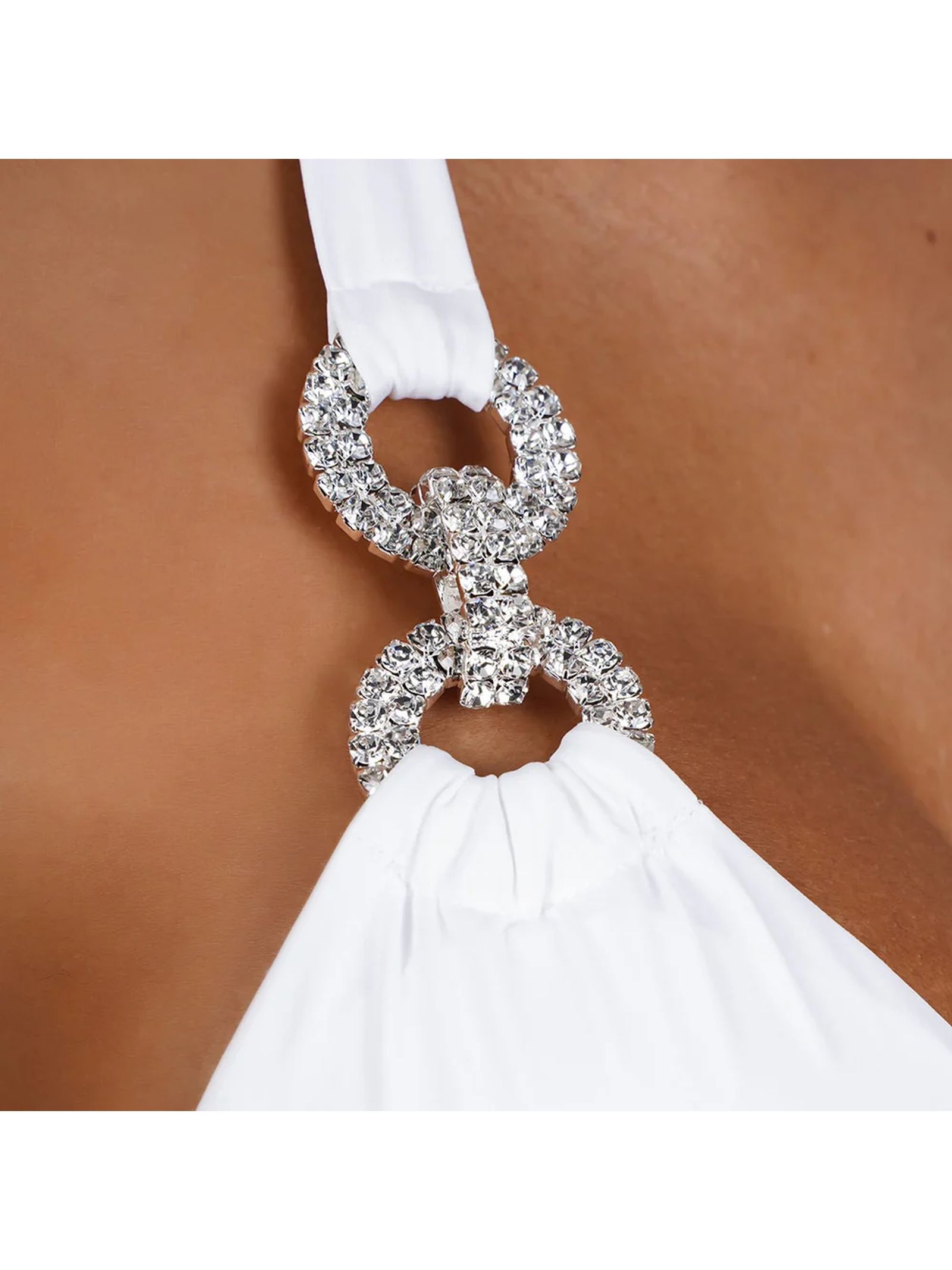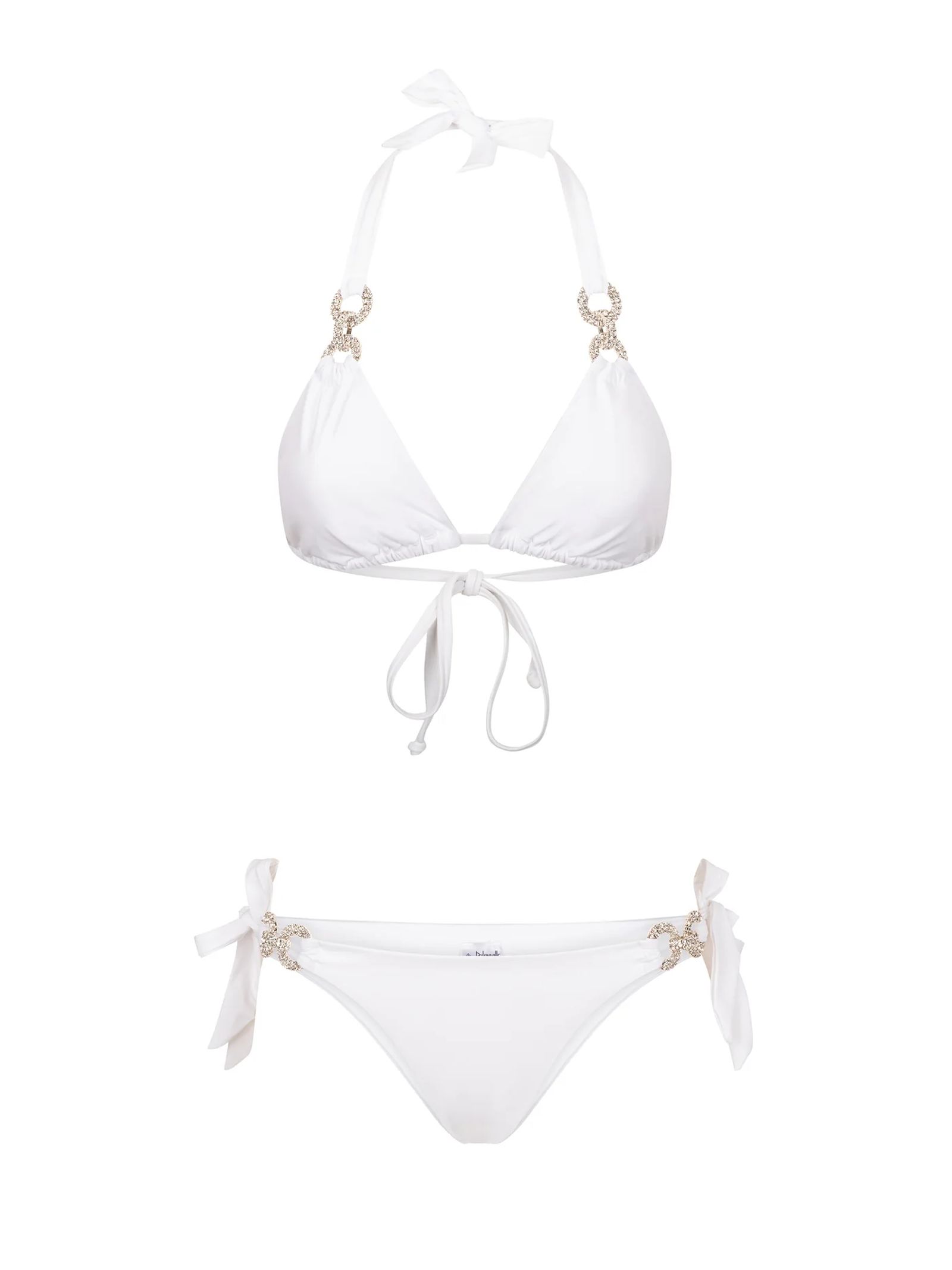 Leonie White Crystal Bikini, double-layer Italian fabric for enhanced comfort and coverage, adjustable triangle top with removable padding for a custom fit, bottoms with side ties that flatter the silhouette, Preciosa® crystals resistant to chlorine, salt, and heat, quick-drying fabric with UPF 50+ sun protection, 80% nylon, 20% spandex