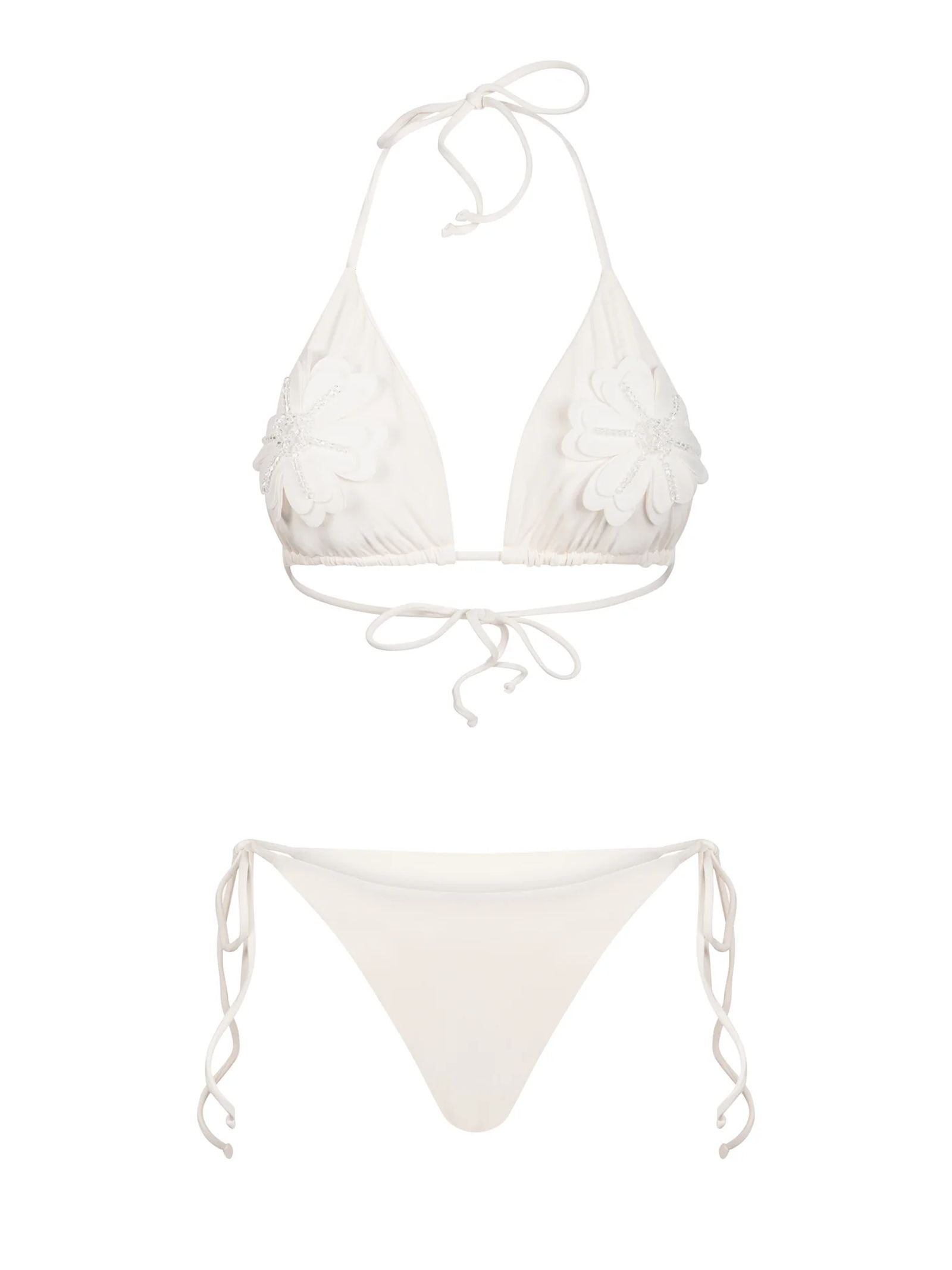Marzia Petunia Cloud Dancer Bikini, Double-layer Italian fabric for comfort and coverage, Adjustable triangle top with removable padding, Bottom with side ties for a flattering fit, Hand-embroidered floral appliqués, Quick-dry fabric with UPF 50+ sun protection, 80% nylon, 20% spandex