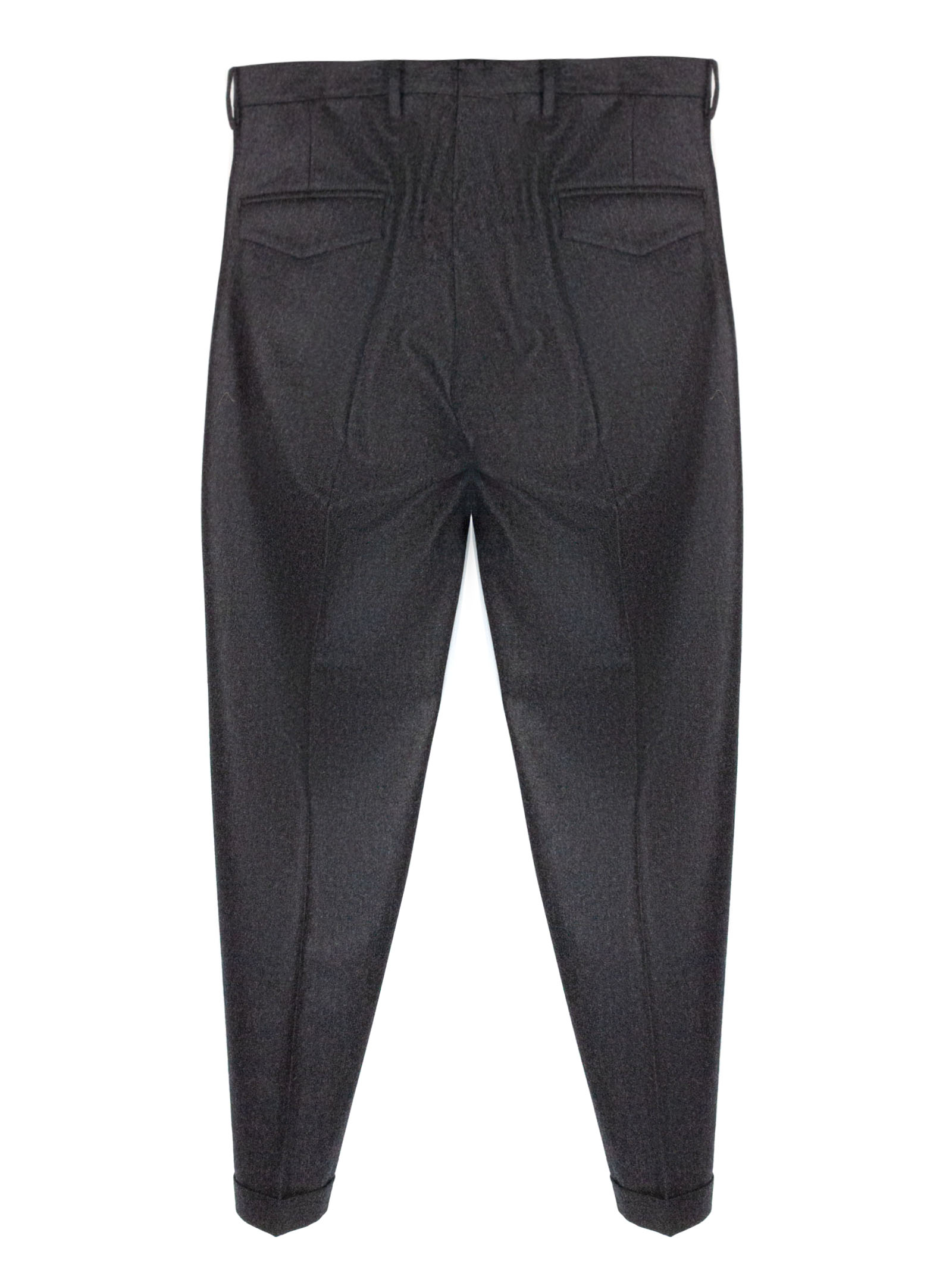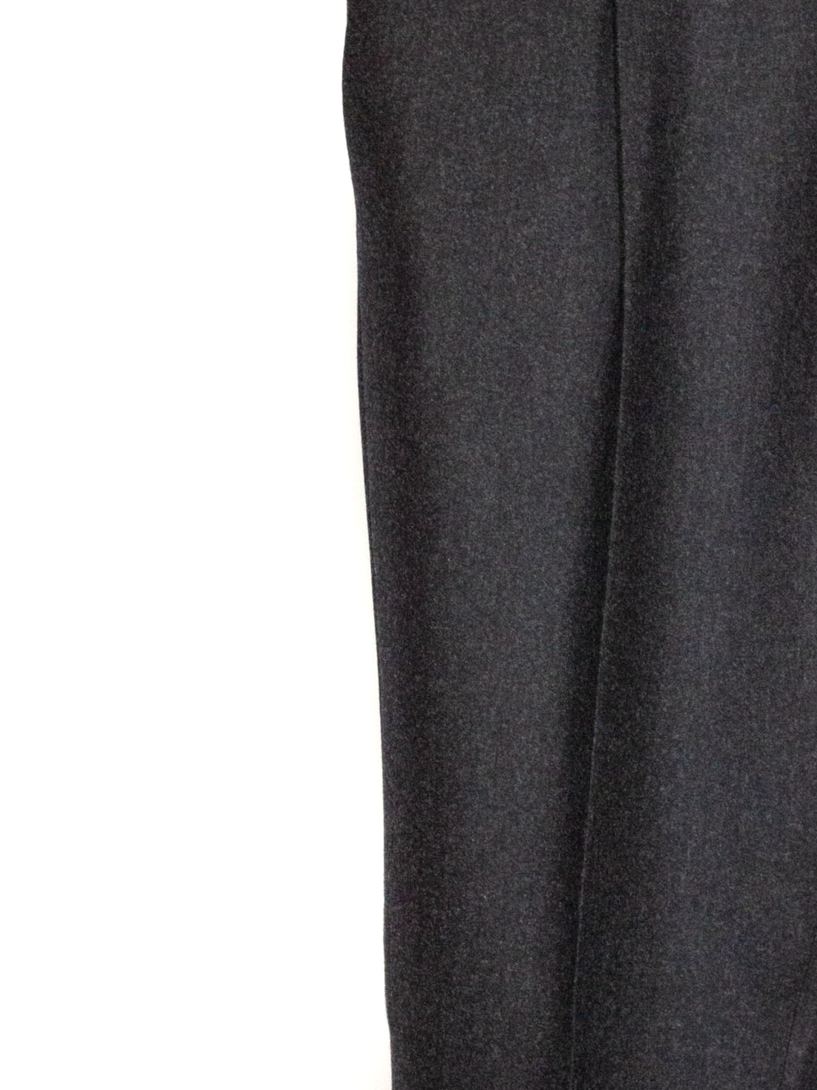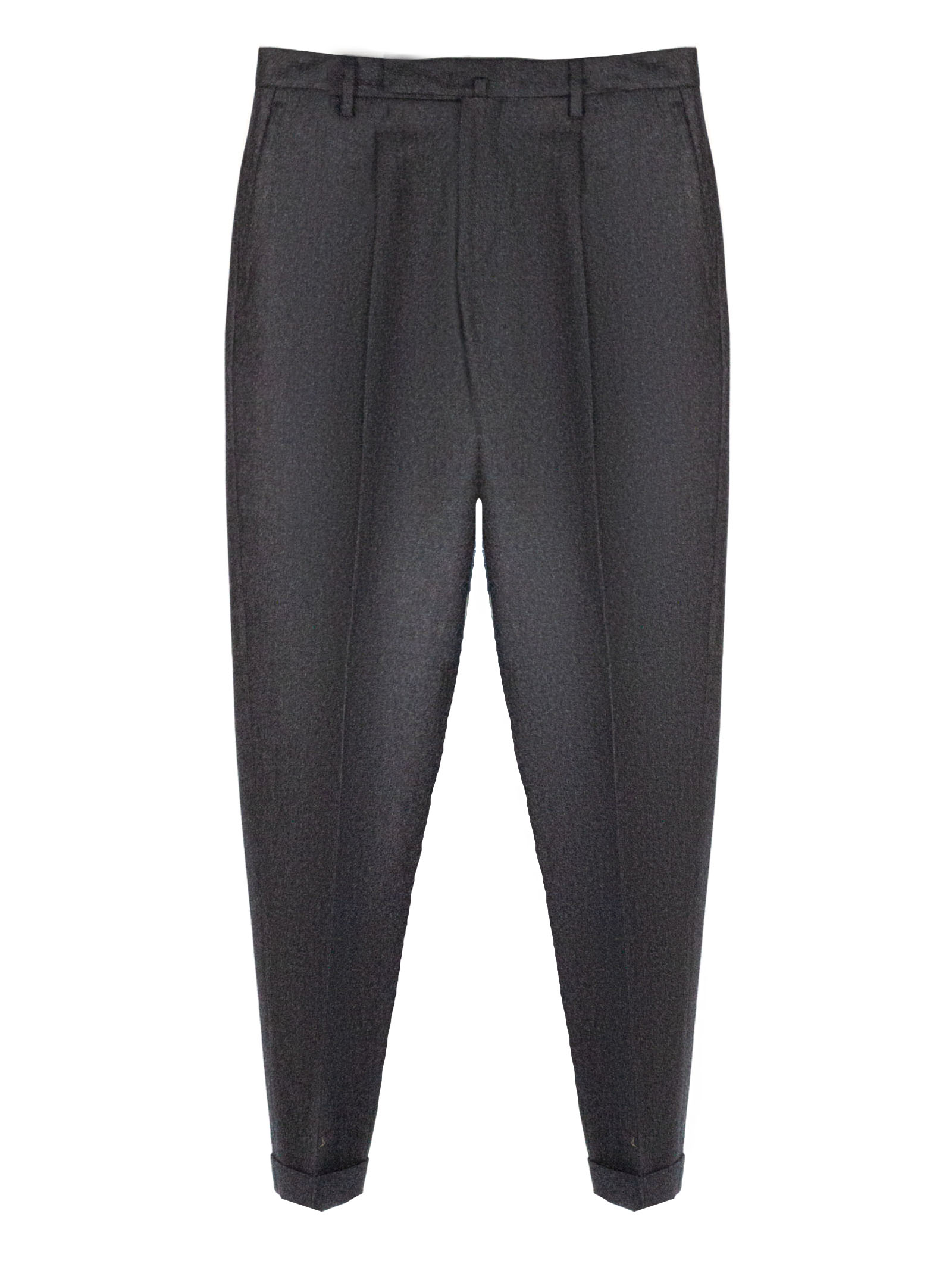 Dark gray virgin wool trousers, tailored style, model with pleats and center crease, belt loops, cuffs at the bottom, front closure with button and zipper.