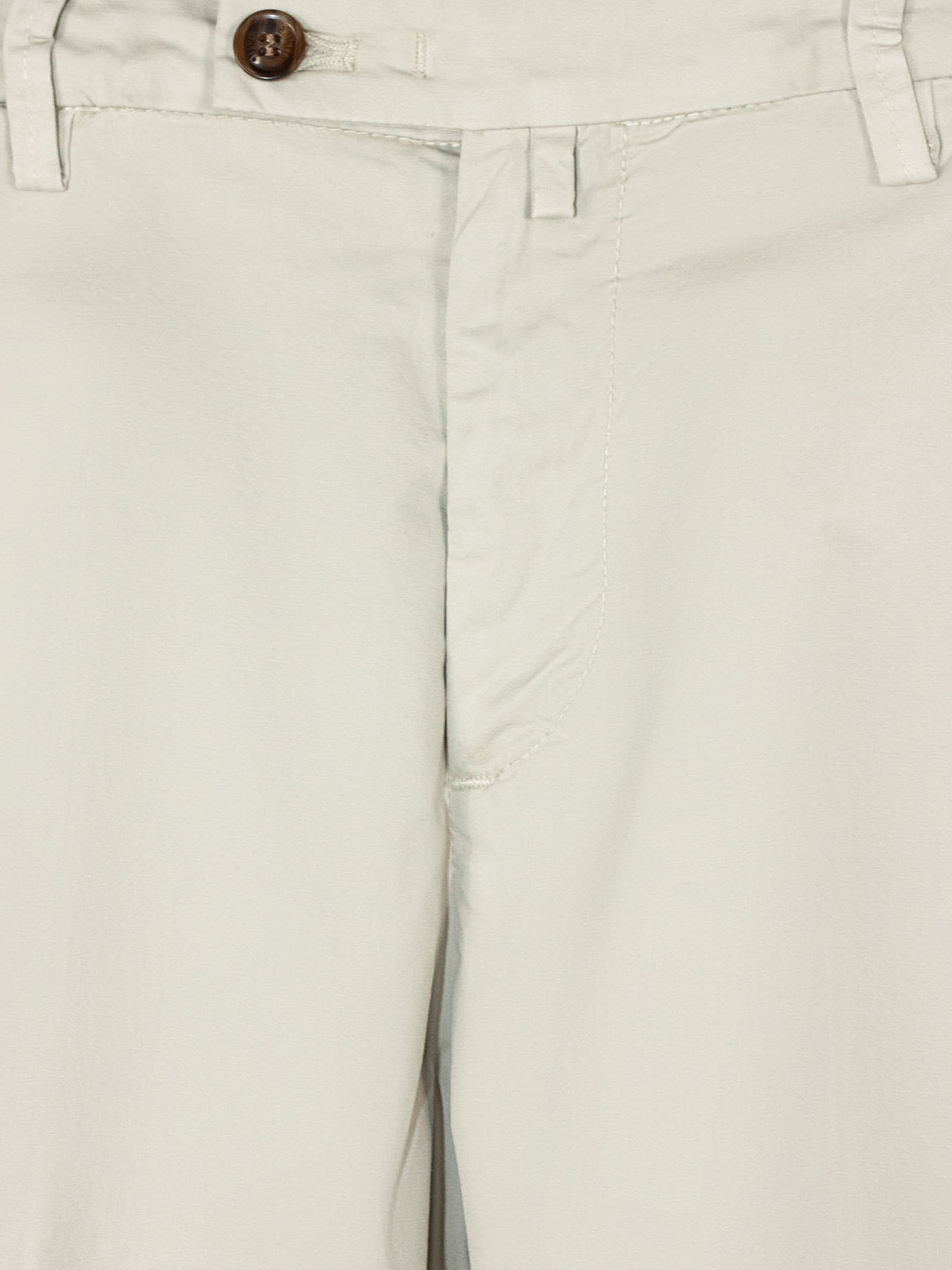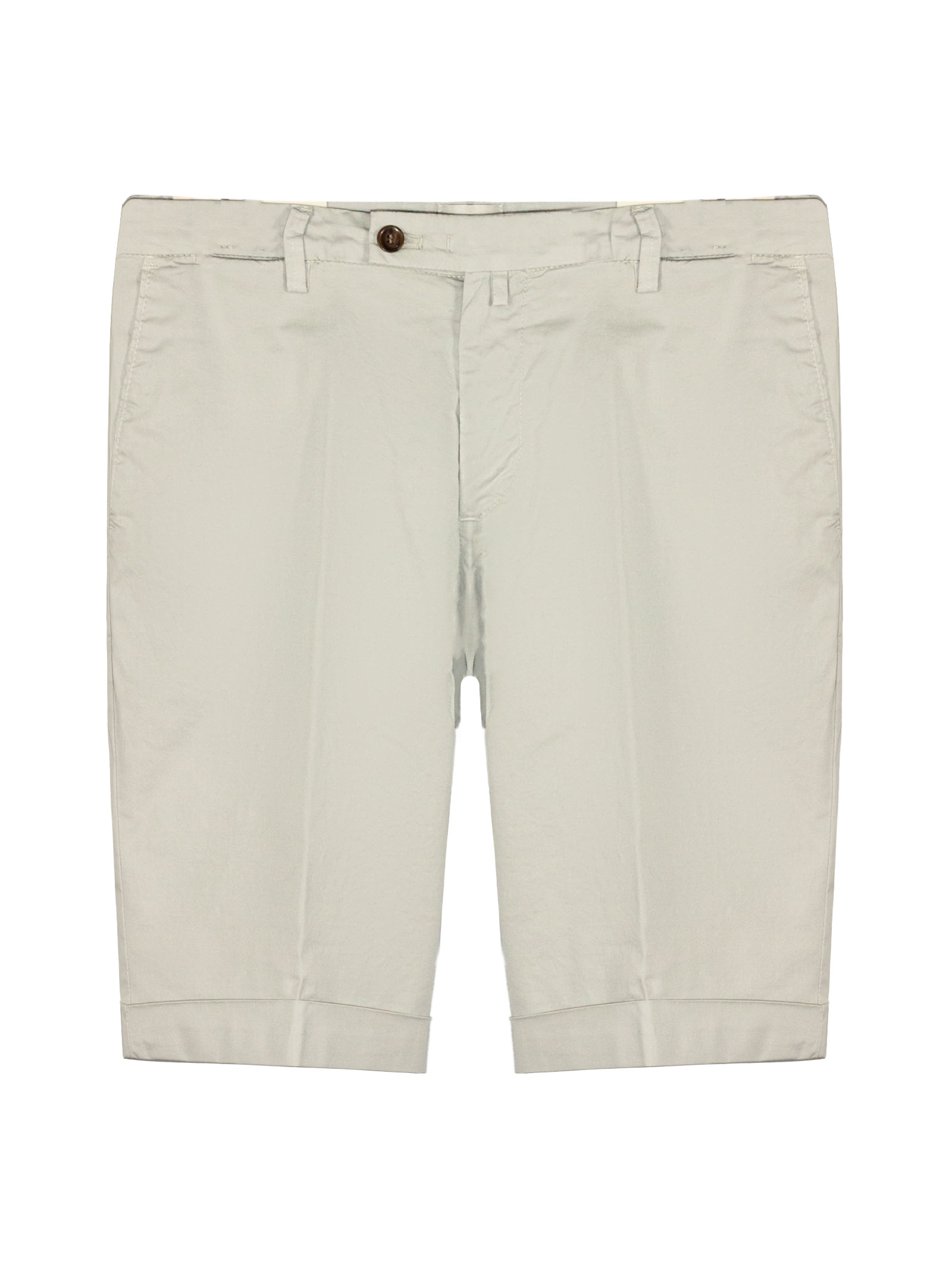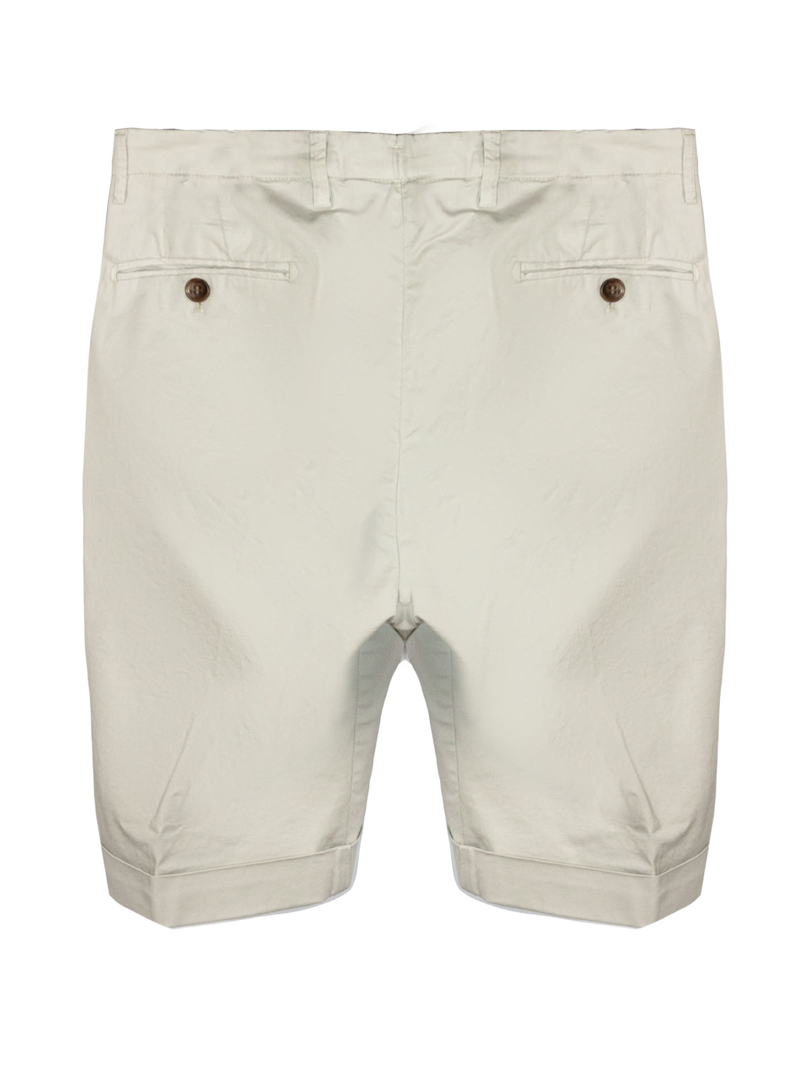 Light beige cotton Bermuda shorts with belt loops, front zip and button closure, side pockets, and back pockets with buttons