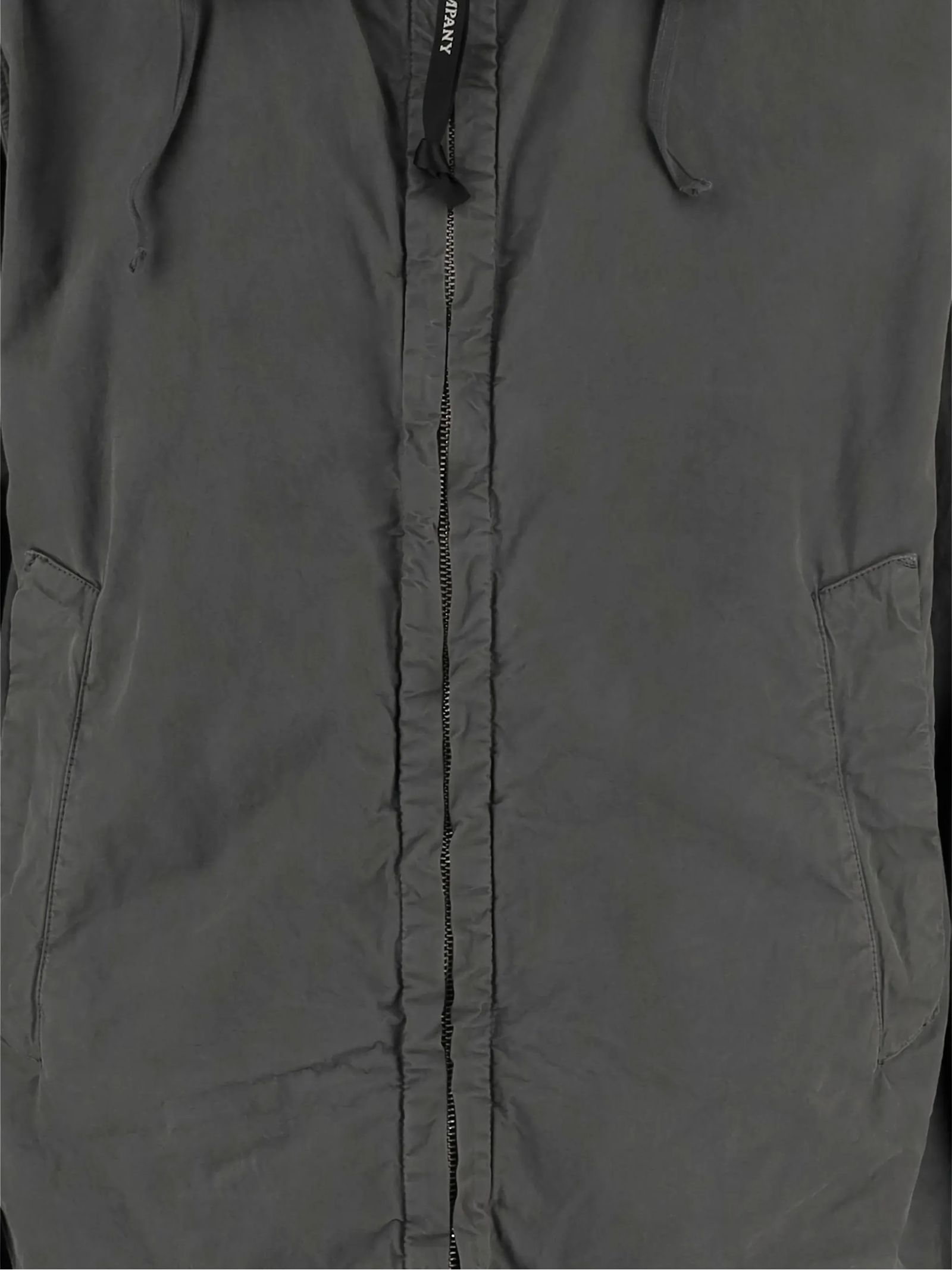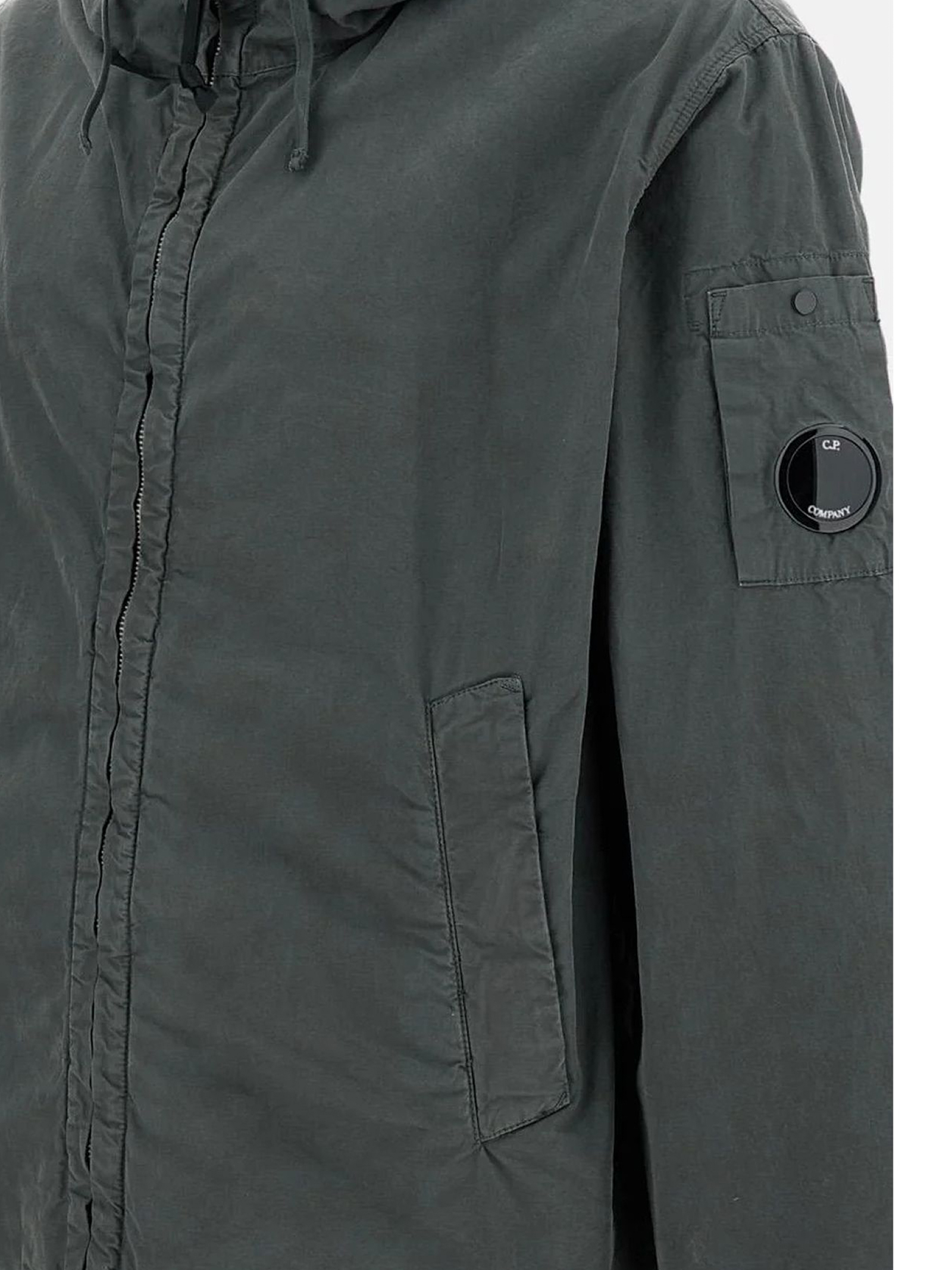 Gray cotton Jacket with a high collar, a fixed hood adjustable with a drawstring, a front zipper closure, two side pockets, long sleeves, and buttoned cuffs